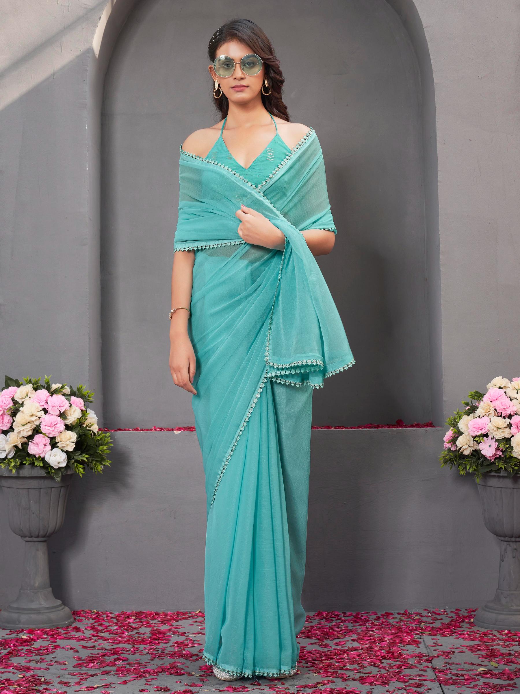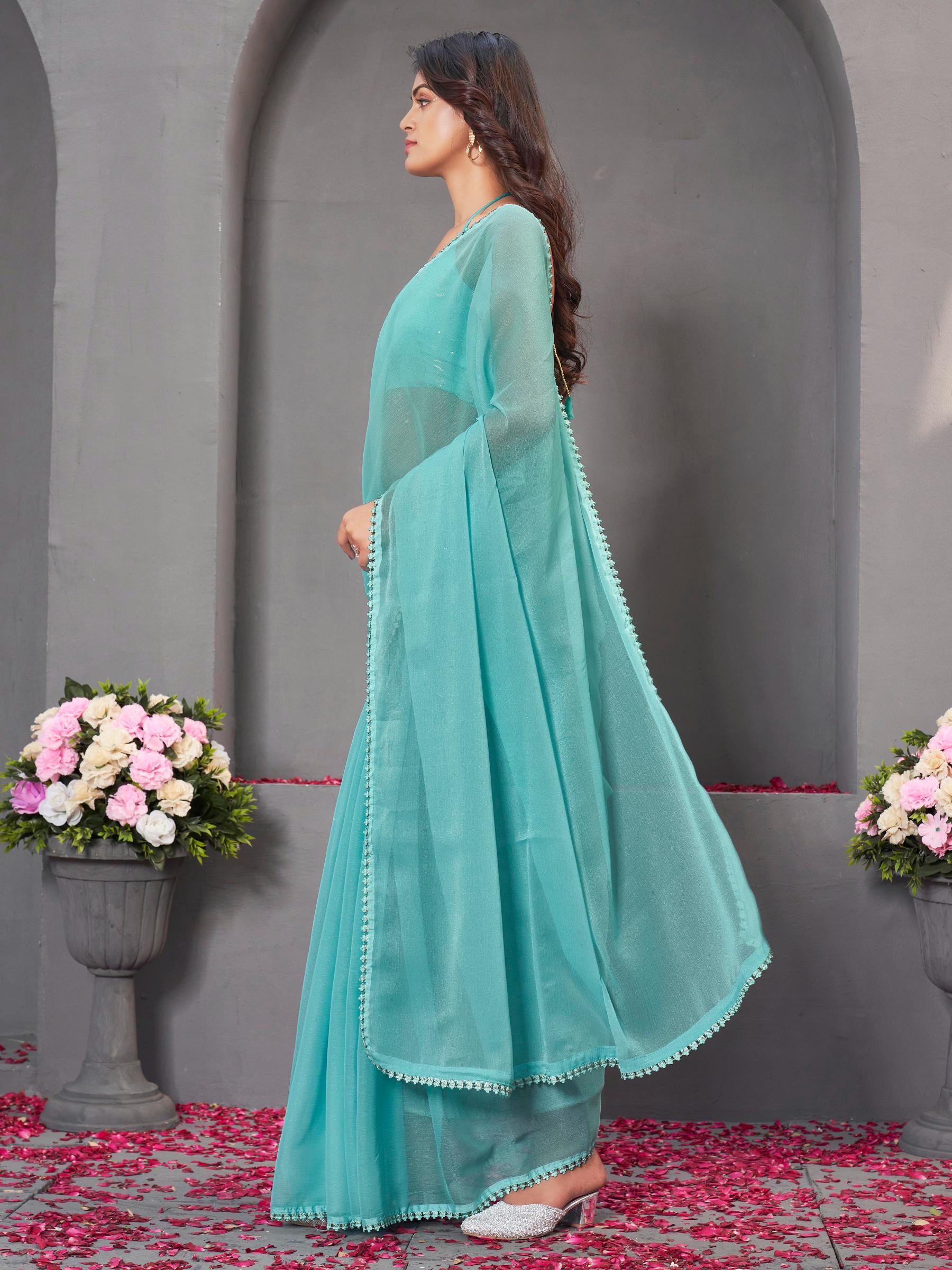 Blue colored chiffon saree with embellished lace and brocade blouse