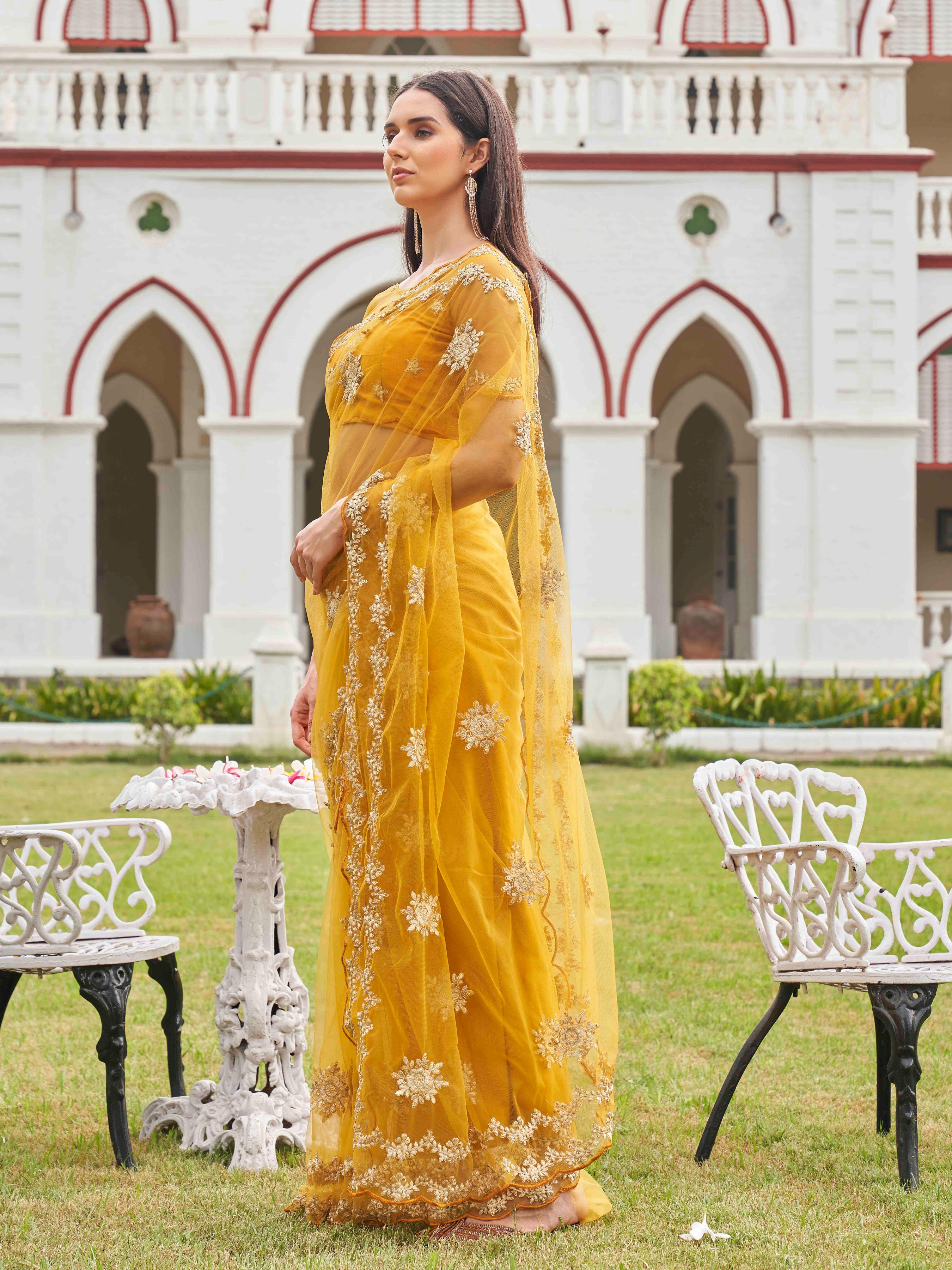 Mustard colored net saree with thread work scalloped border and faux diamonds