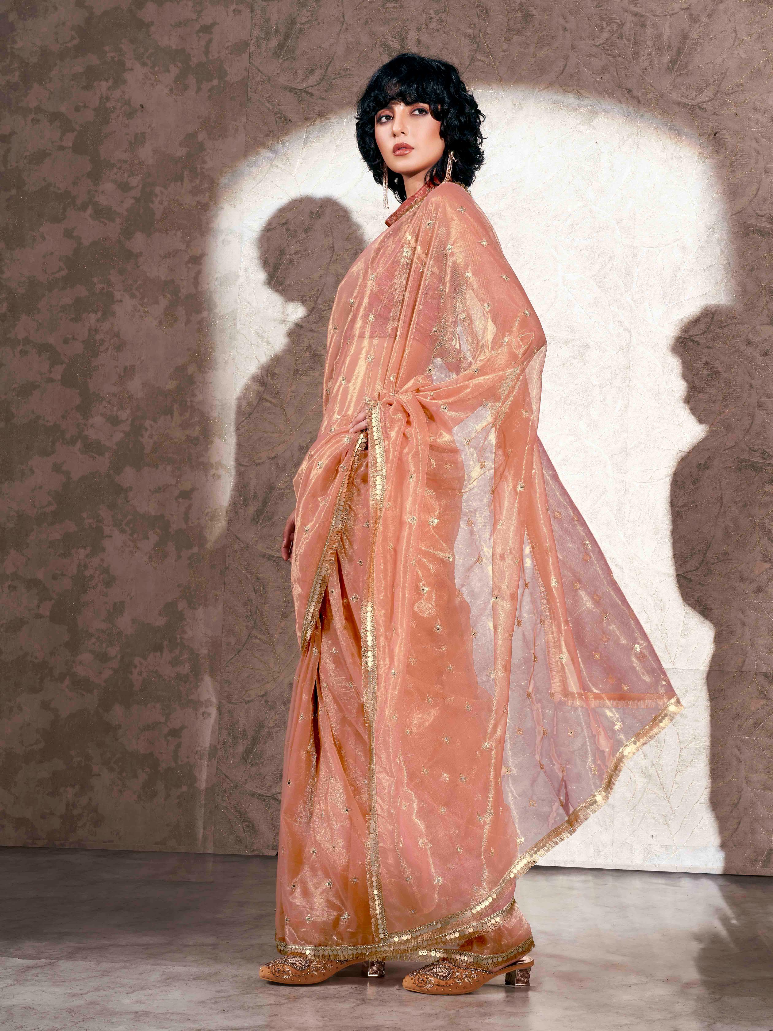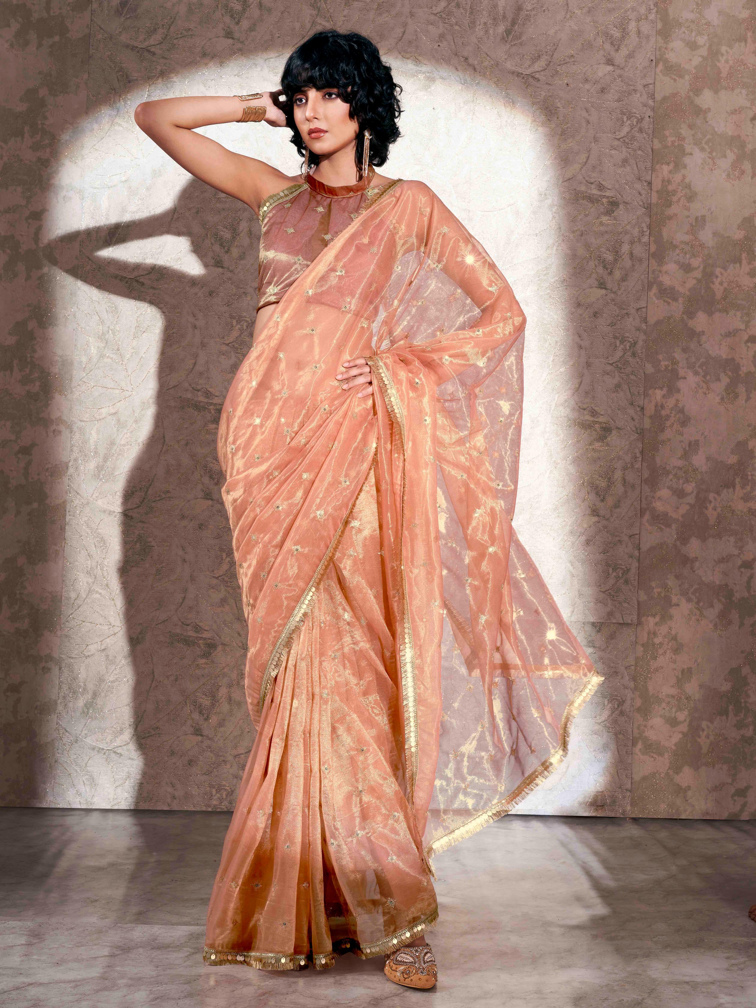 Peach colored shimmer net saree with sequence embroidery and sequinned tassle lace
