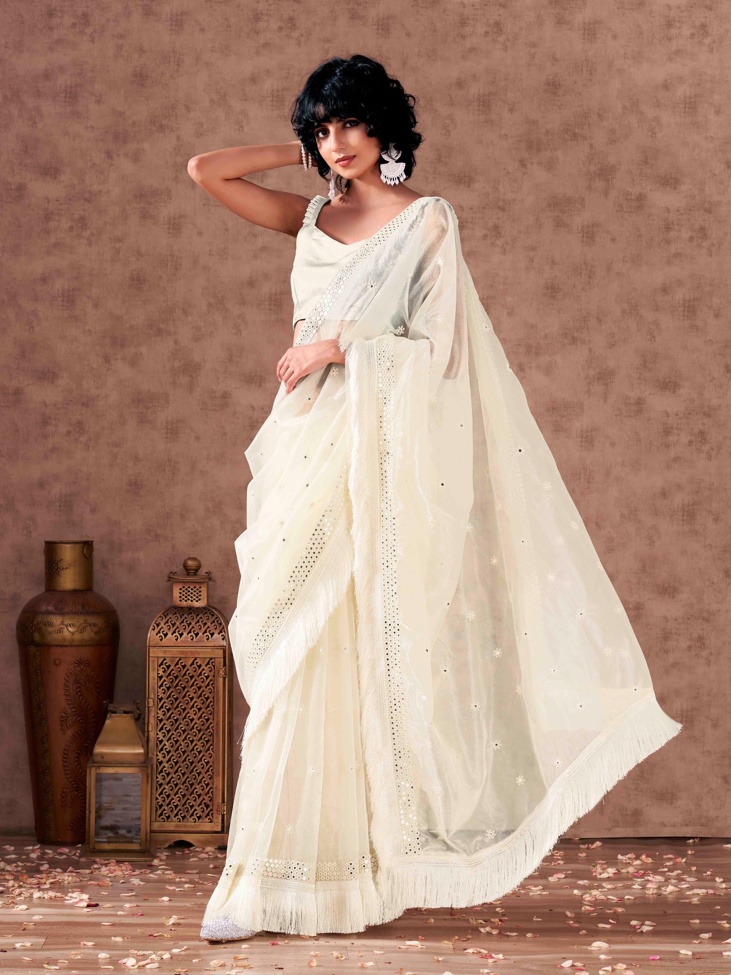 Off white colored supernet saree with faux mirror embroidery and tassles lace