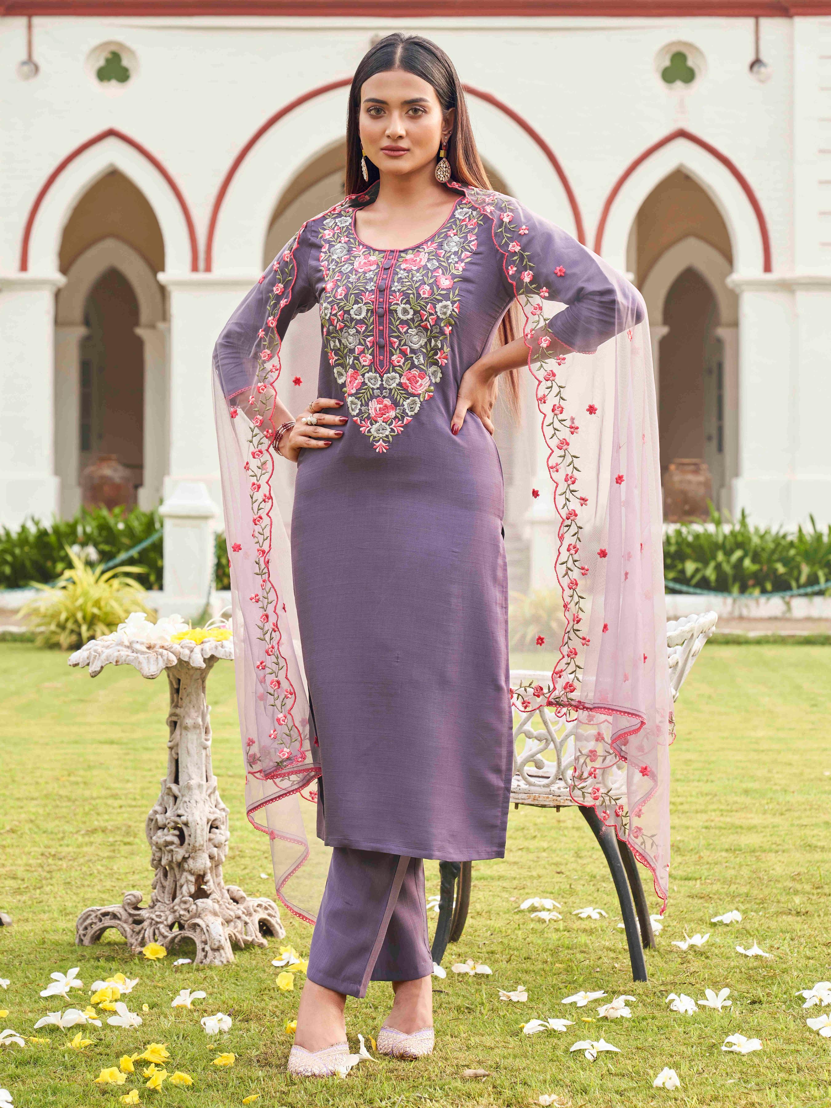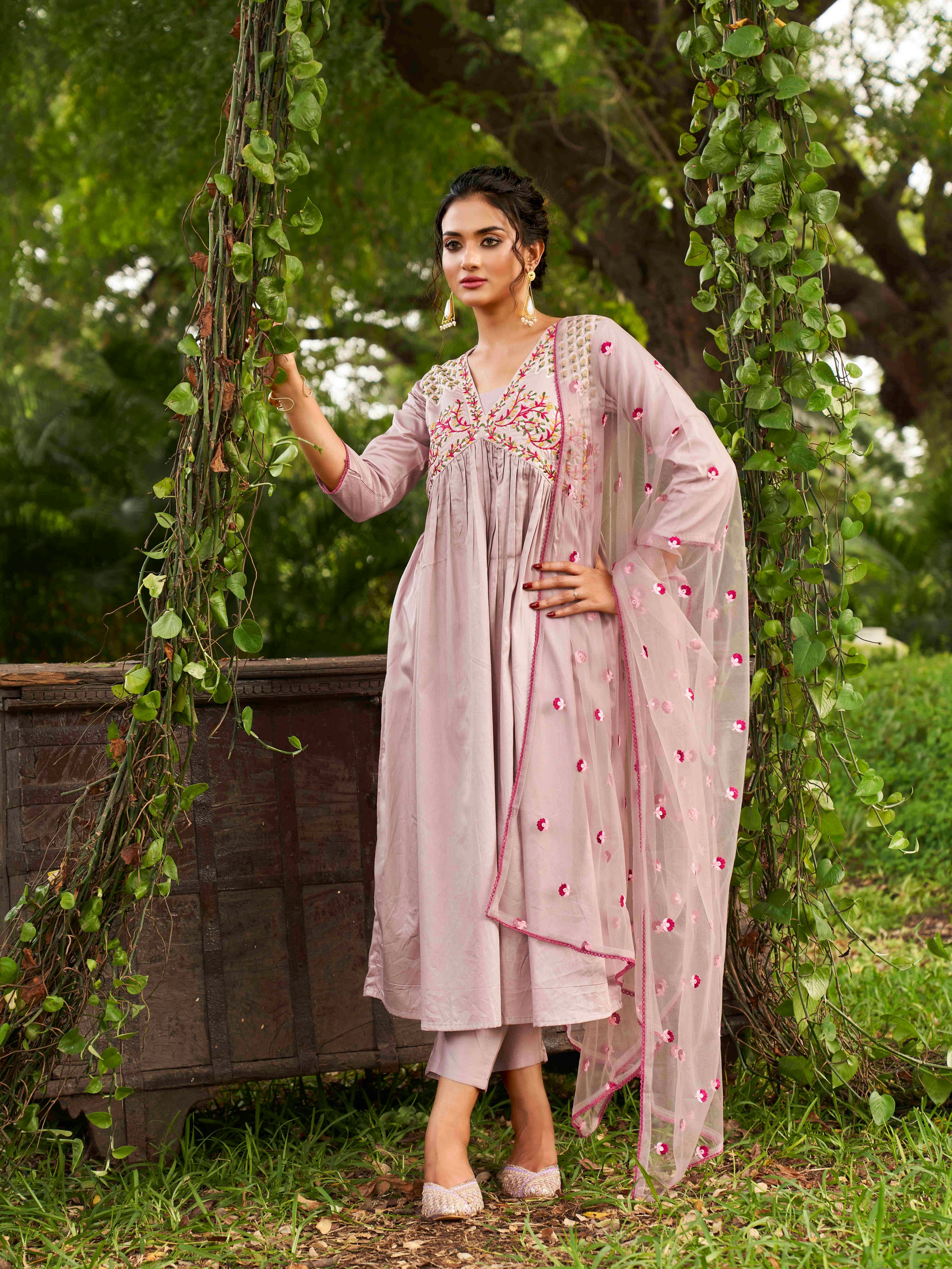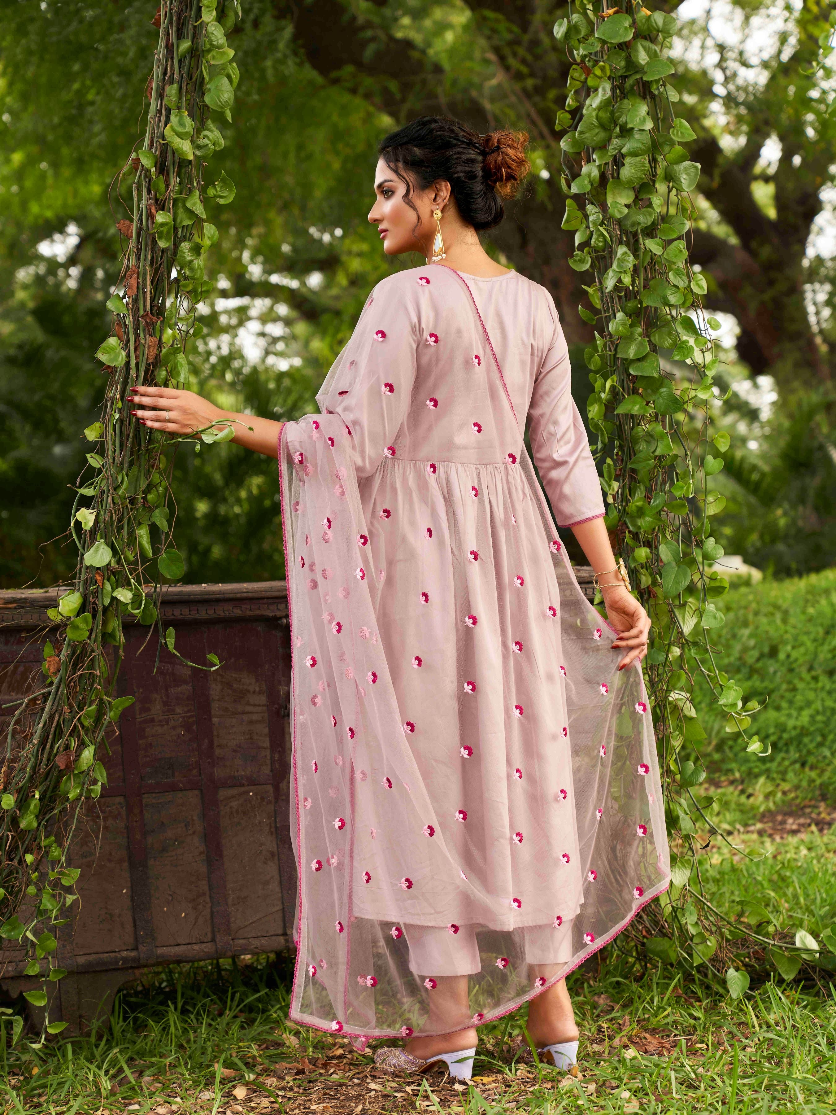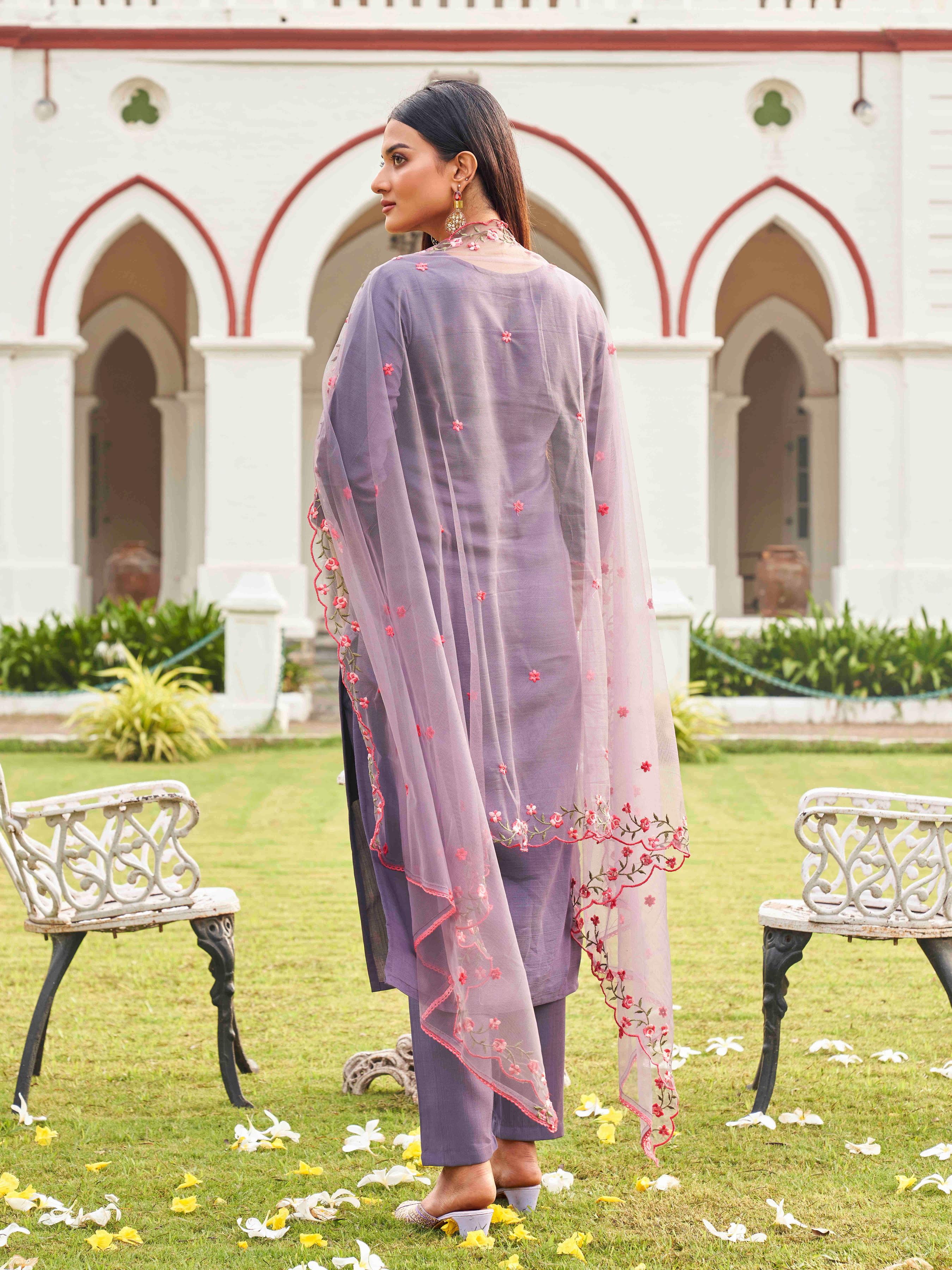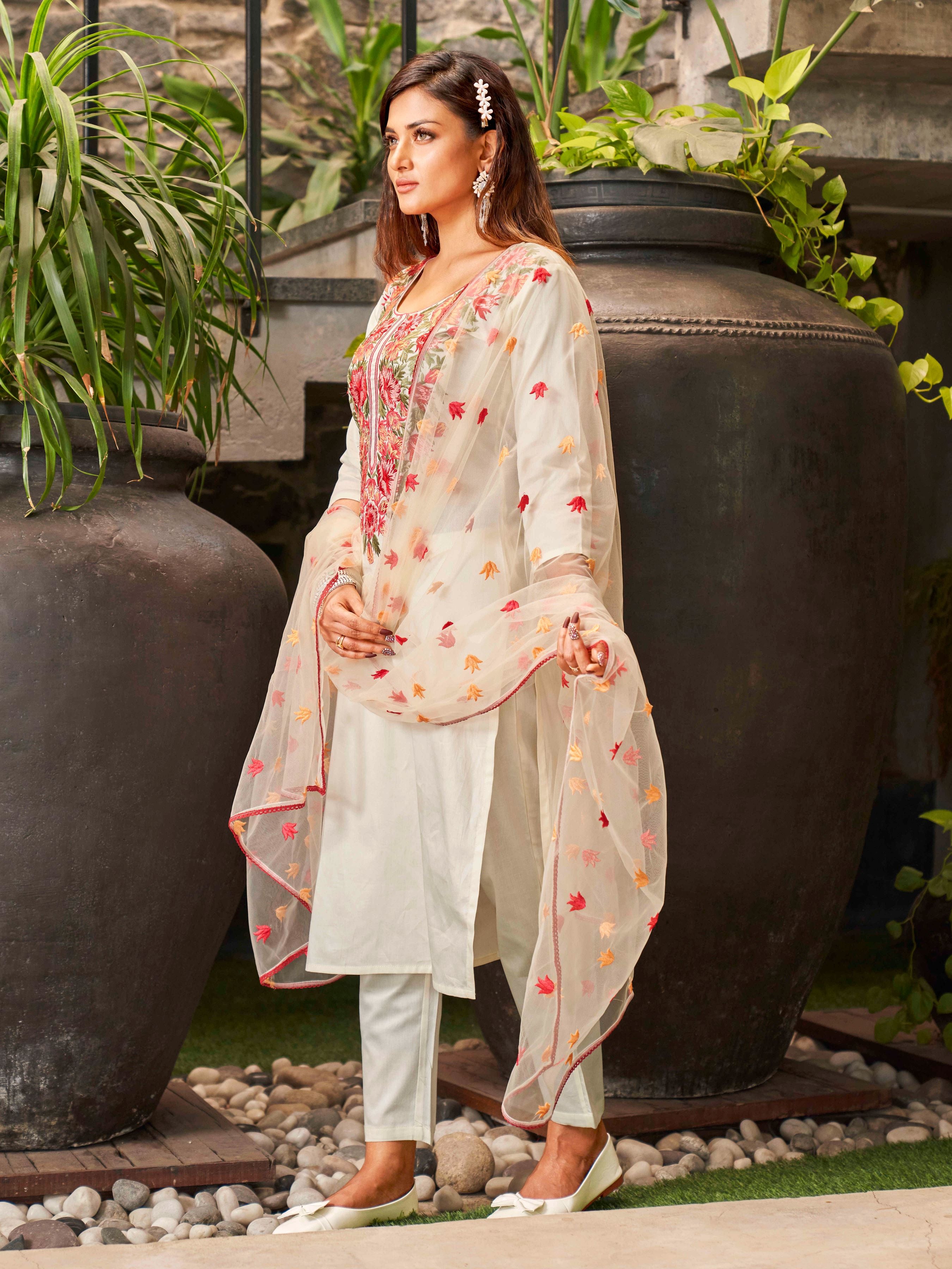 Floral Embroidered Cotton Blend Kurta with Trousers & Dupatta