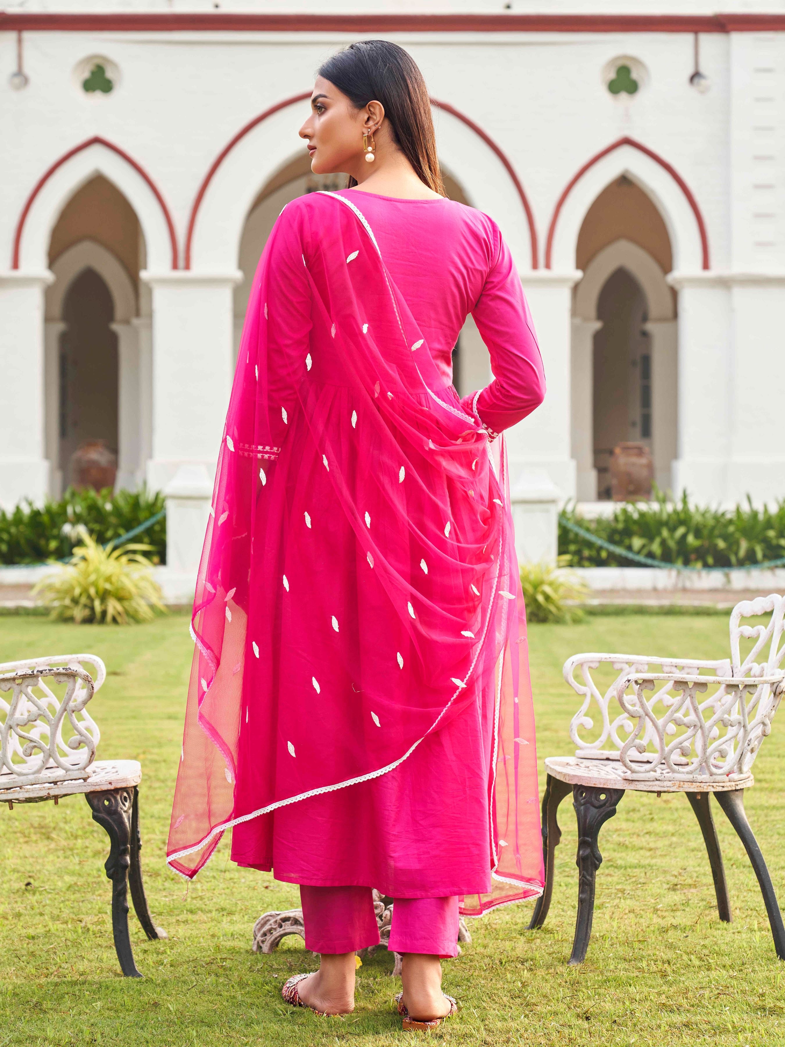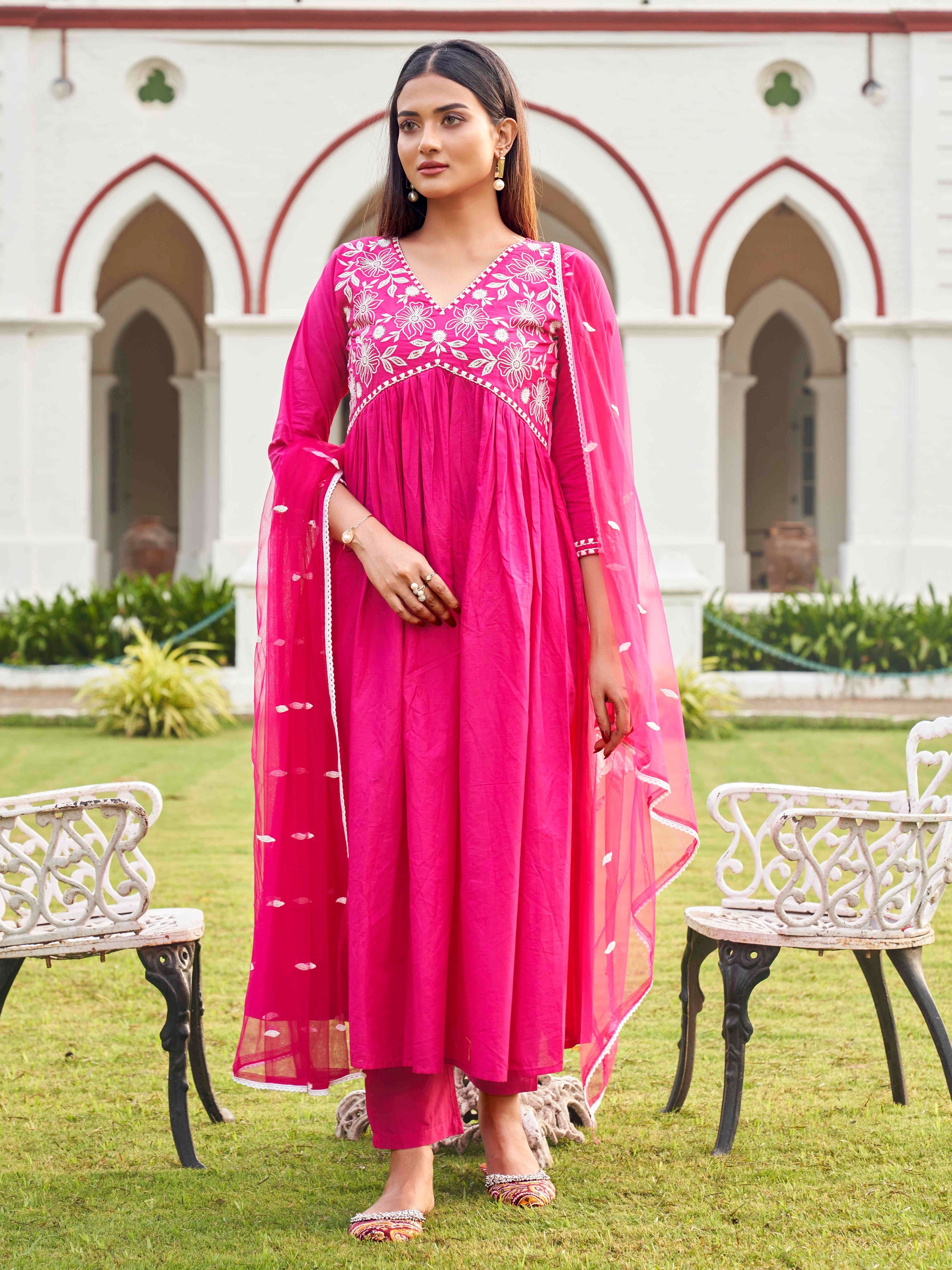 Floral Embroidered Pure Cotton Kurta With Trousers & Dupatta