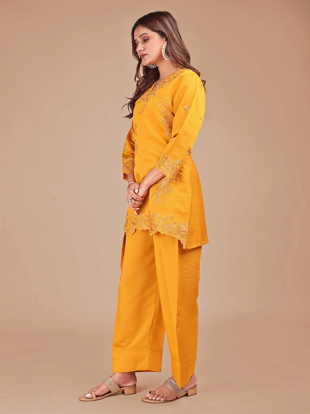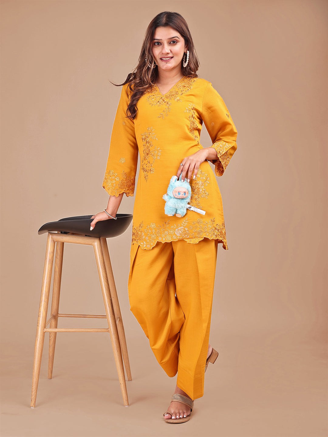 Haldi Colored Embroidered Silk Blend Co-ord Set With Farshi Salwar
