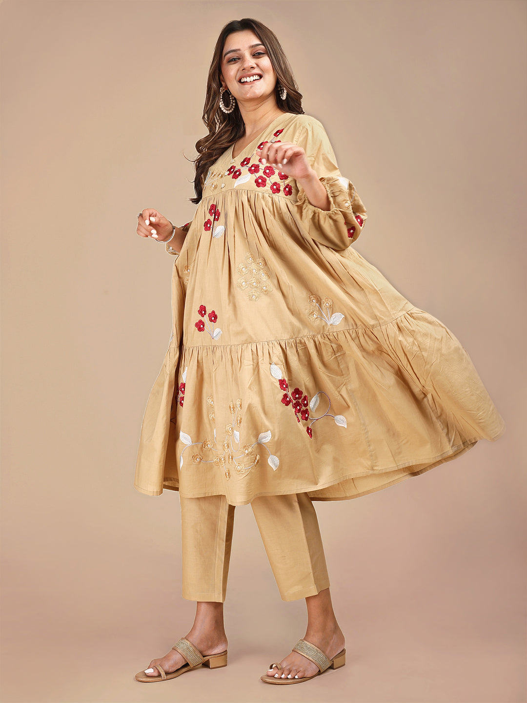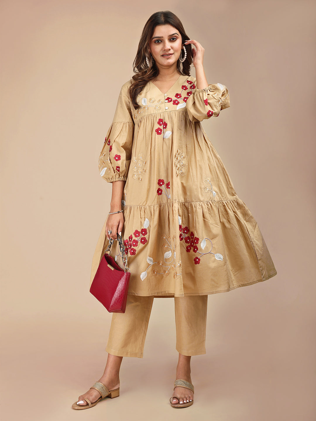 Khaki Colored Cotton V-Neck Tiered Co-ord Set With All Over Embroidery