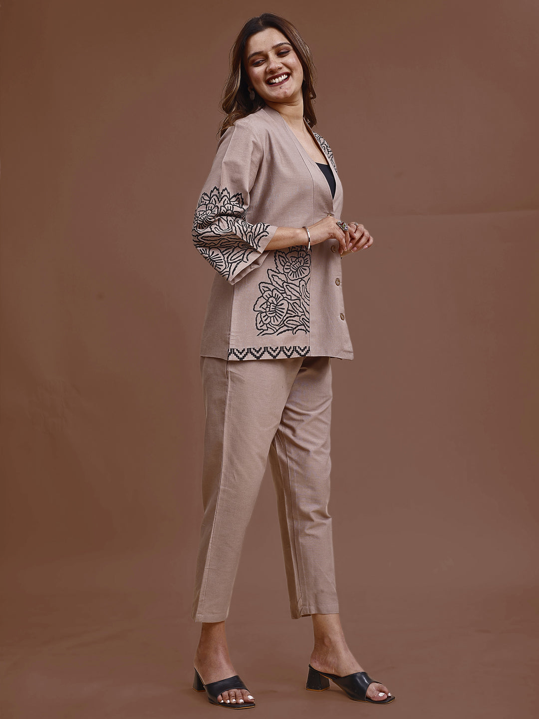 Khaki Colored Pure Cotton With Black Thread Embroidered Shirt & Trouser Co-ord Set