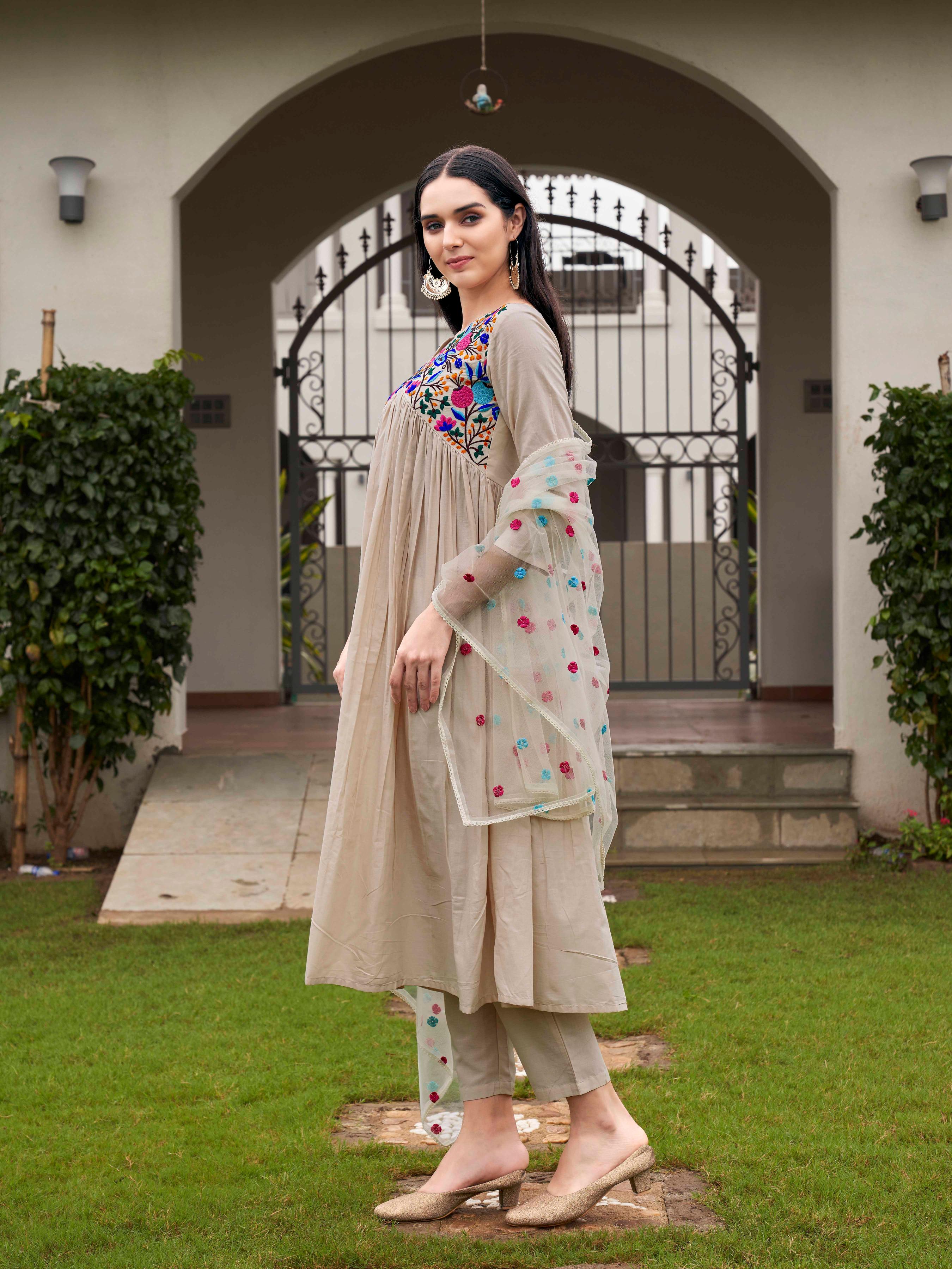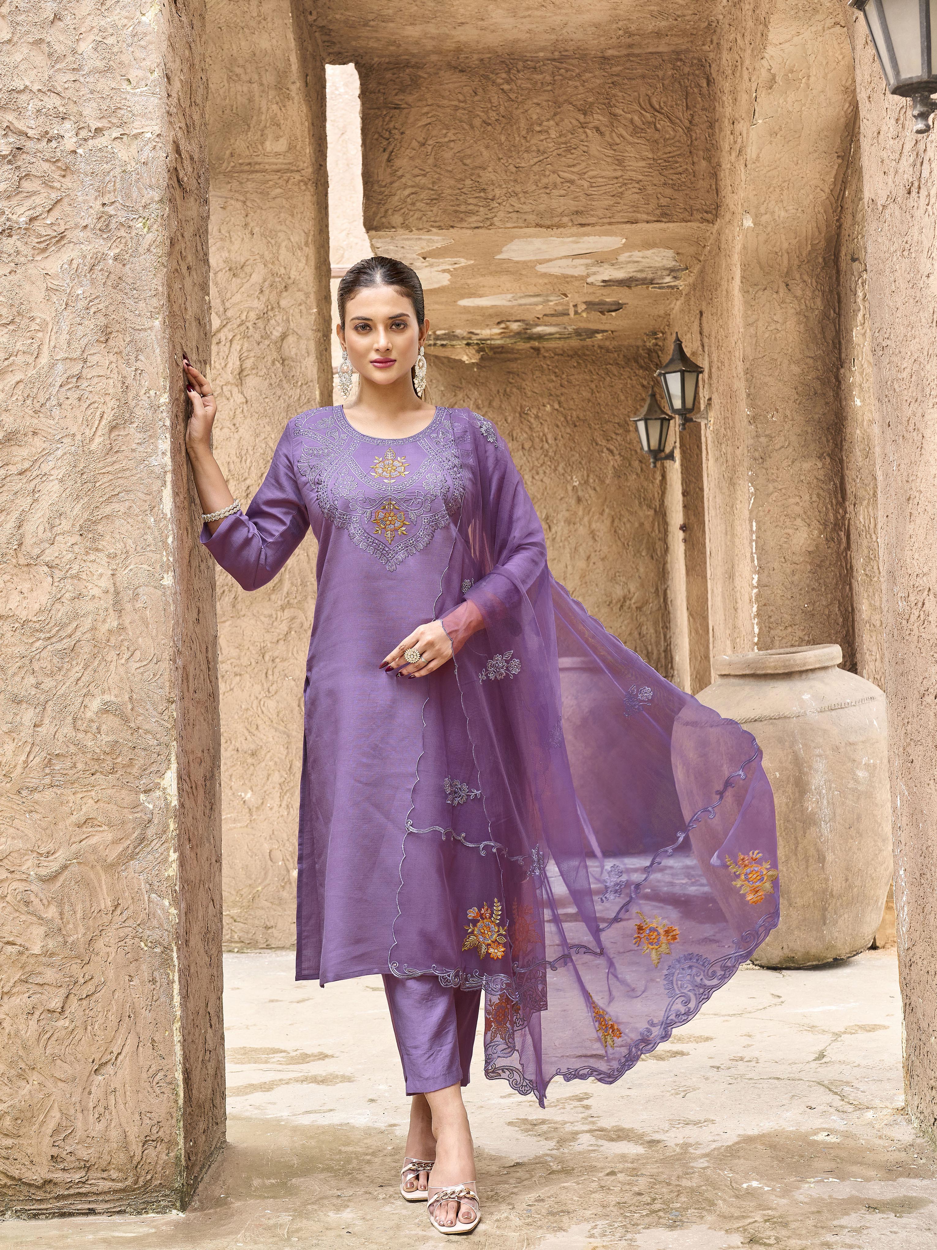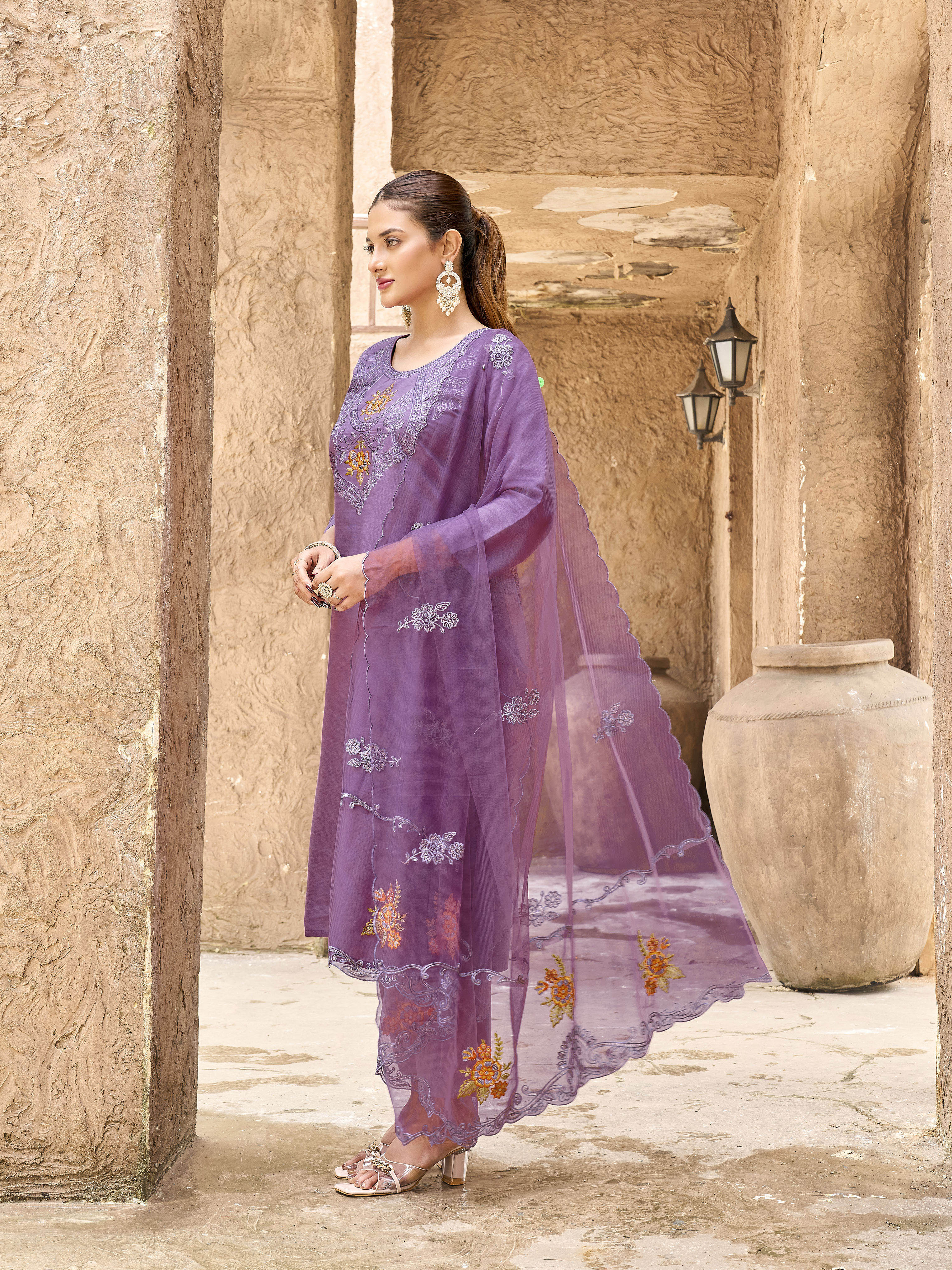 Lavender color silk blend with thread thread embroidered kurta & trouser with dupatta set