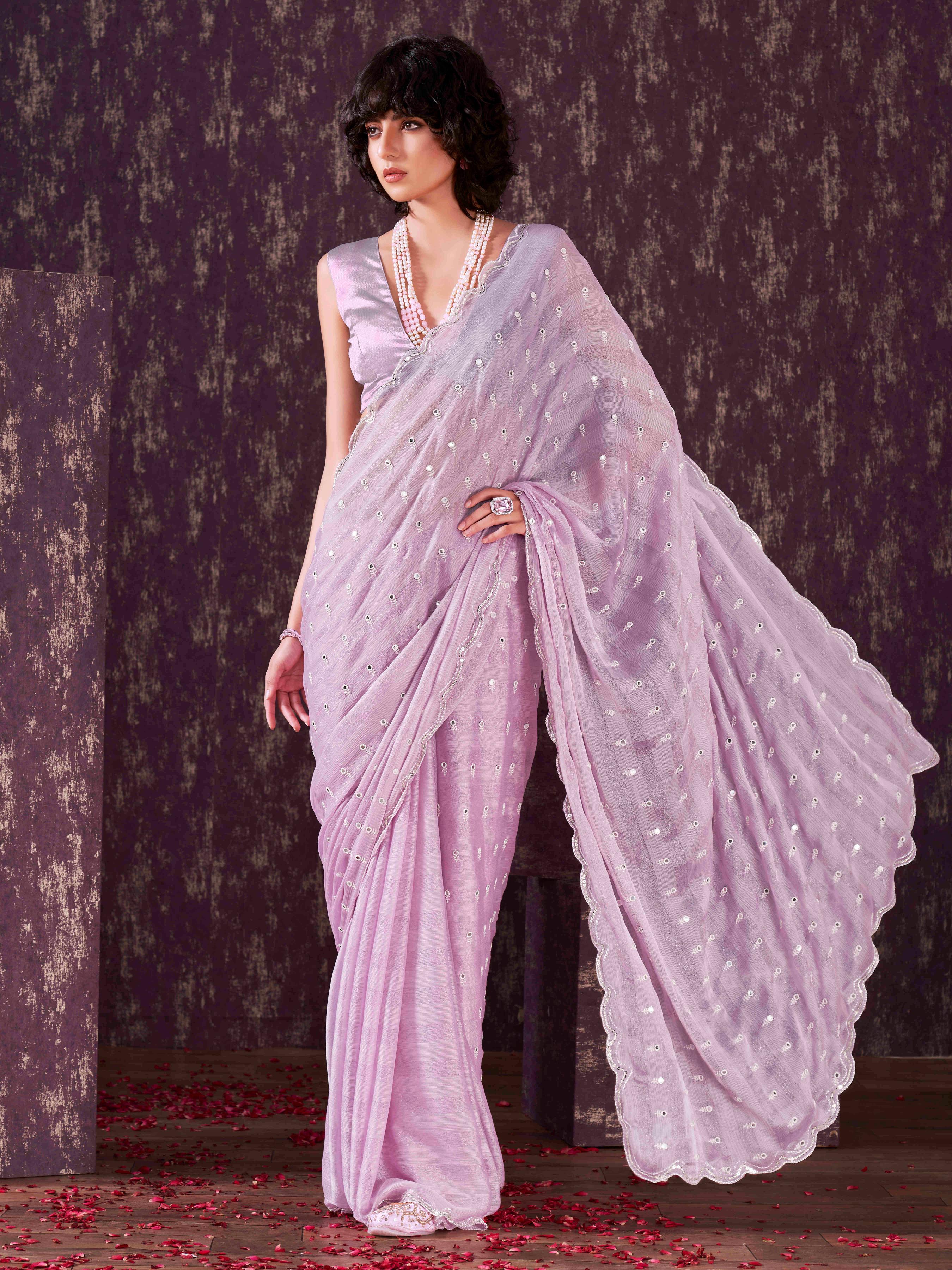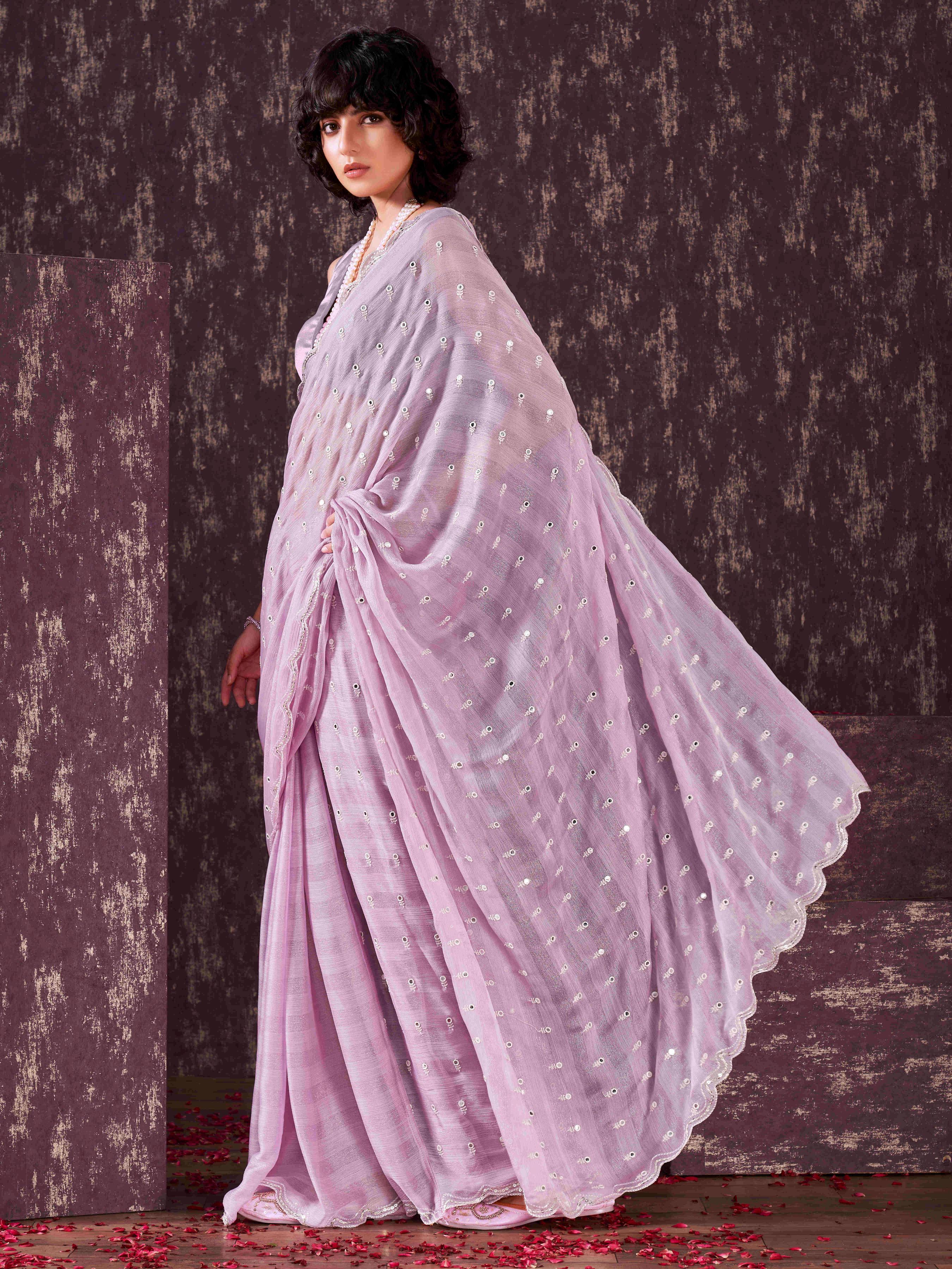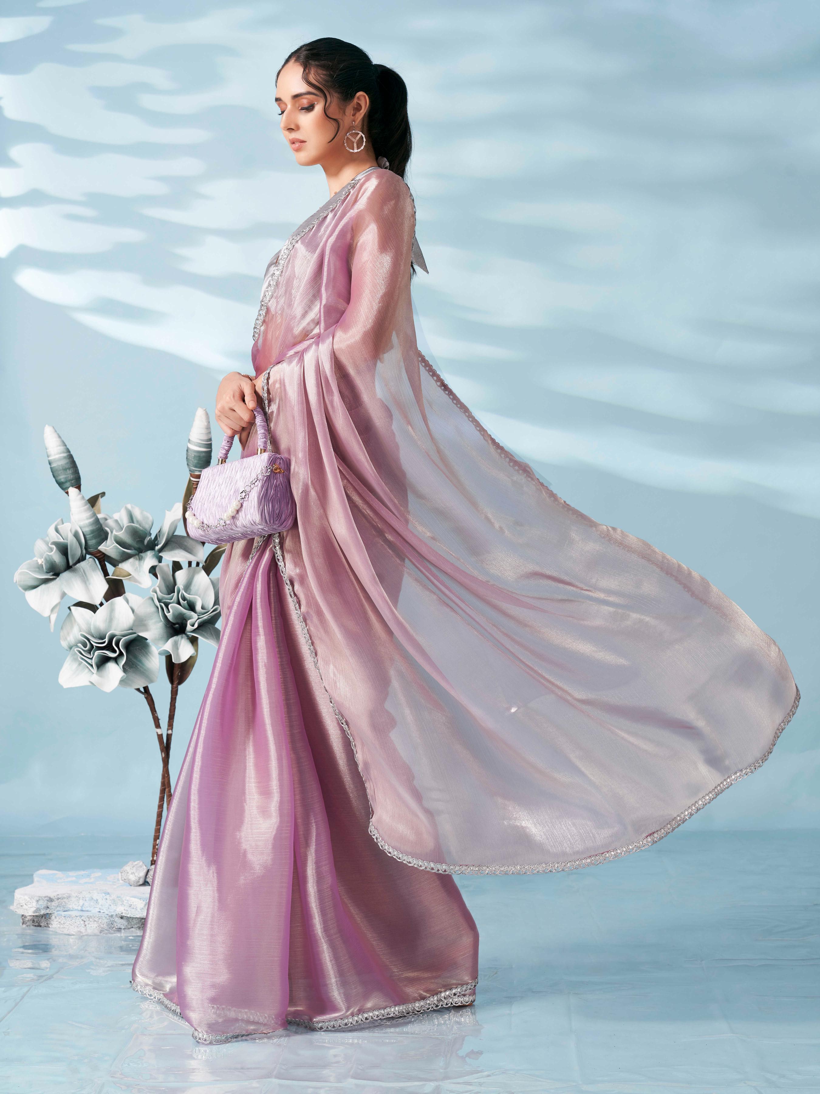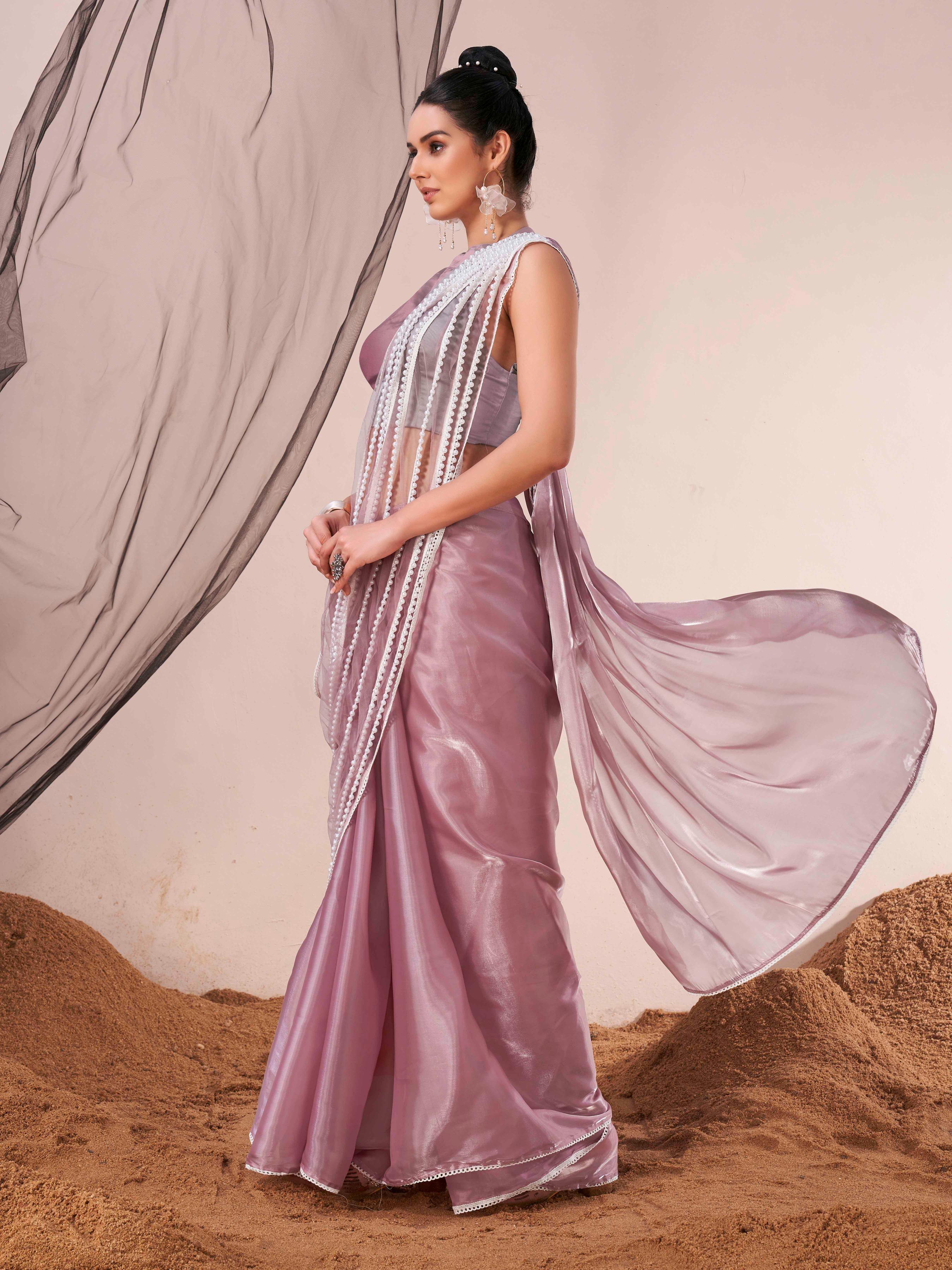 Lavendar colored fancy designer saree with moti lace on shoulder portion
