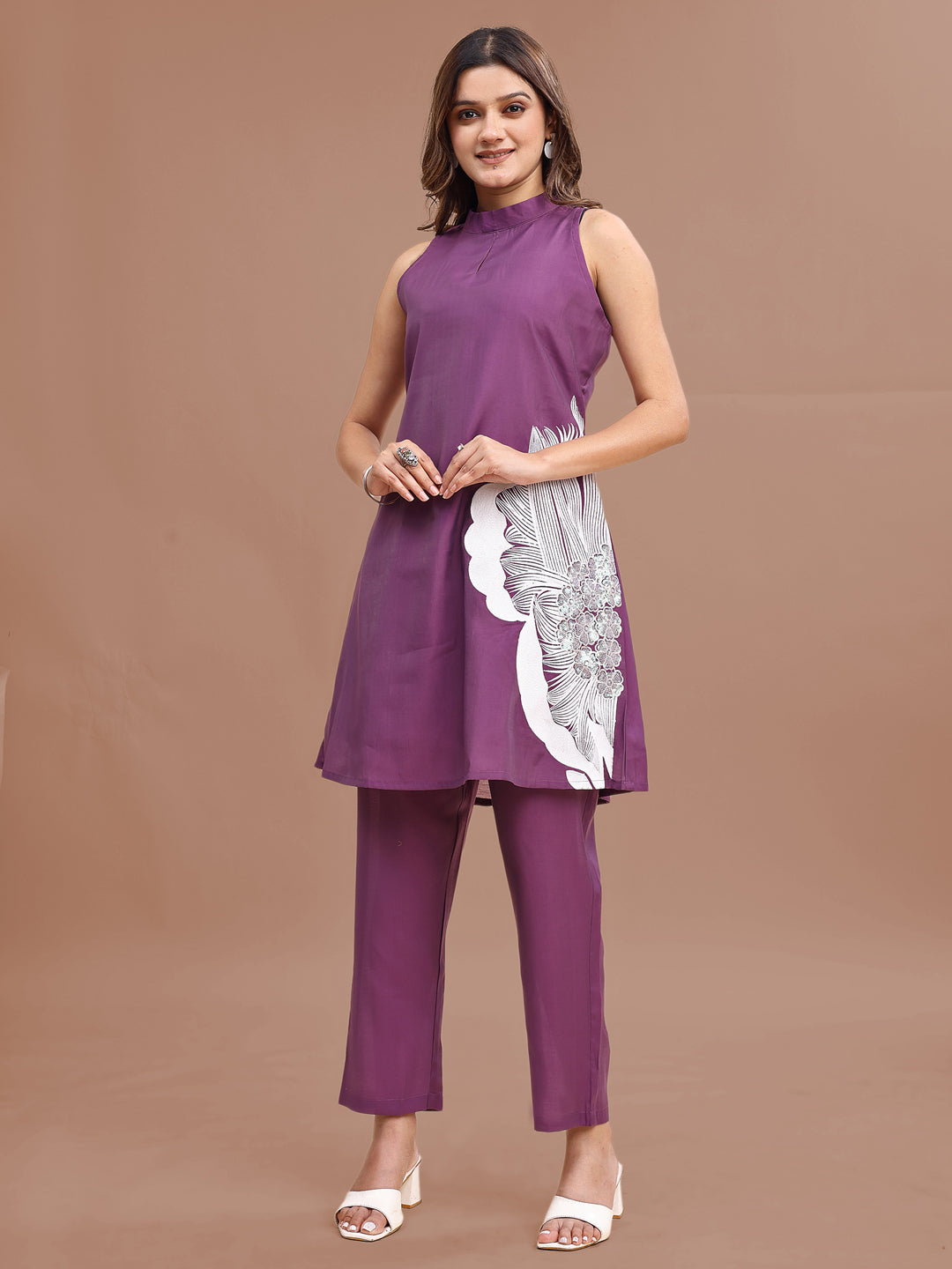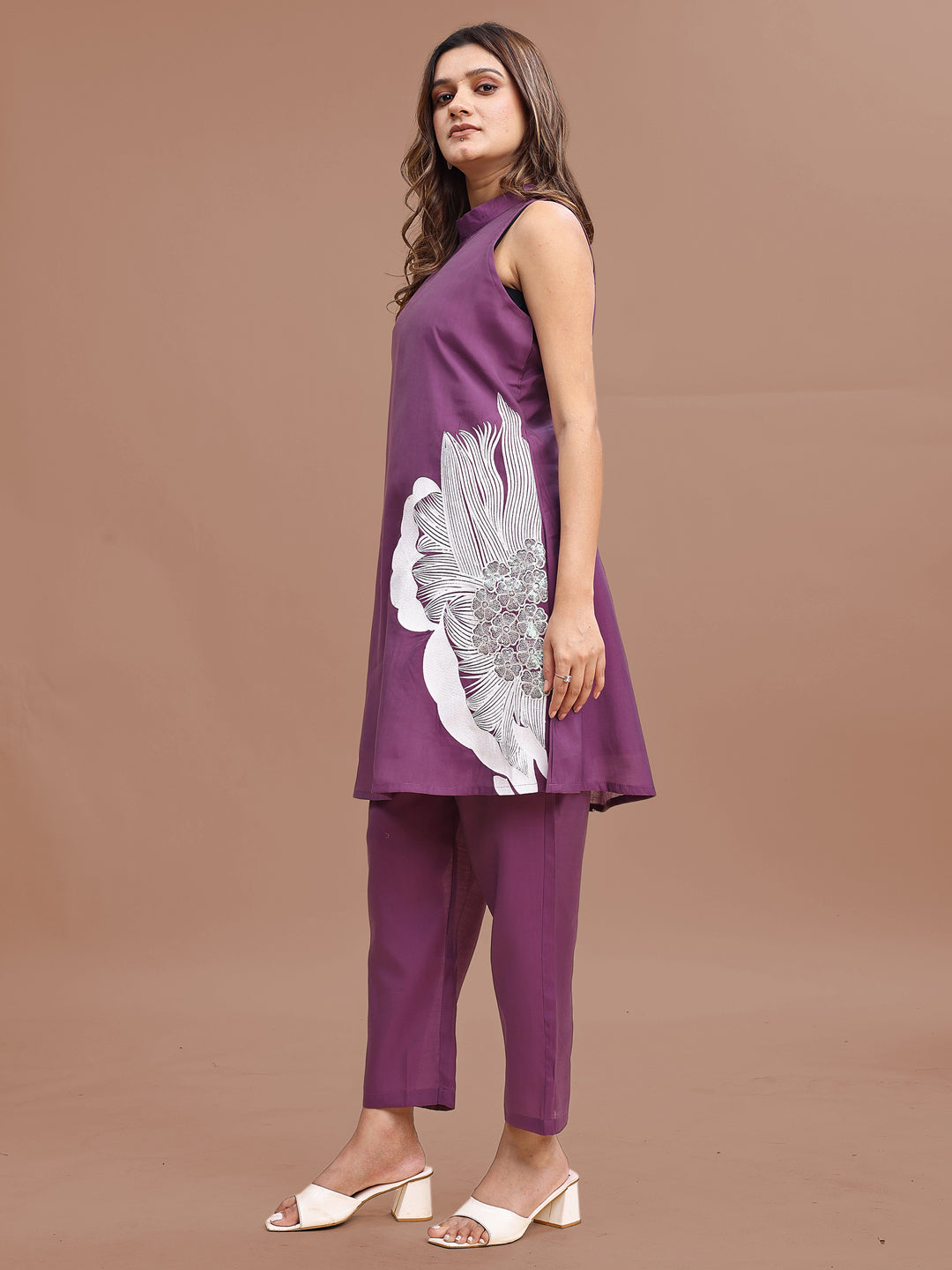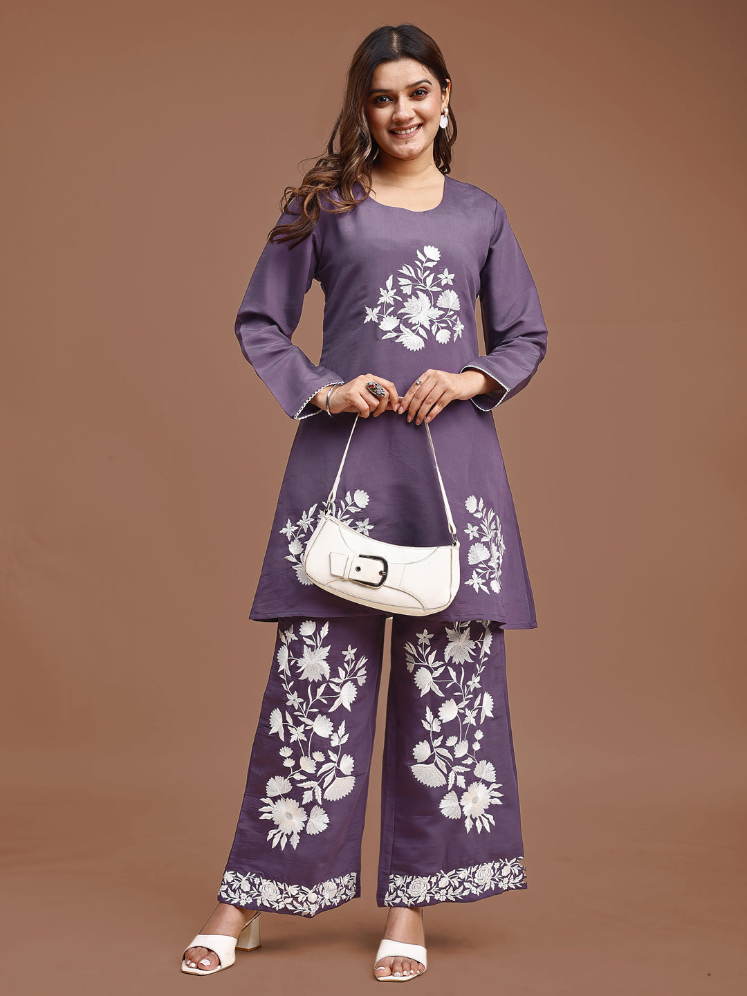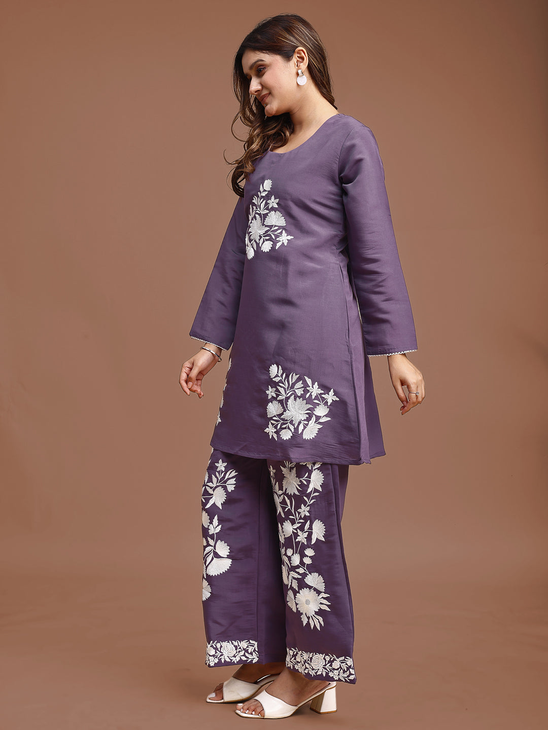 Lavender Colored Silk Blend With White Thread Embroidered Tunic & Trouser Co-ord Set