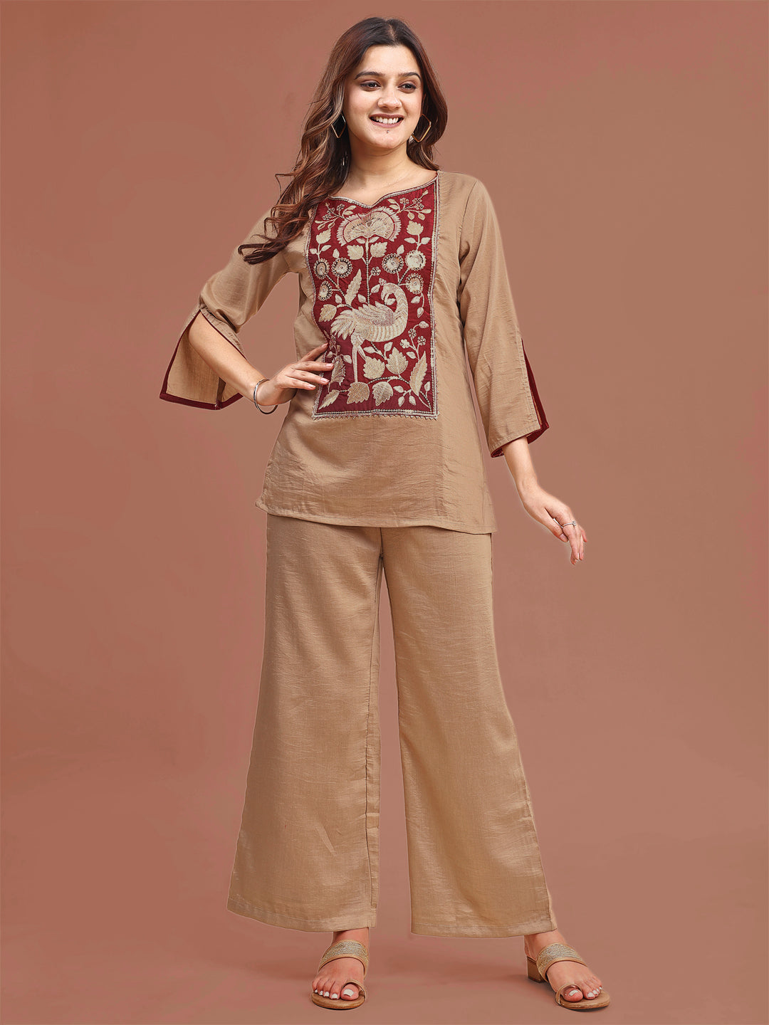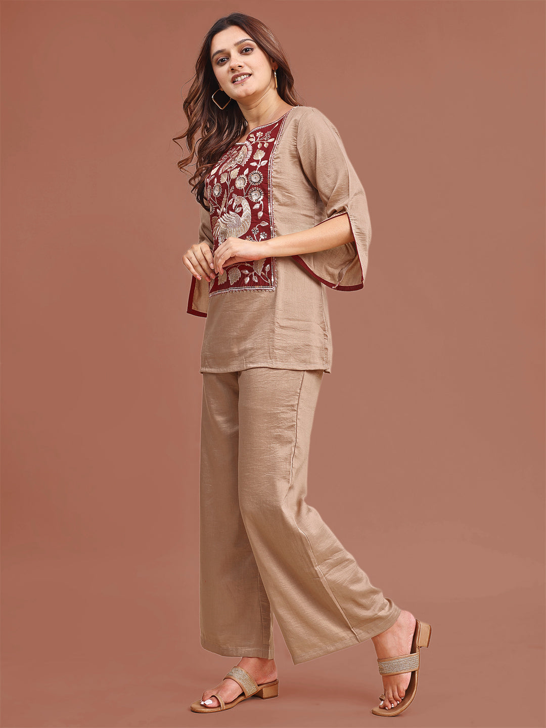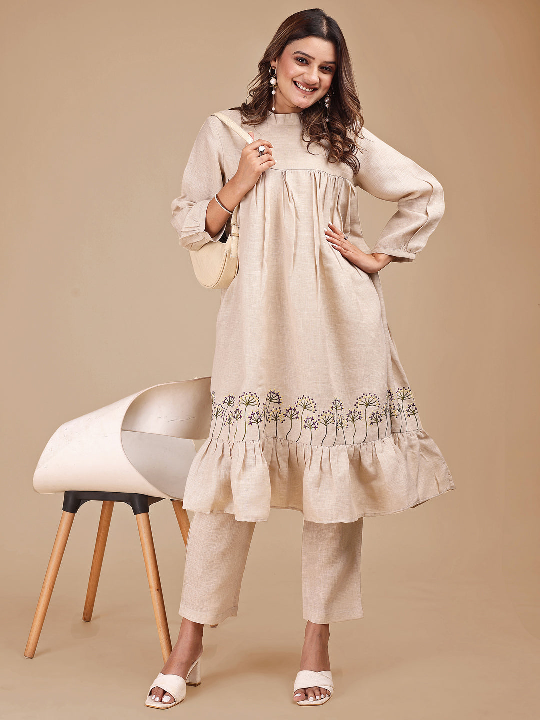 Beige Colored Stylized Embroidered Empire Linen Co-ord Set