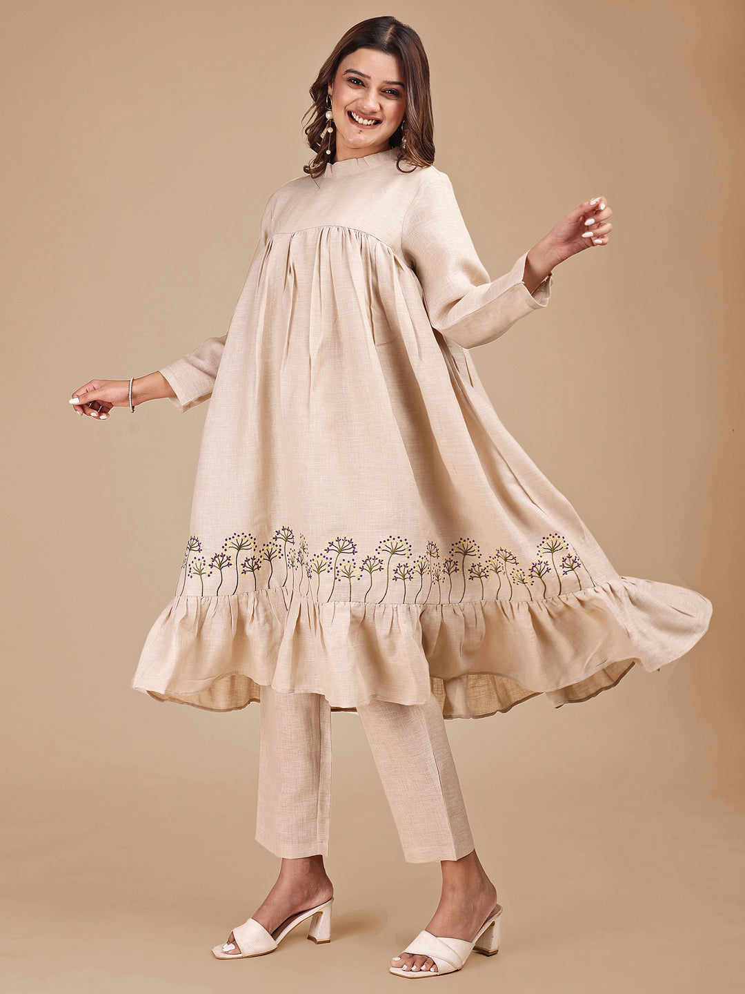 Beige colour linen multi thread embroidery flared tunic with trouser coord set