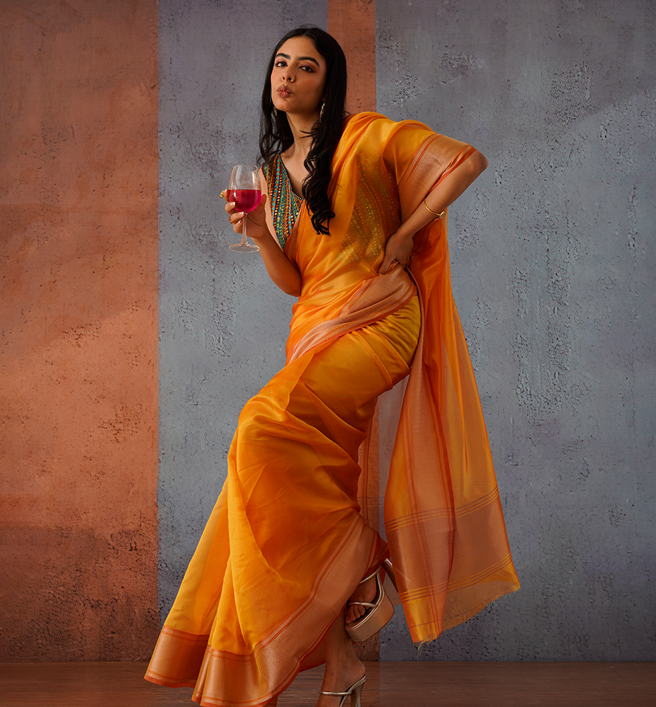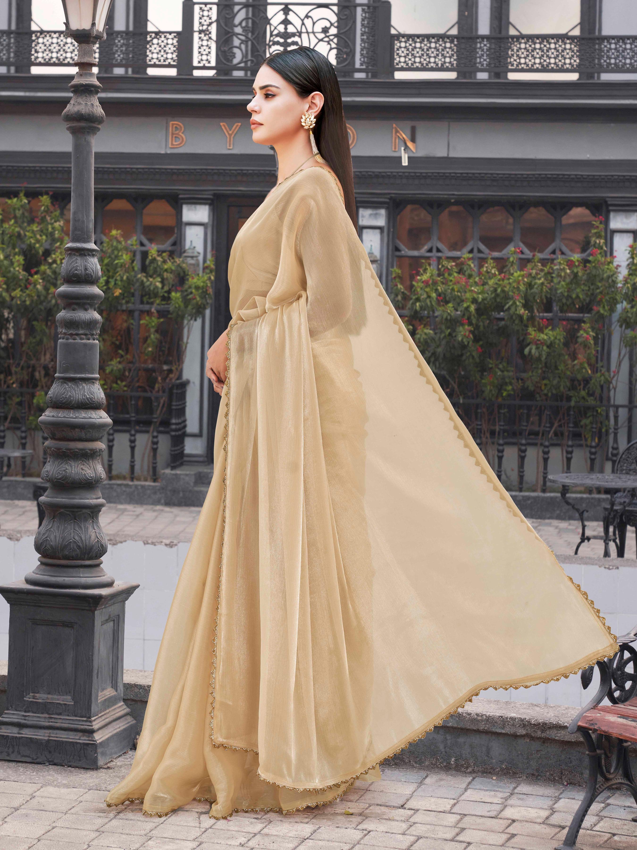 Beige colored jimy cho saree with handwork border