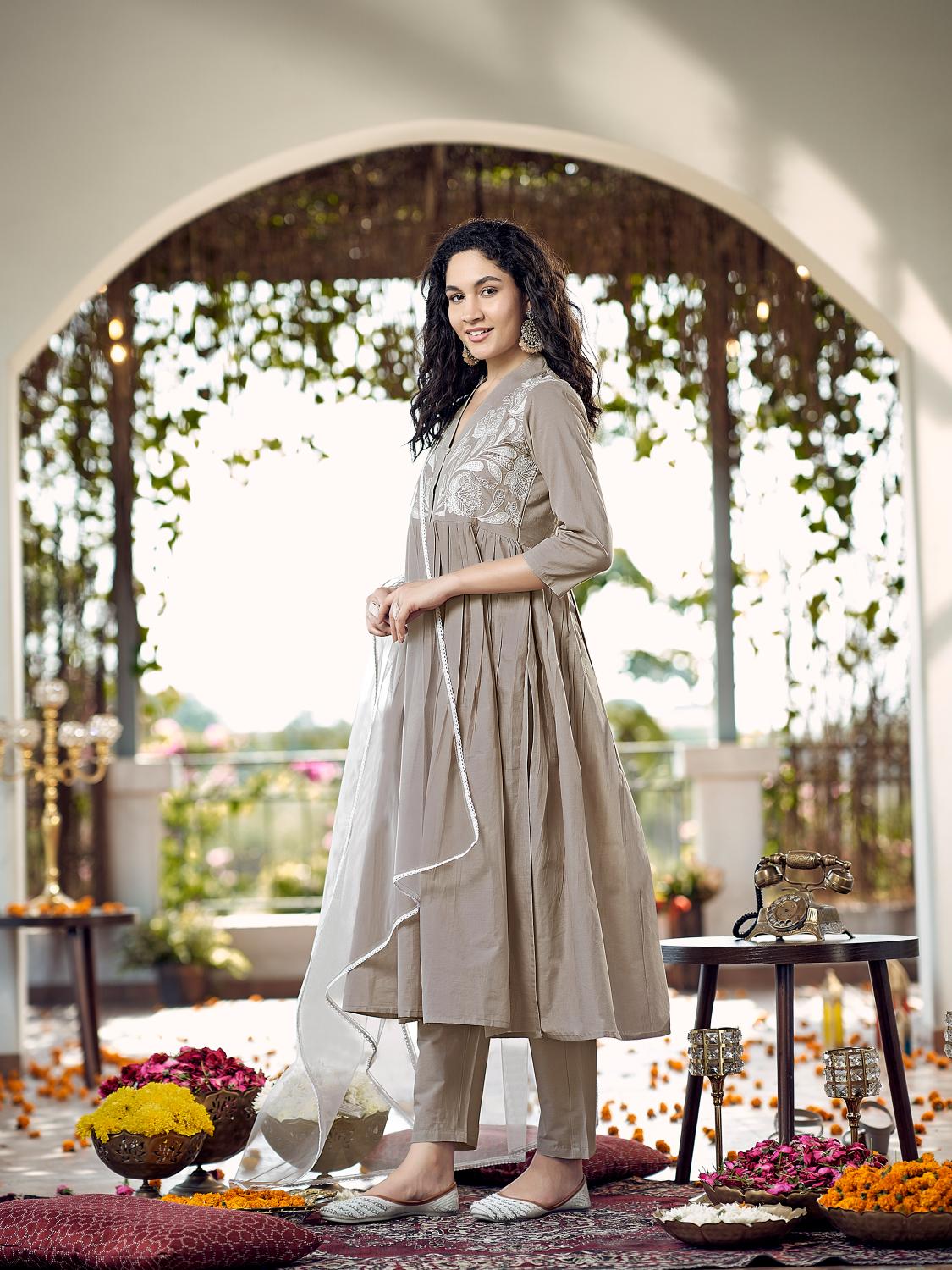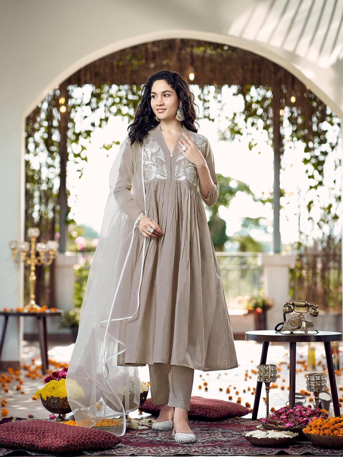 Beige Cotton Gathered Kurta Set With Dupatta & Yoke Embroidery