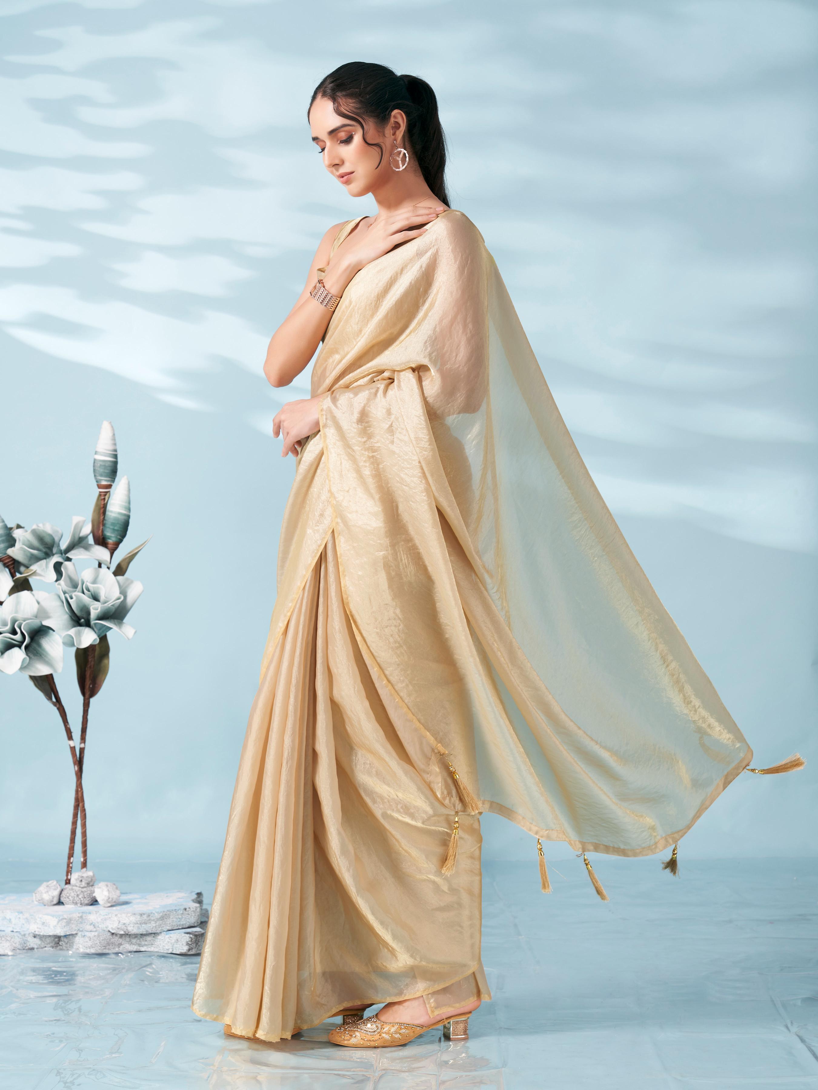 Beige colored satin saree with tassles on pallu