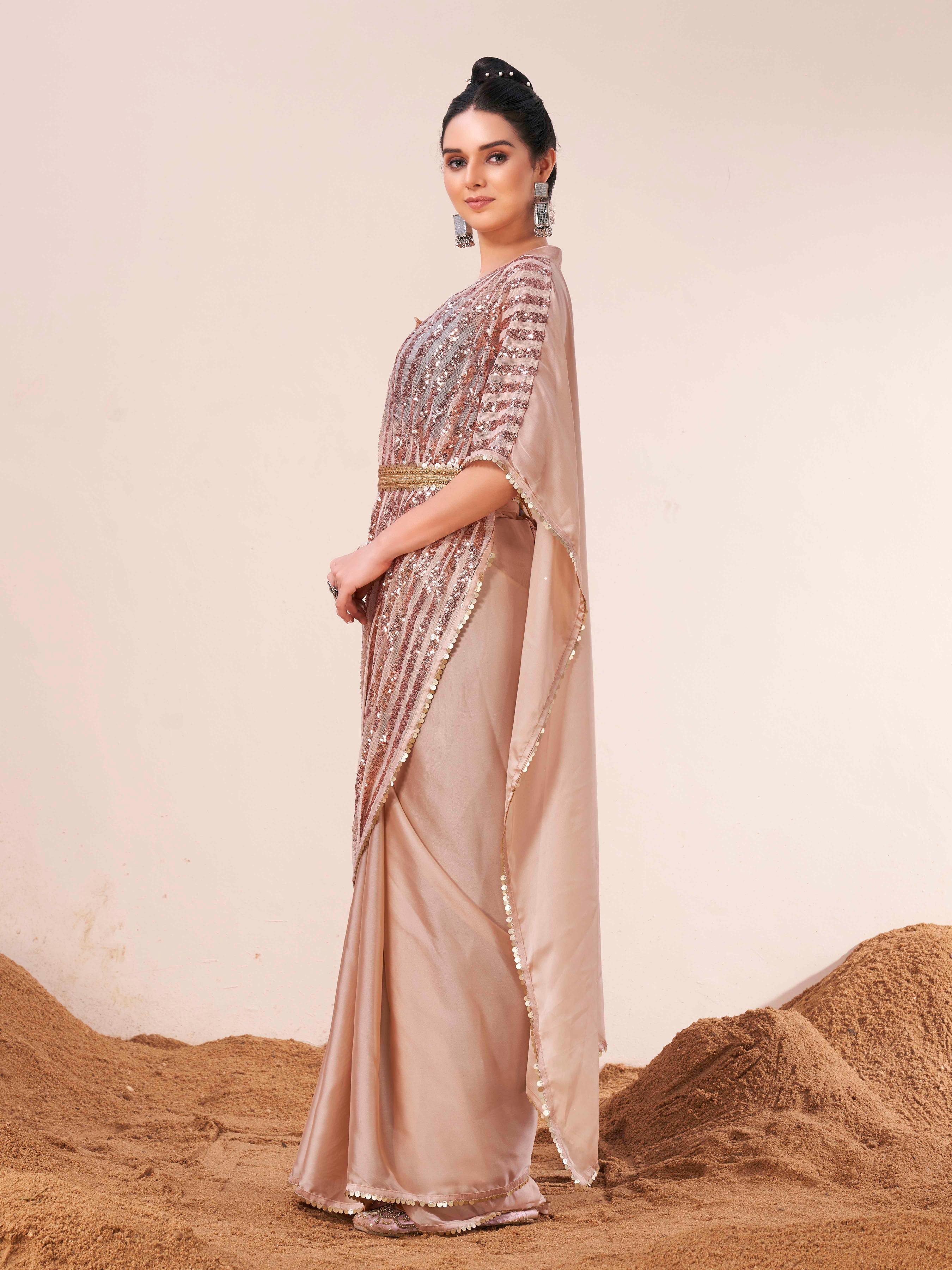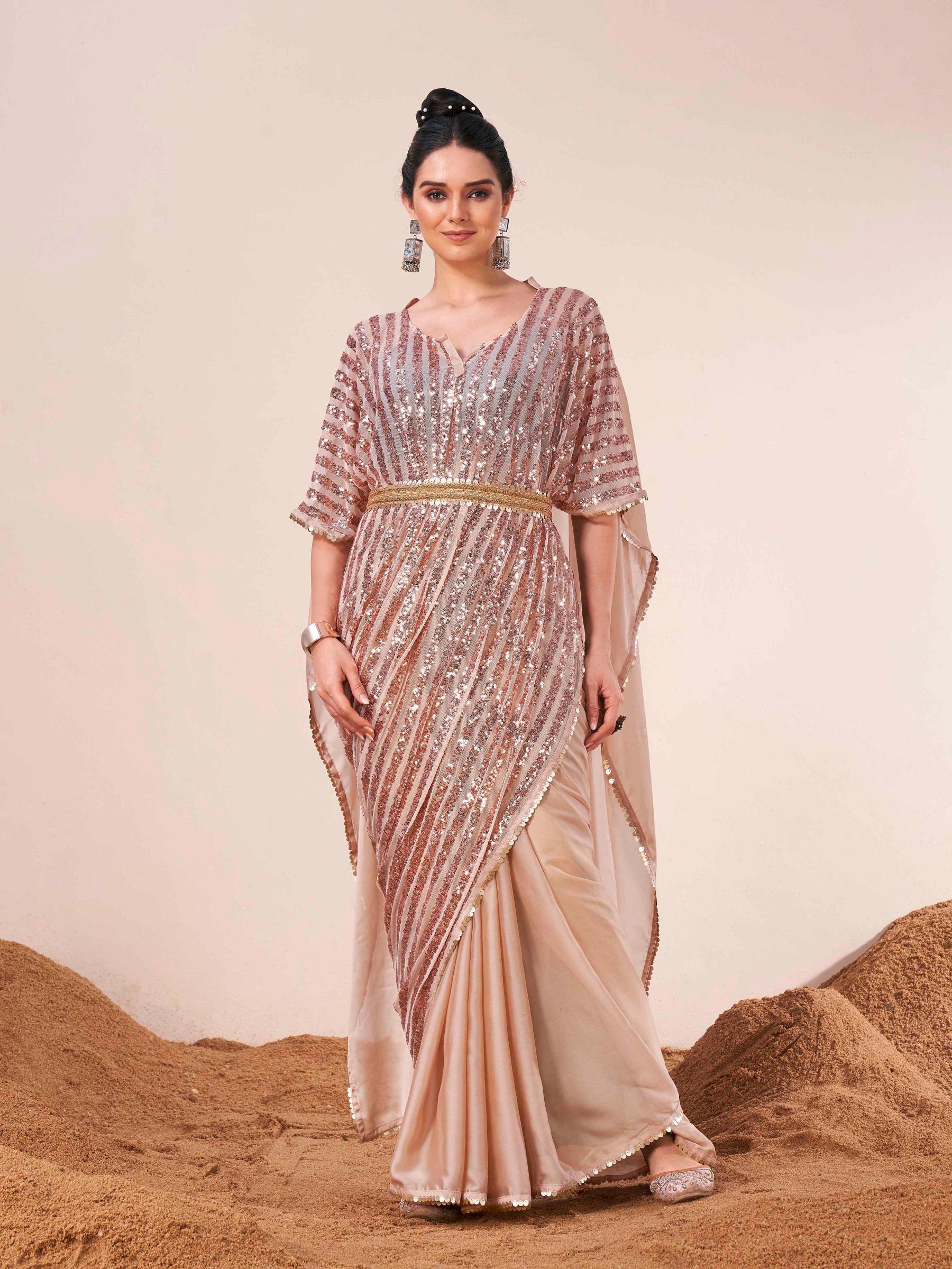 Beige colored designer kaaftan saree with embellished belt