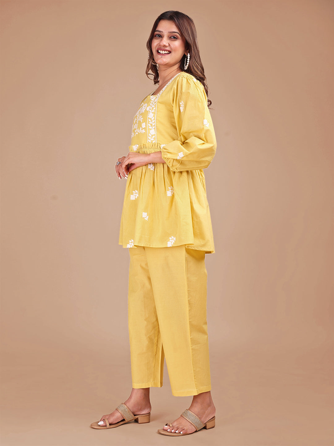 Lemon Colored Chikankari Embroidered Cotton Stylized Co-ord Set