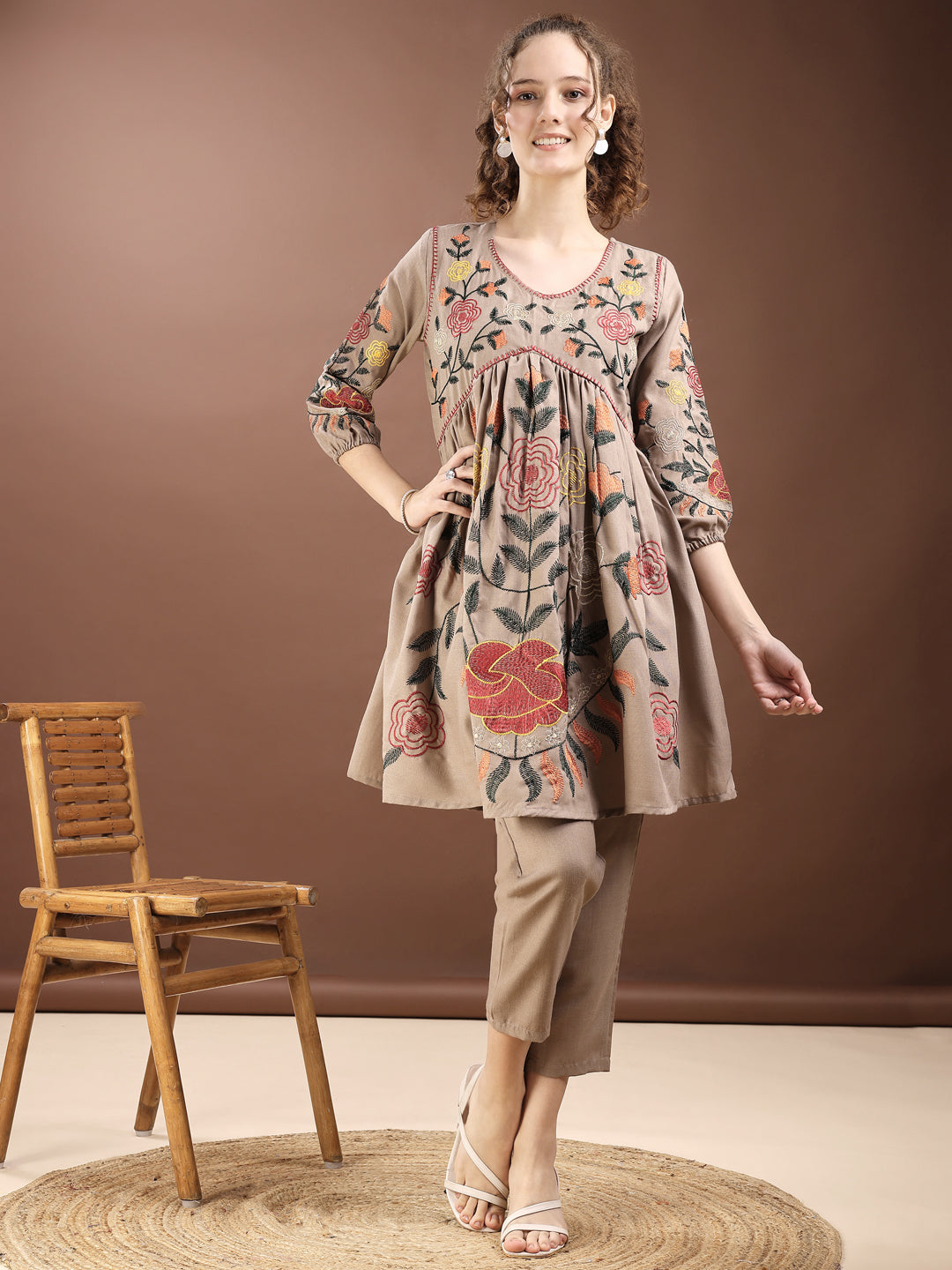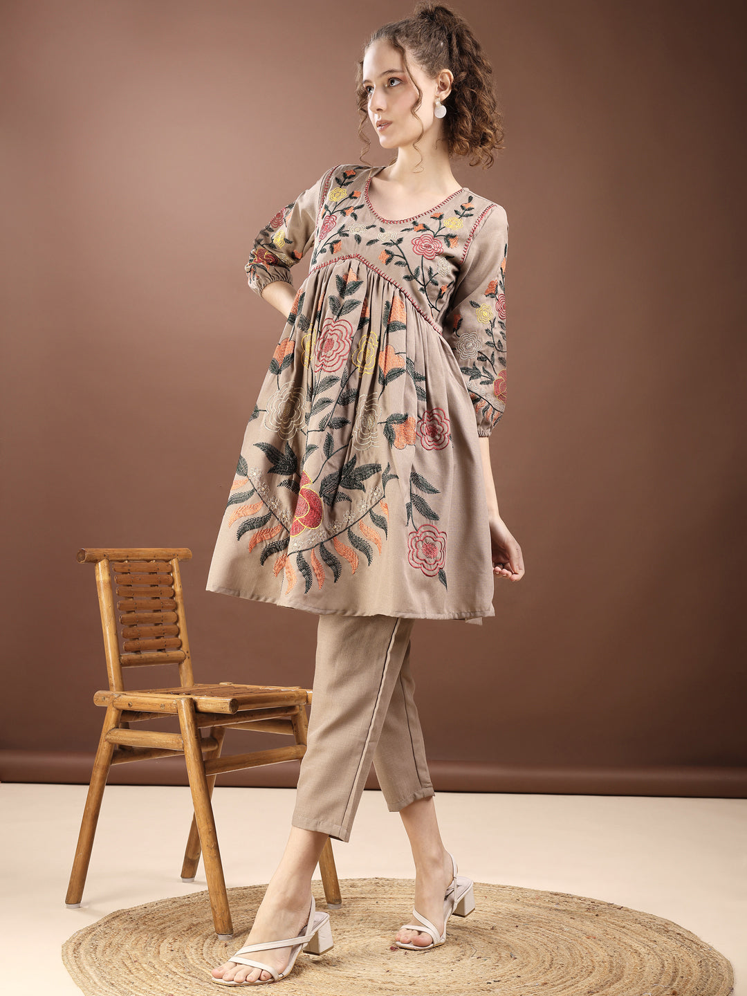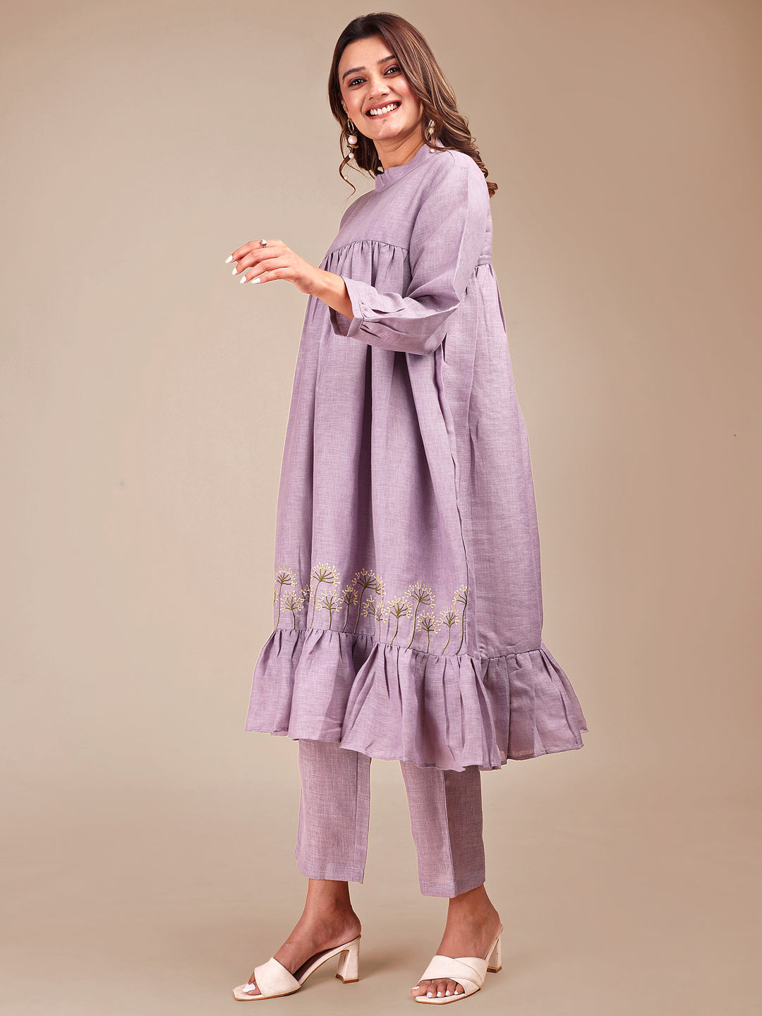 Lavender Colored Stylized Embroidered Empire Linen Co-ord Set