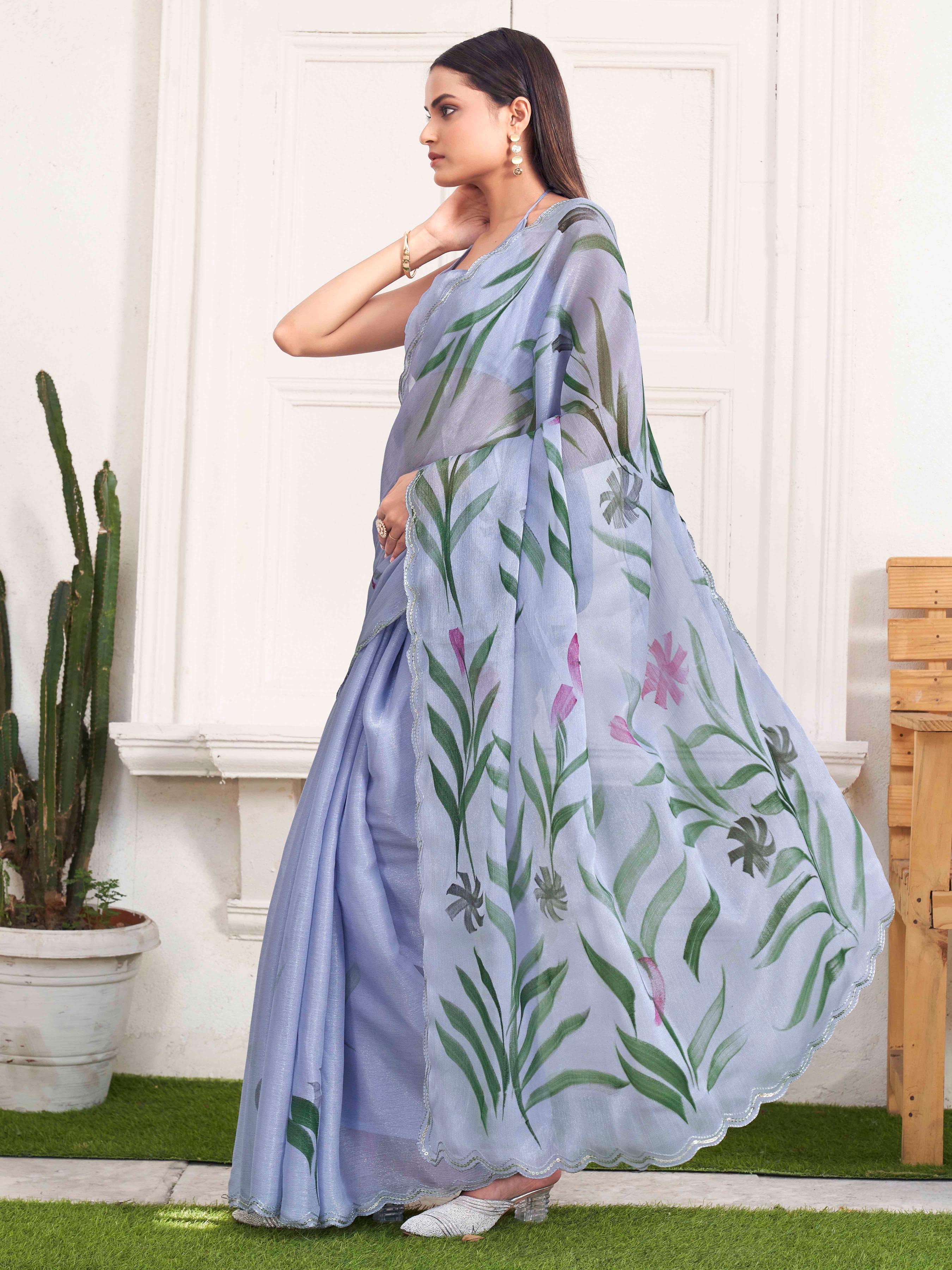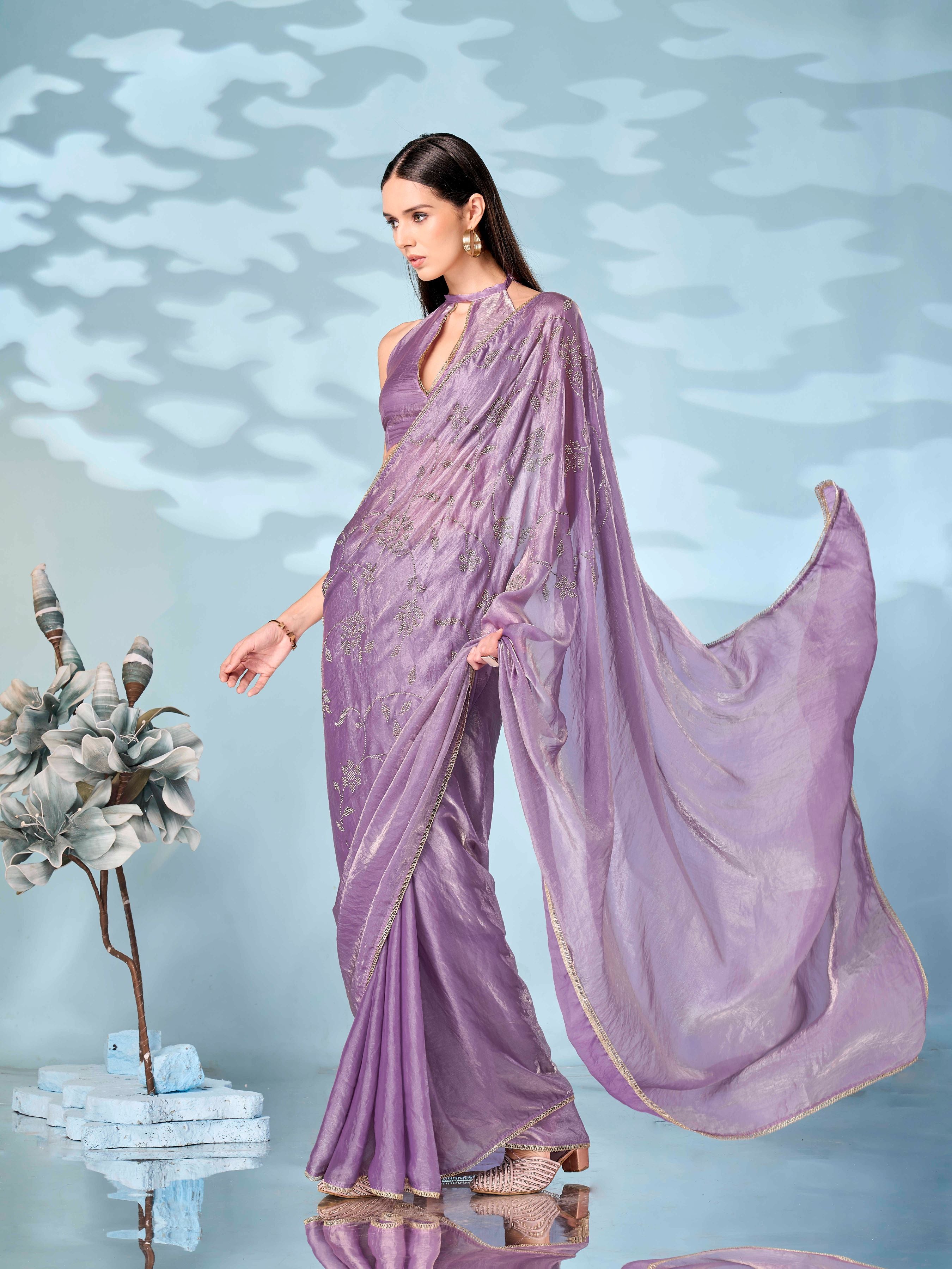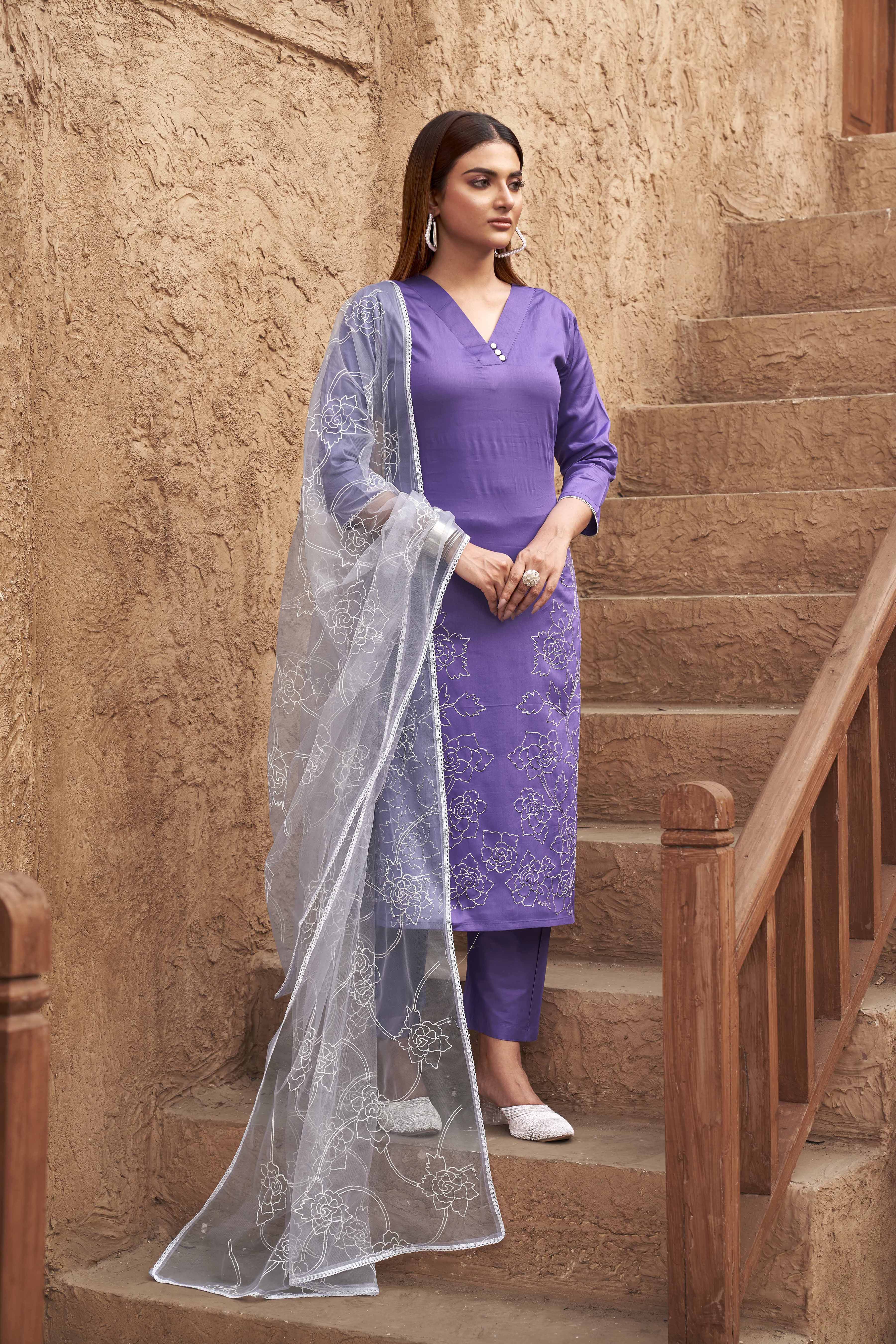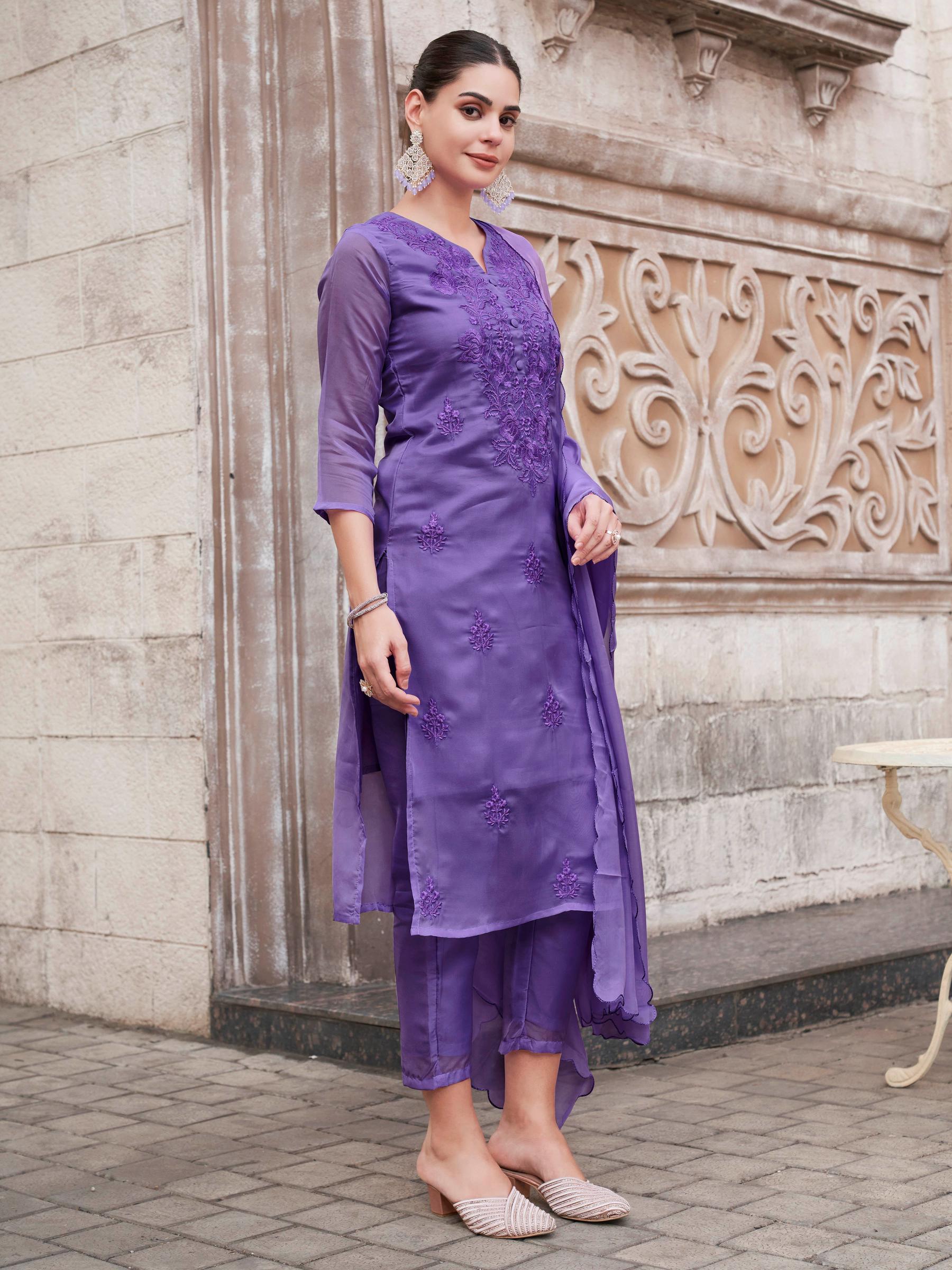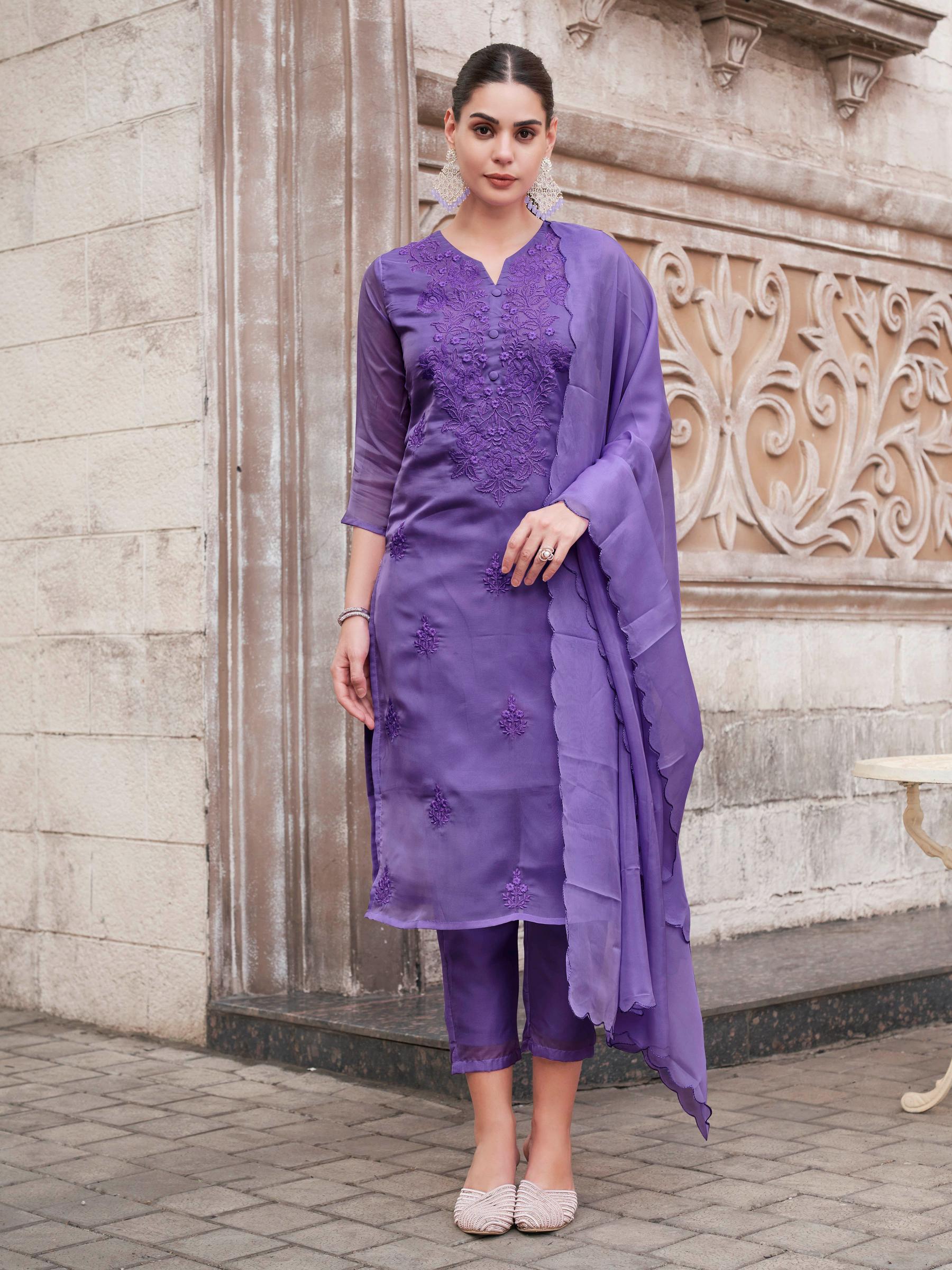 Lavender Organza With Tonal Thread Embroidery Round Neck Straight Kurta Set