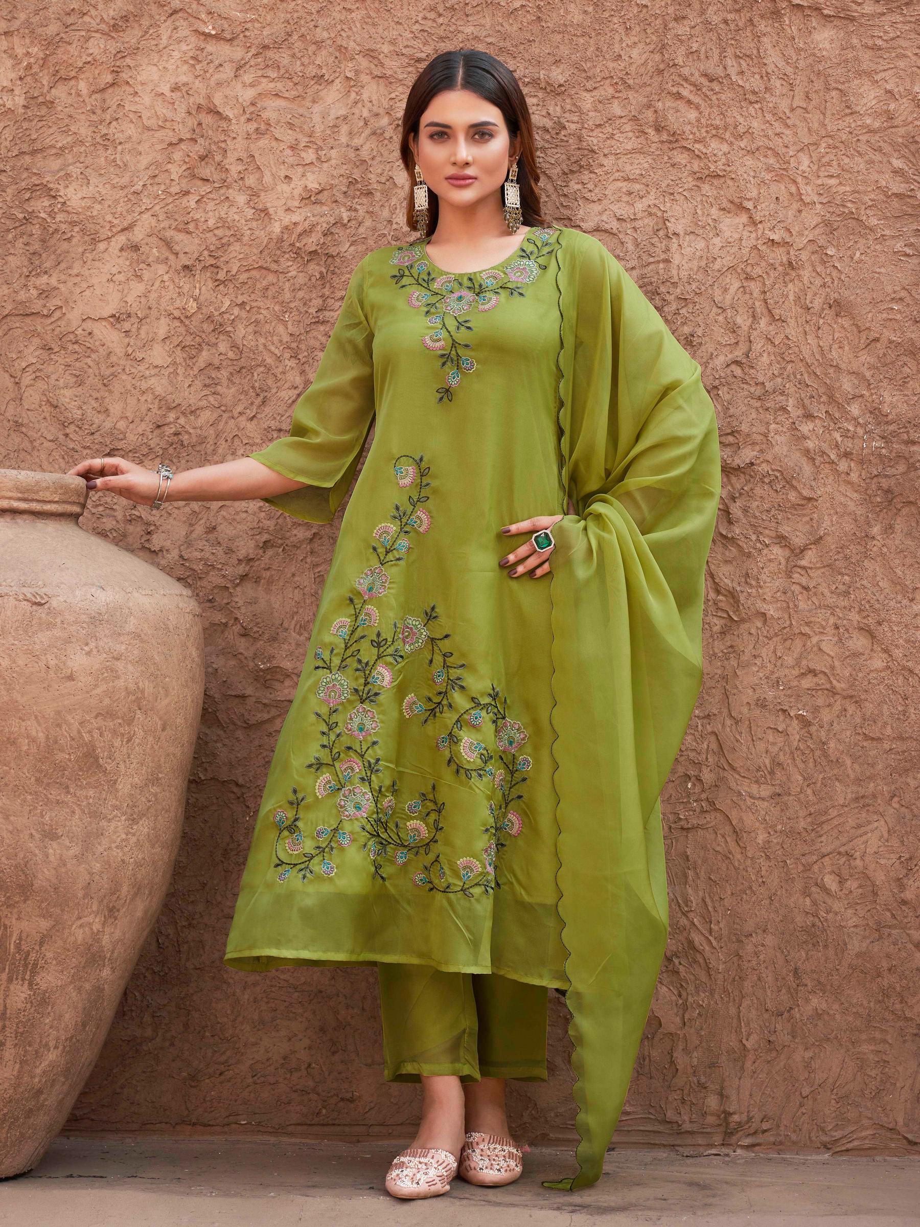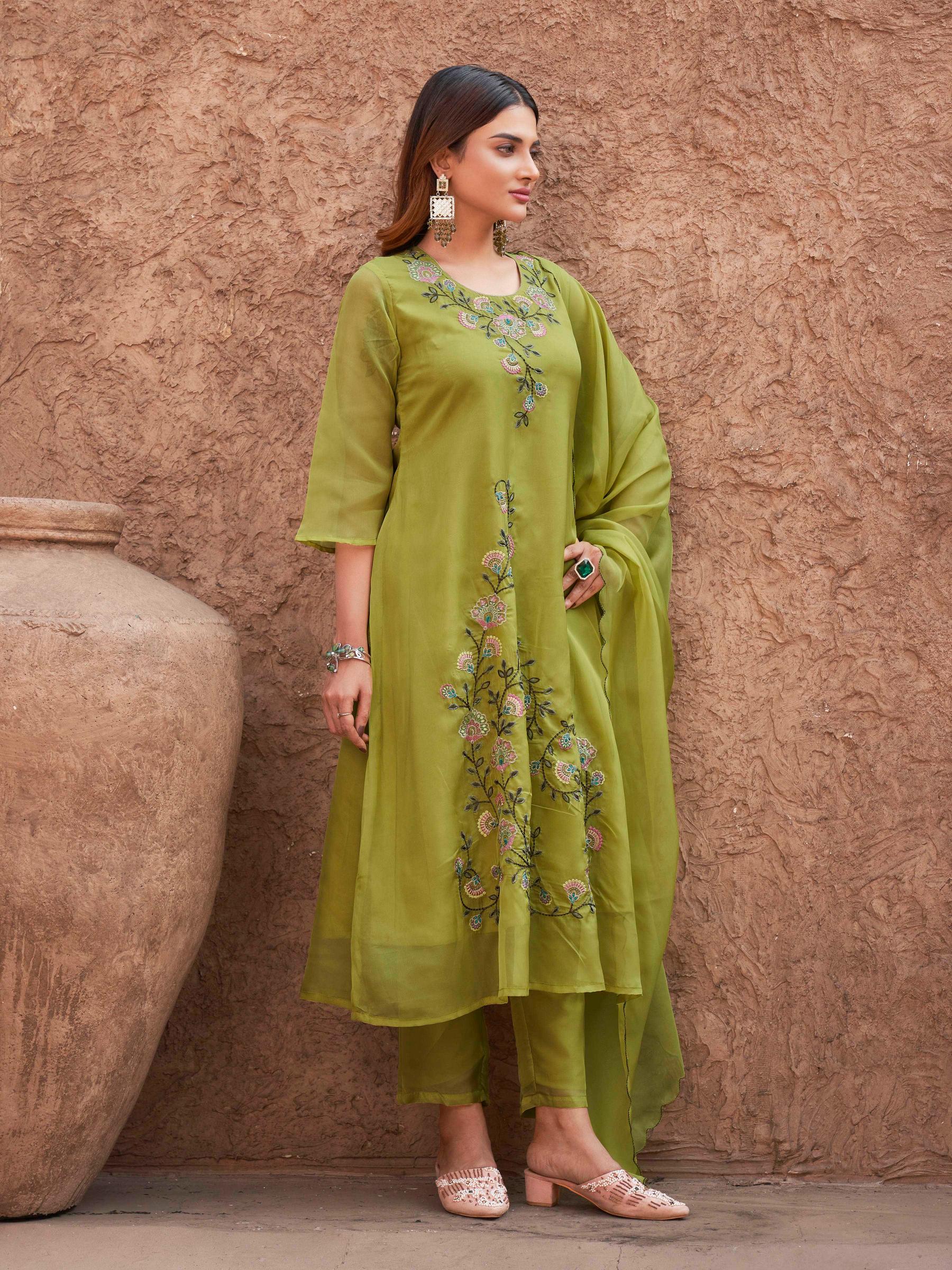 Lime Green Organza With Multi-color Embroidered A-Line Kurta Set
