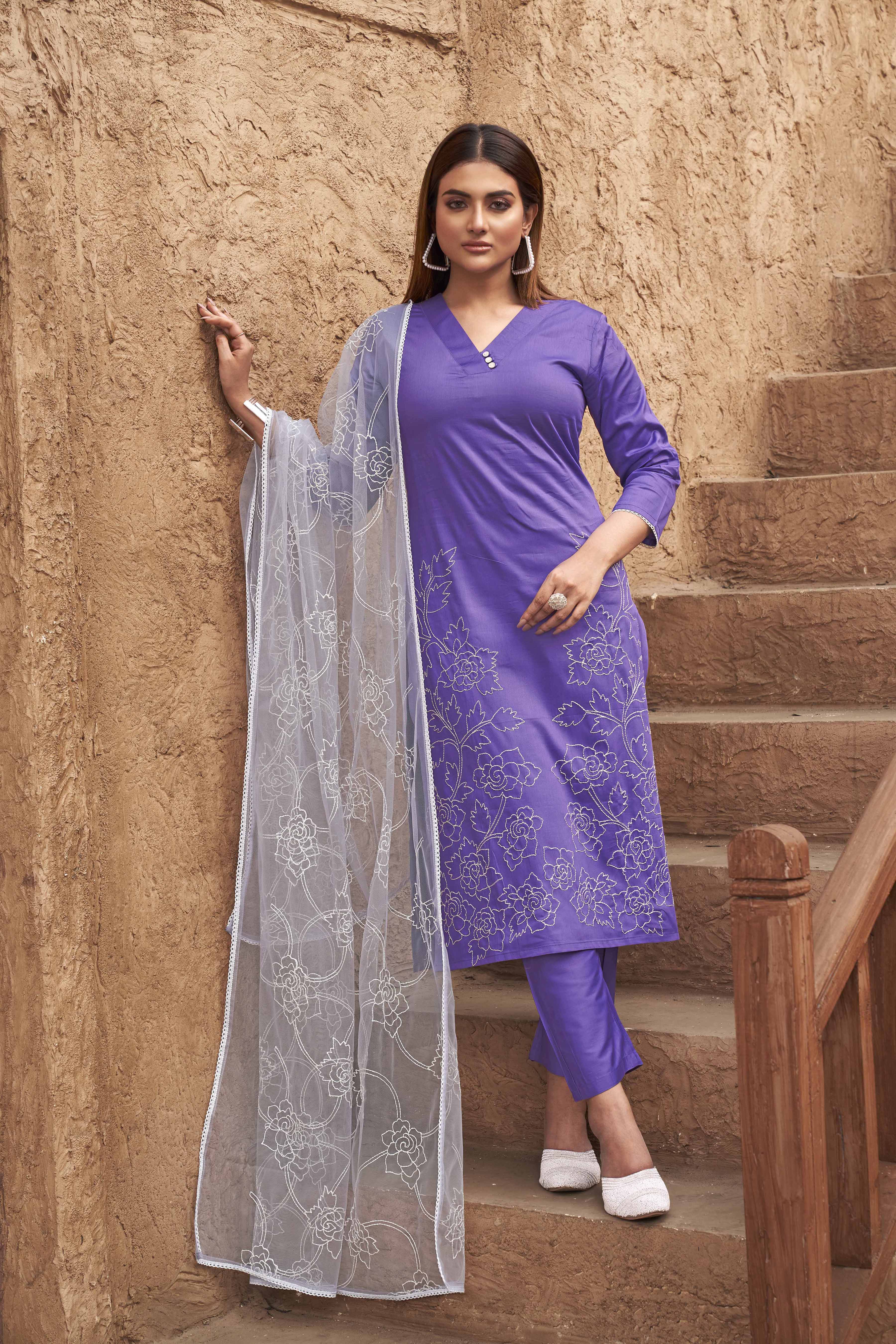 Lilac Color Pure Cotton With Heavy Dupatta & White Thread Embroidery Kurta Set