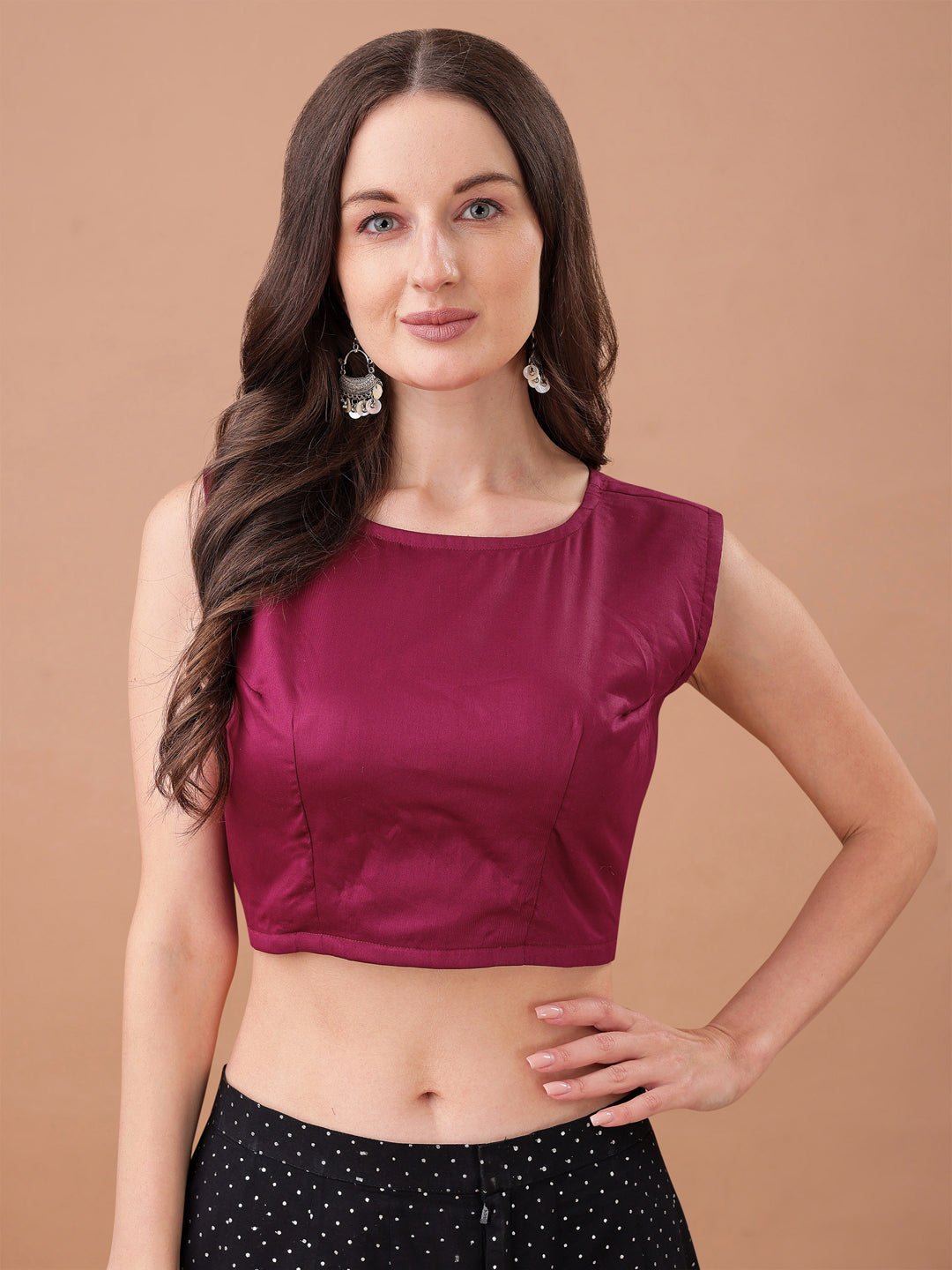 Magenta colored half sleeves tafeta blouse with lace embellishments