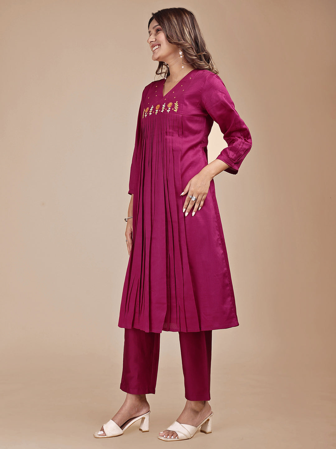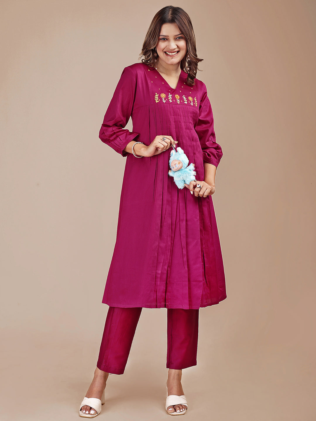 Magenta Colored Cotton Co-ord Set With Embroidered Yoke A-Line