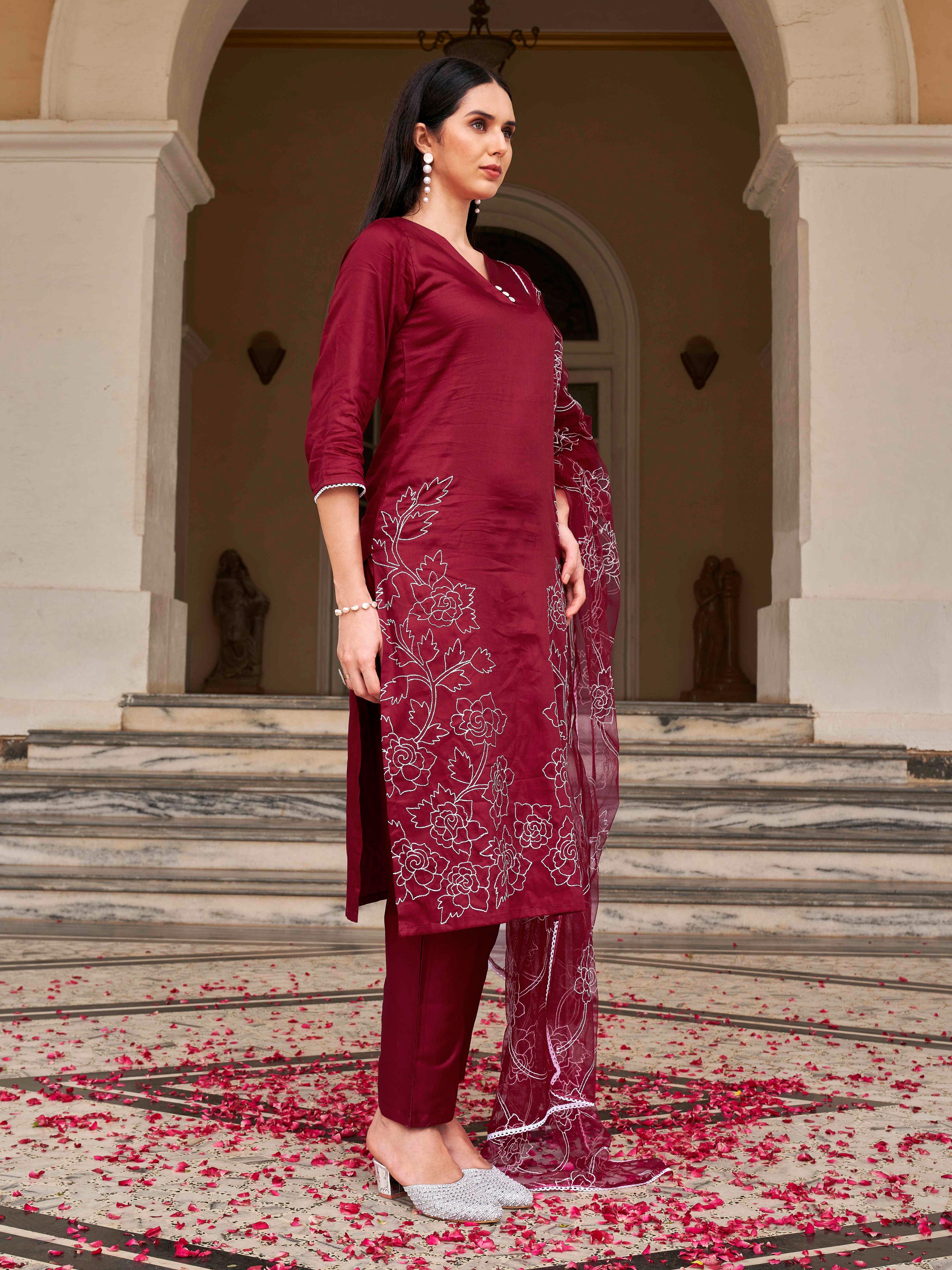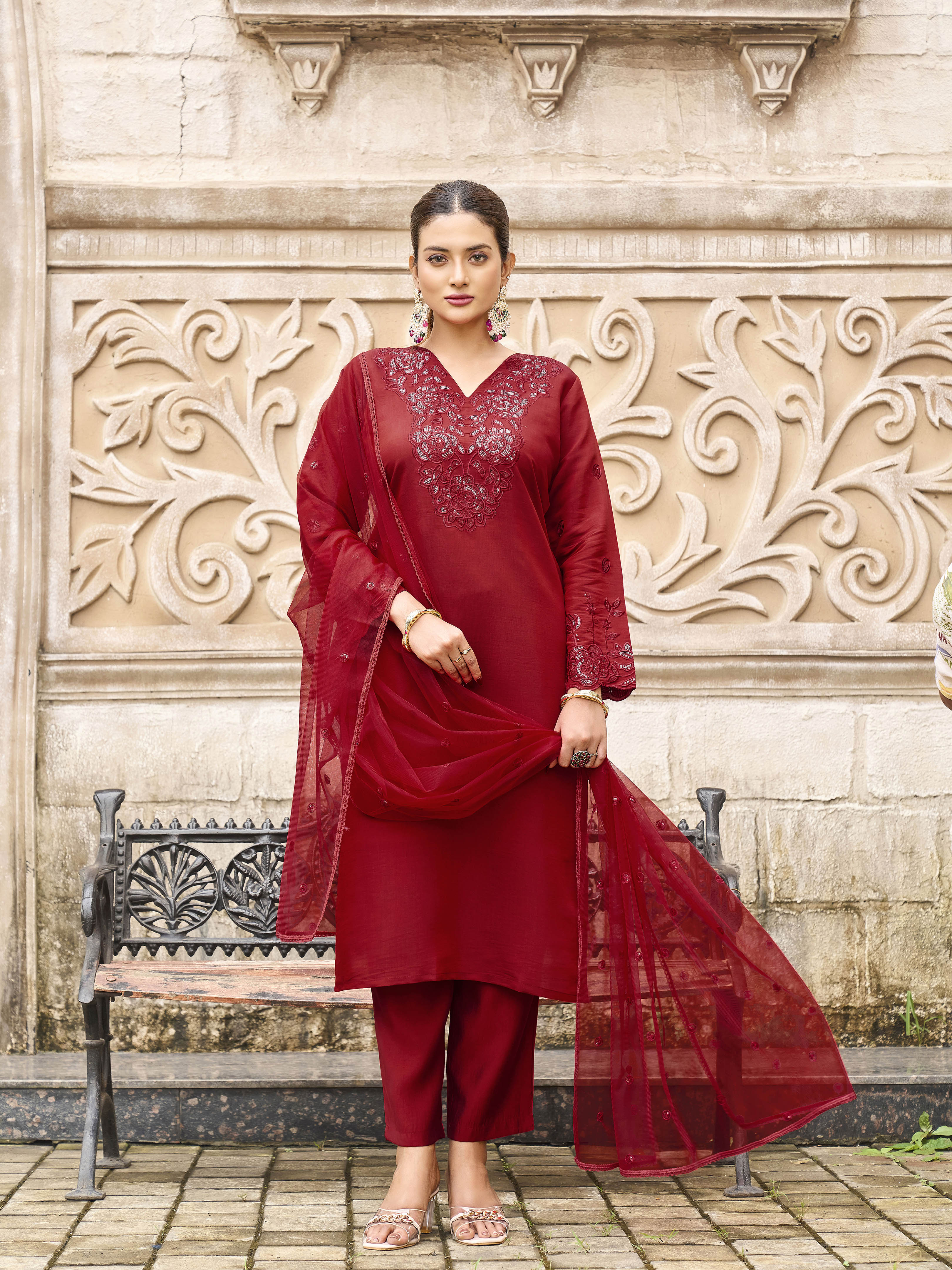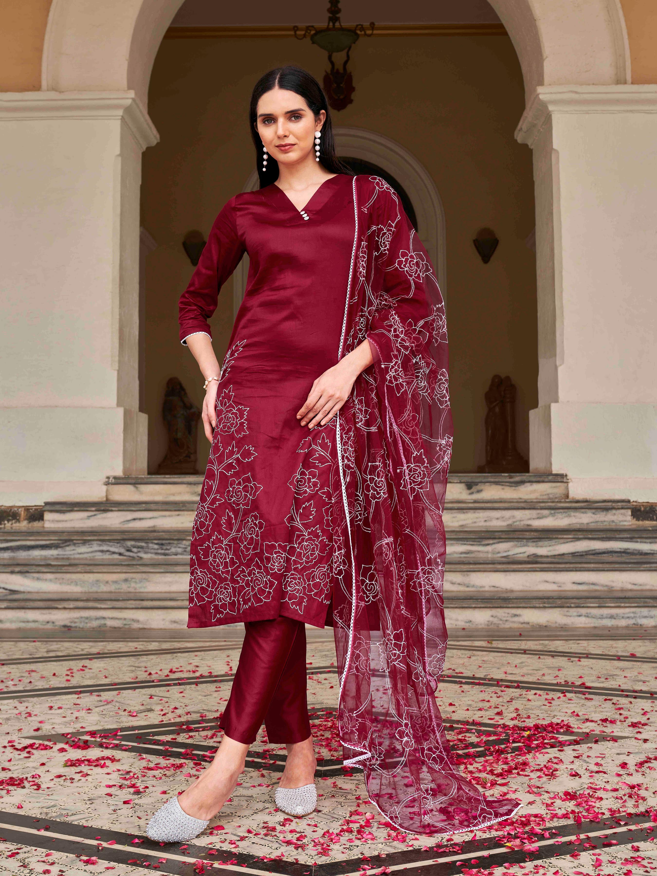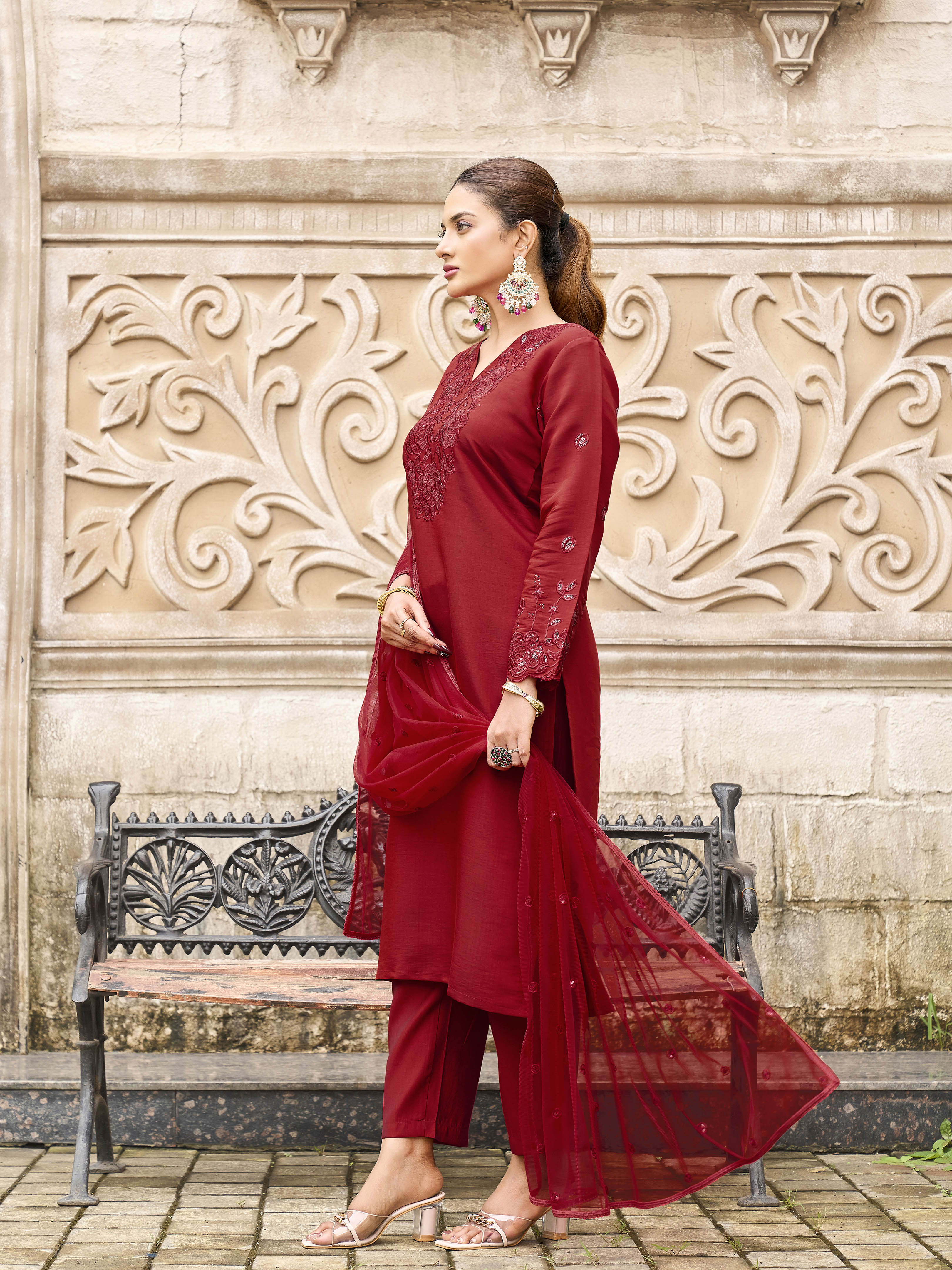 Maroon color silk blend with thread & sequence work kurta & trouser with dupatta set