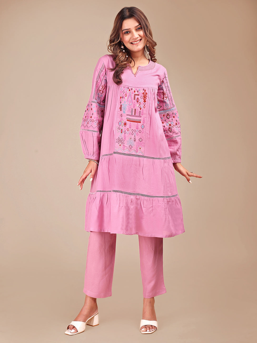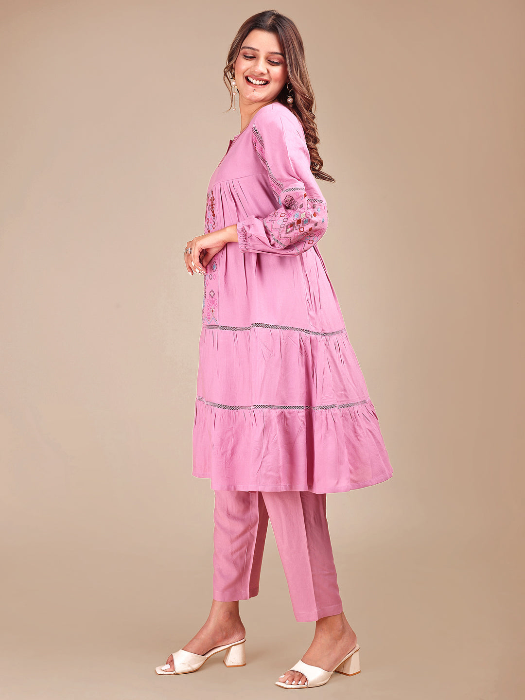 Mauve Colored Contrast Embroidered Rayon Empire Co-ord Set