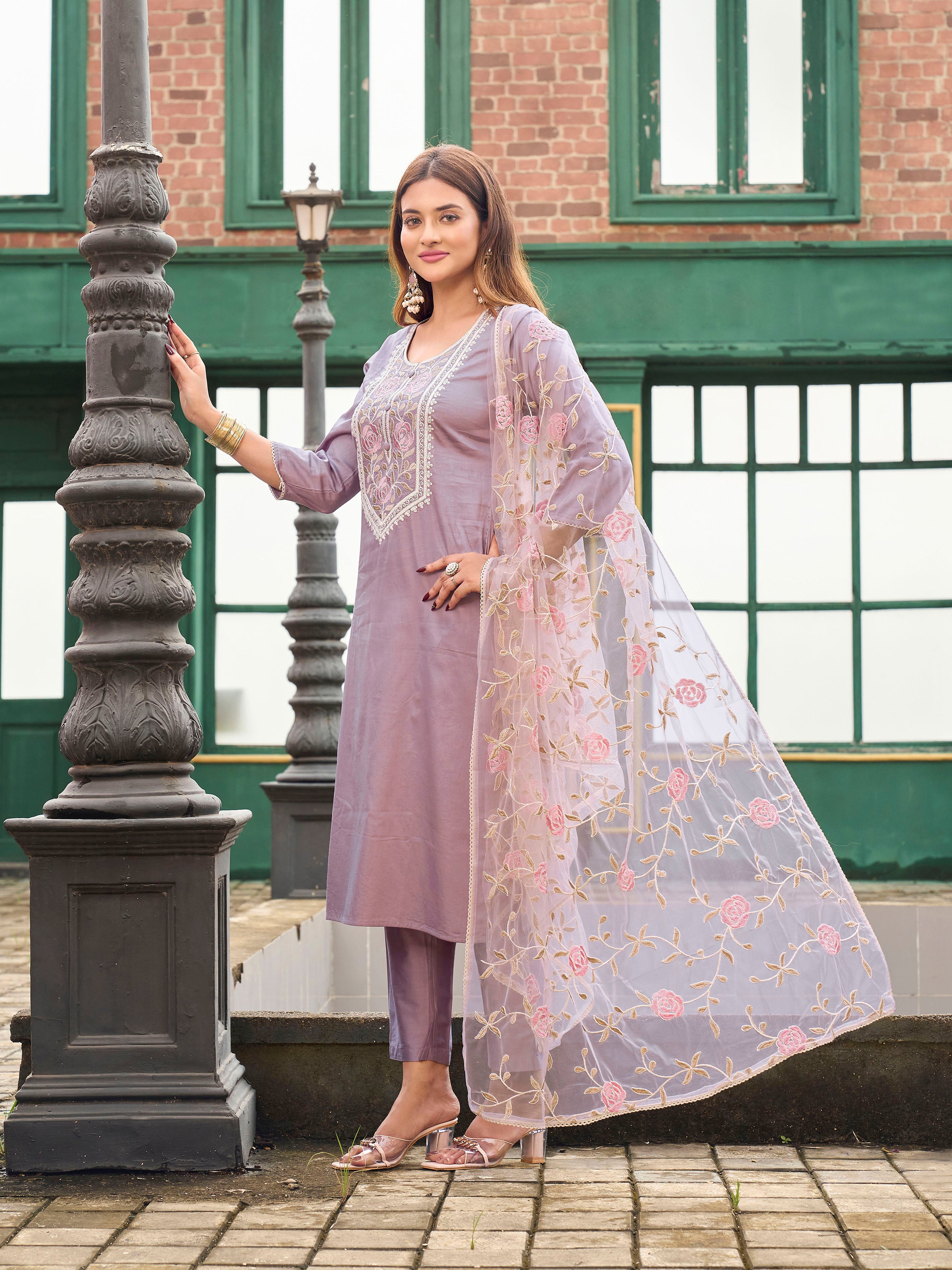 Mauve color pure cotton with off white thread embroidered kurta & trouser with dupatta set
