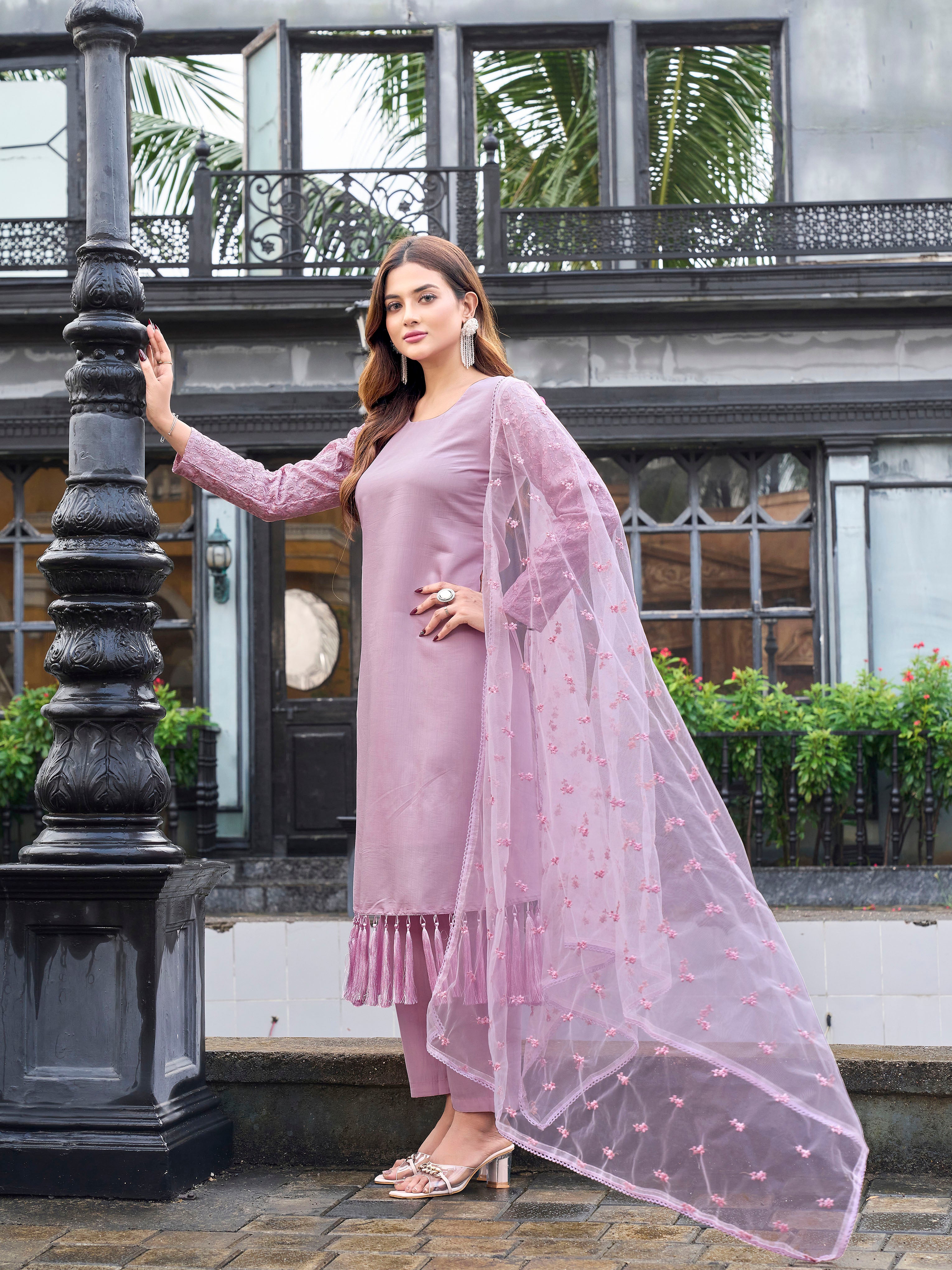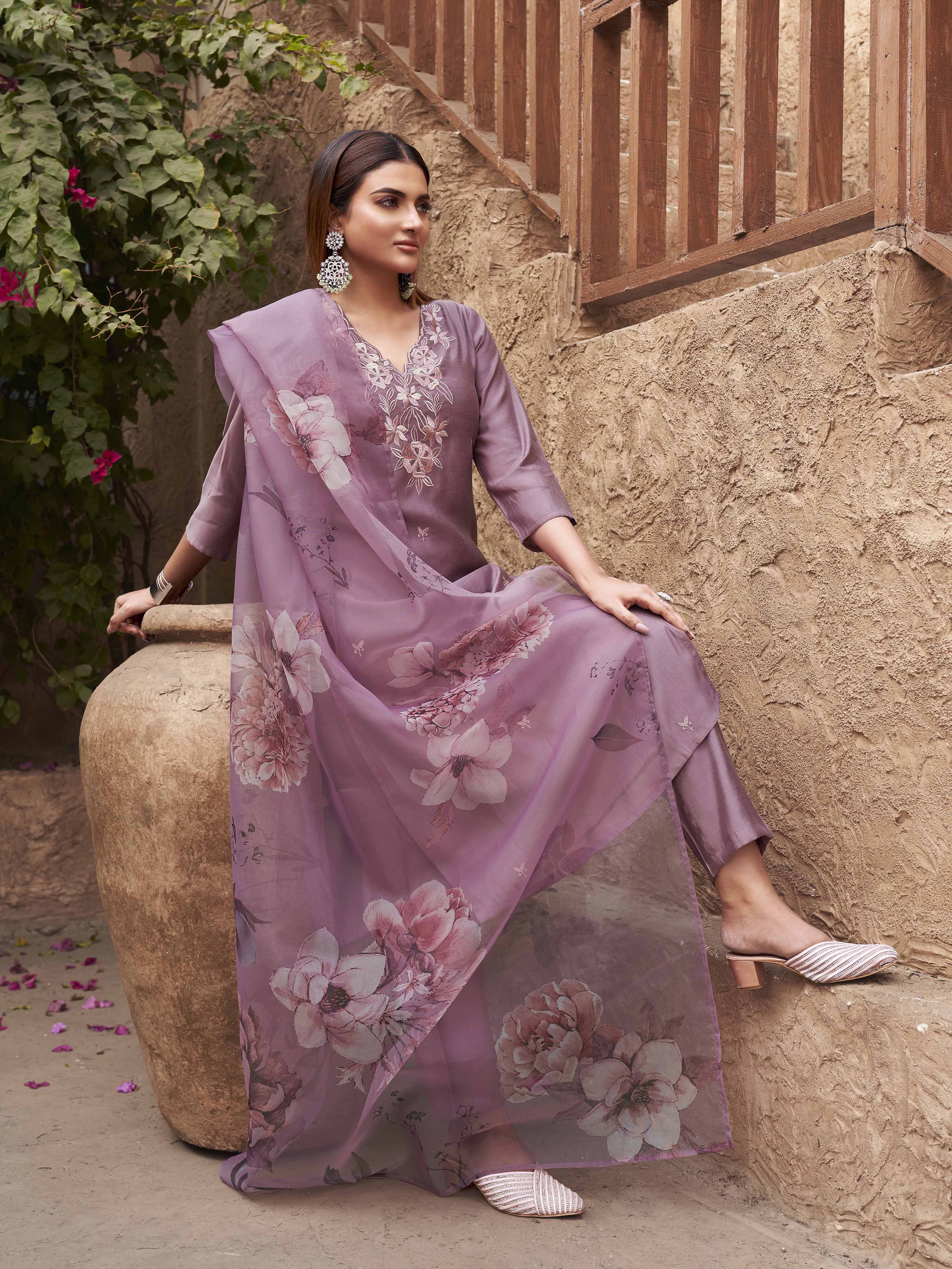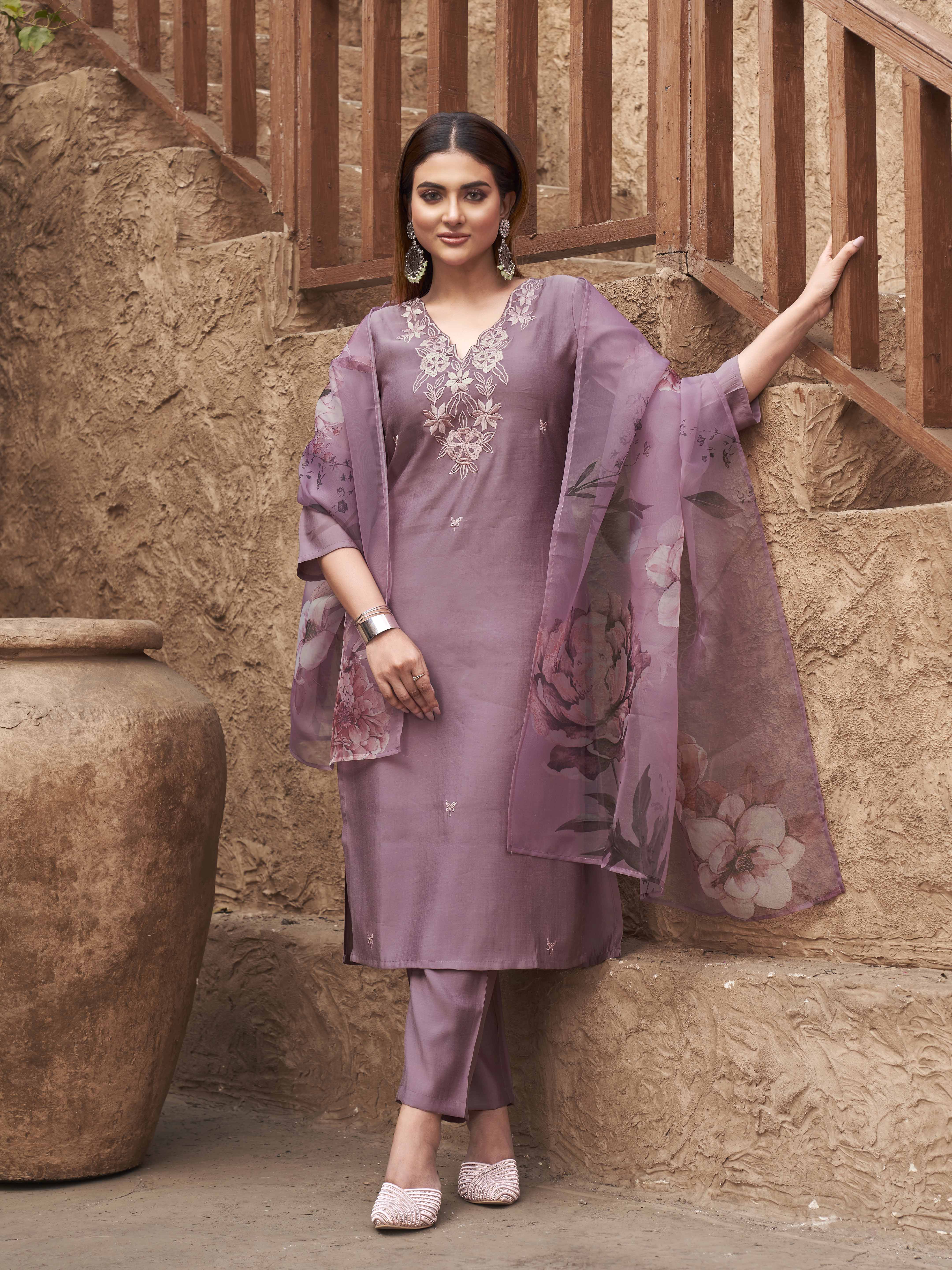Mauve Color Silk Blend With Printed Dupatta & Light Shade Embroidery Kurta Set