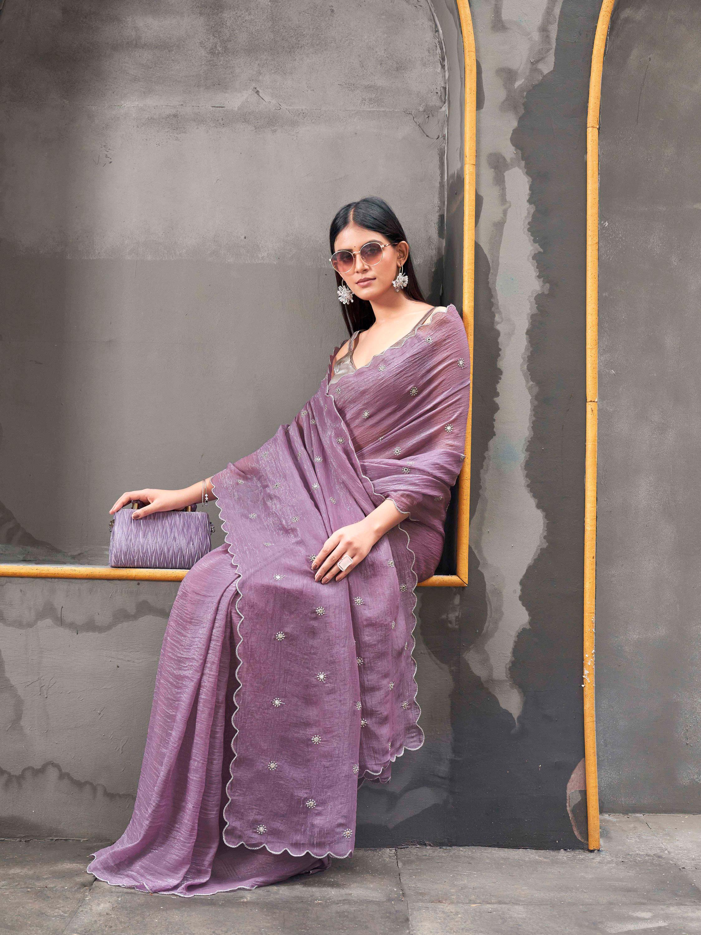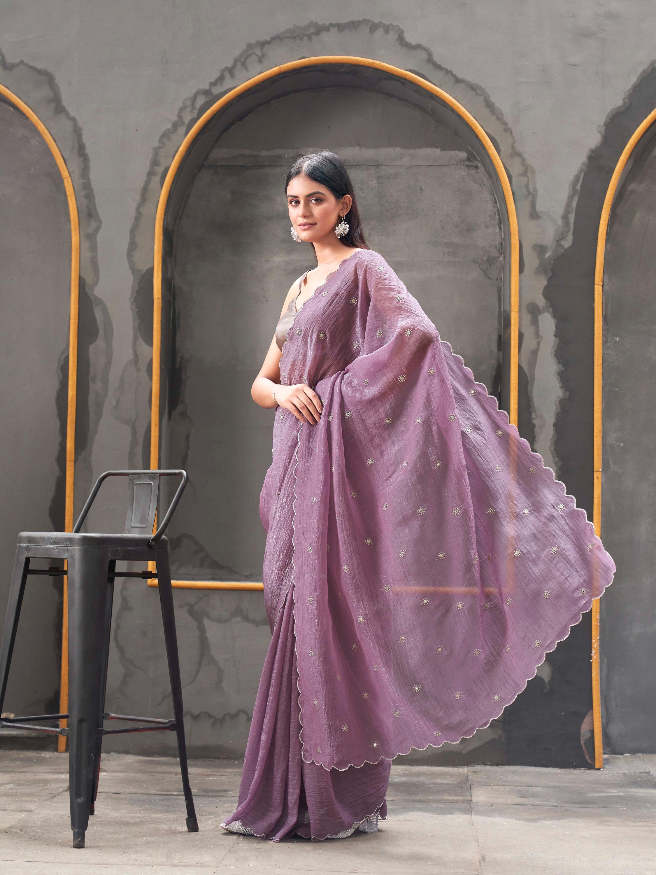 Mauve colored crunchy saree with mirror embroidery on pallu and scalloped border