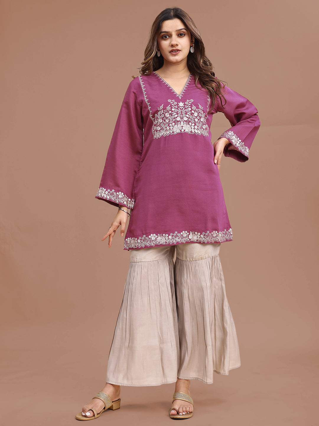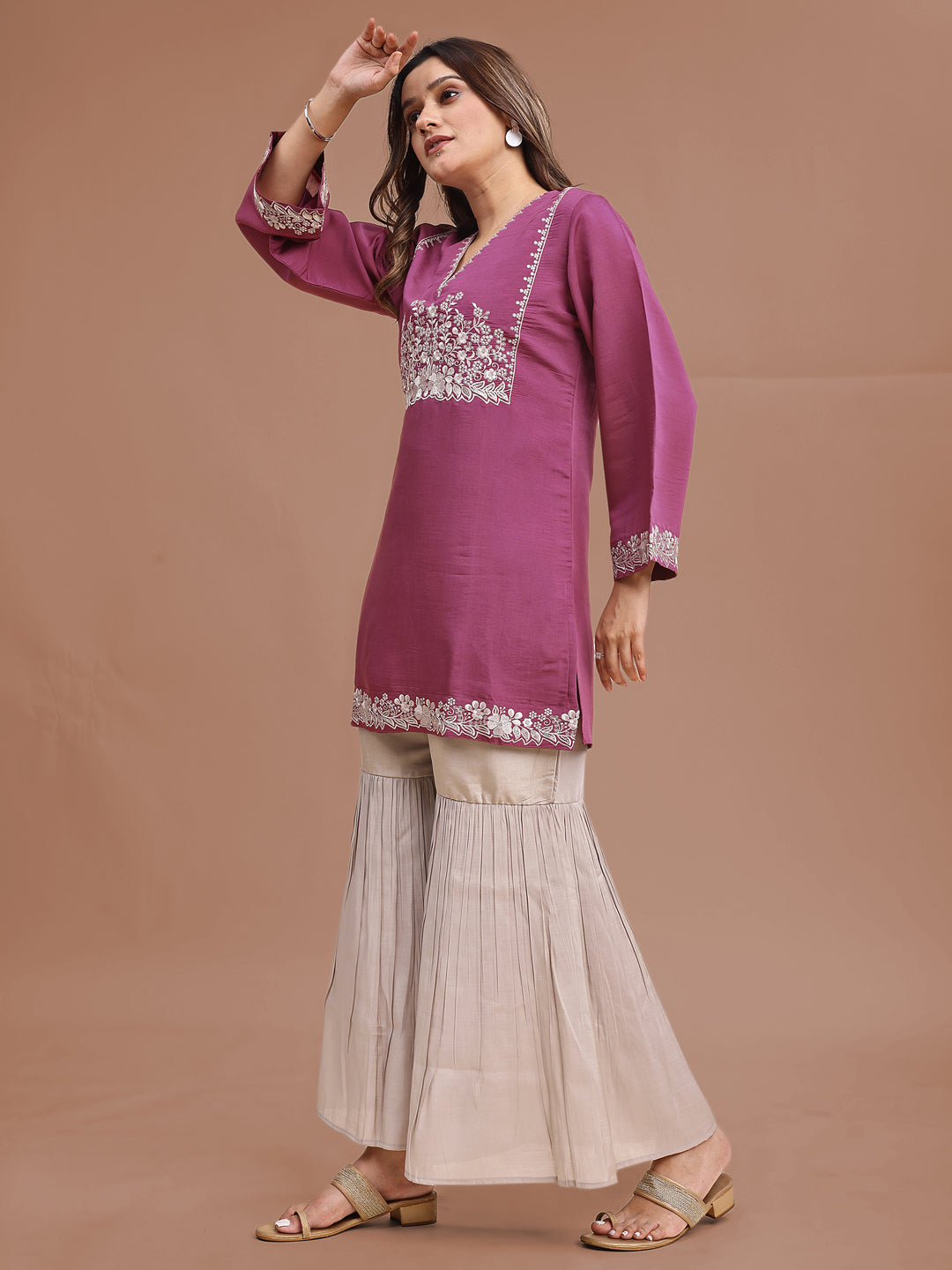 Mauve Color Silk Blend Embroidered Top With Beige Sharara