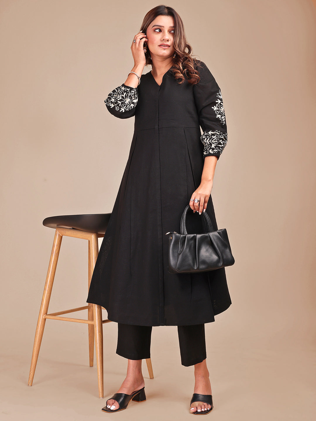 Black Colored Cotton Embroidered Sleeveless Empire A-Line Co-ord Set