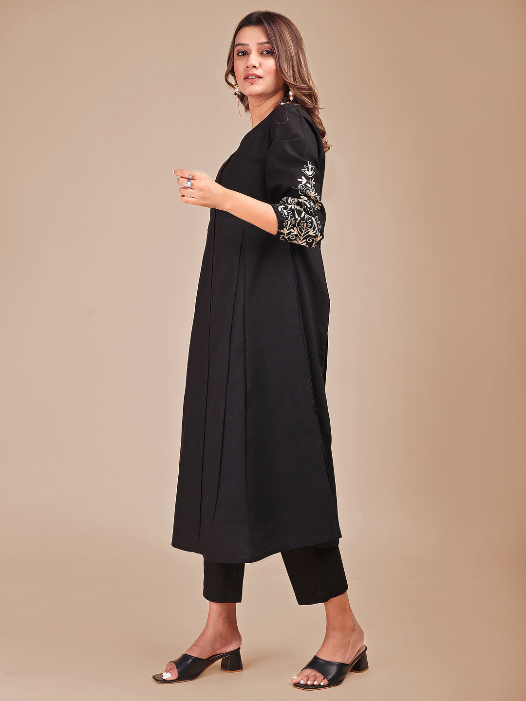 Black Colored Embroidered Chanderi Shirt With Pant Co-ord Set