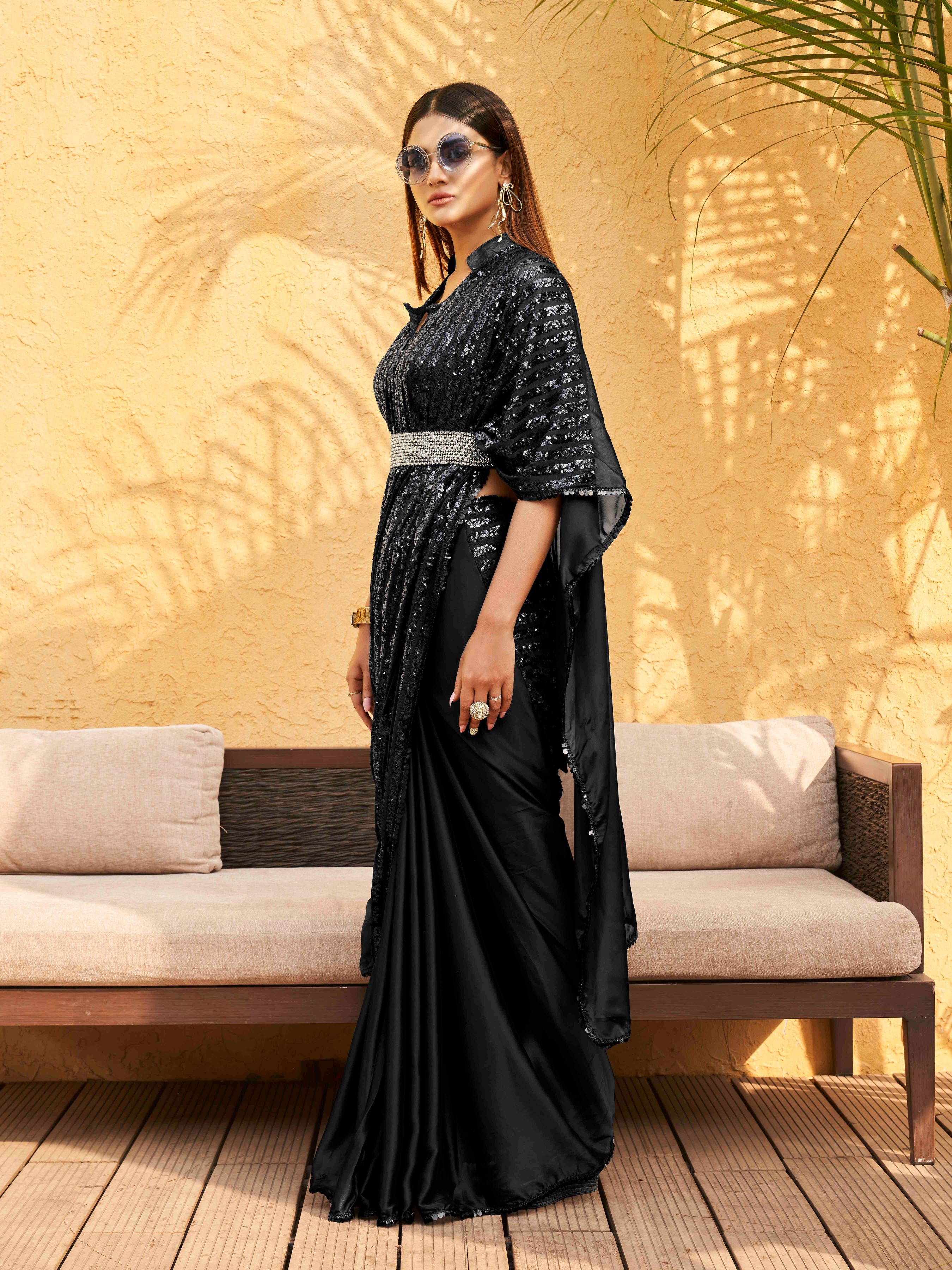 Black Colored Sequinned Kaftan Saree with Belt with Unstitched Blouse