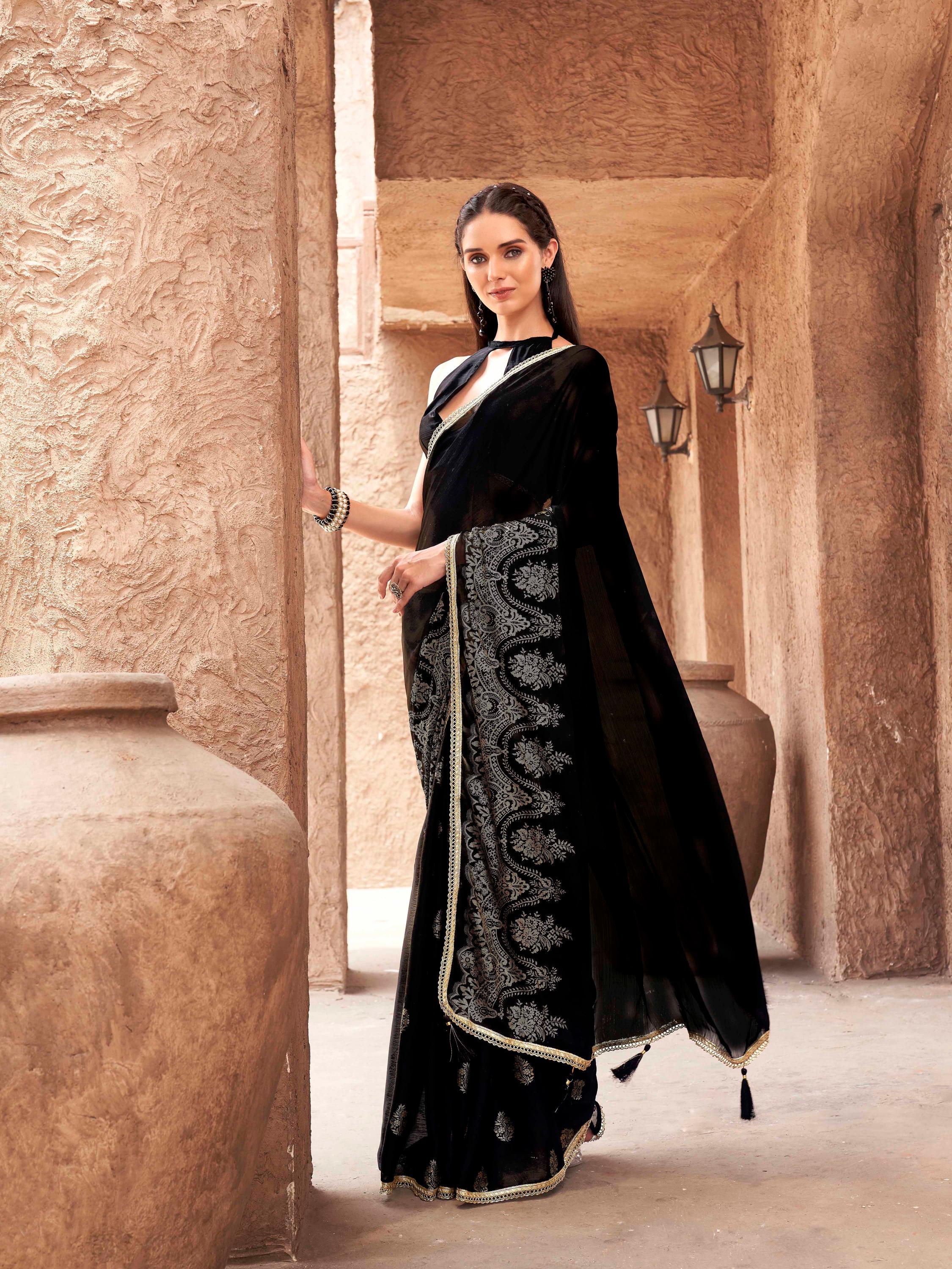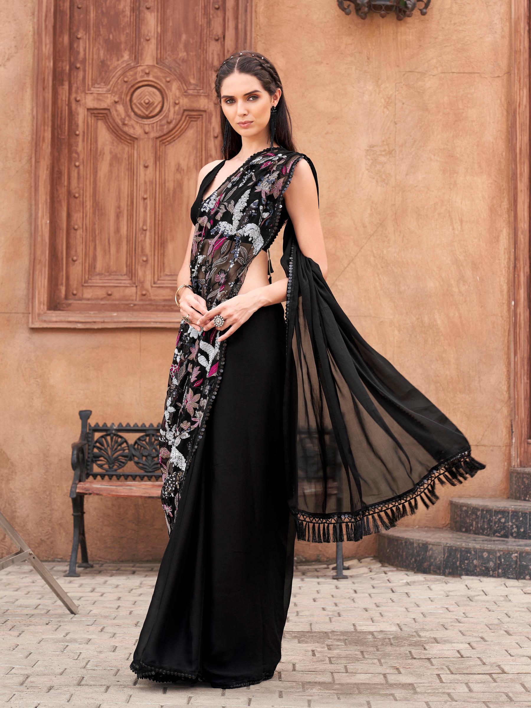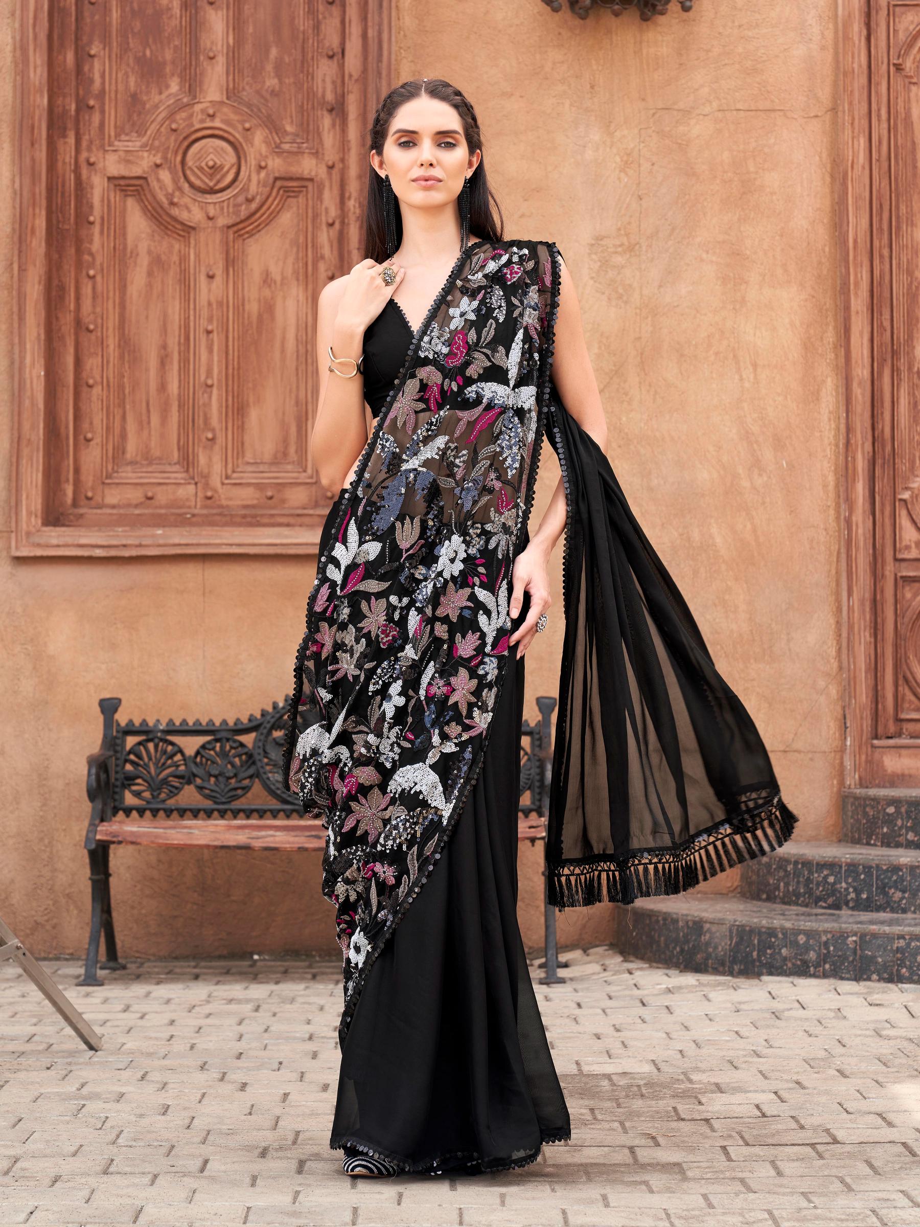 Black colored designer saree with sequence and beads embroidery on shoulder portion