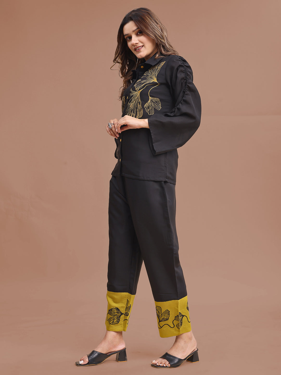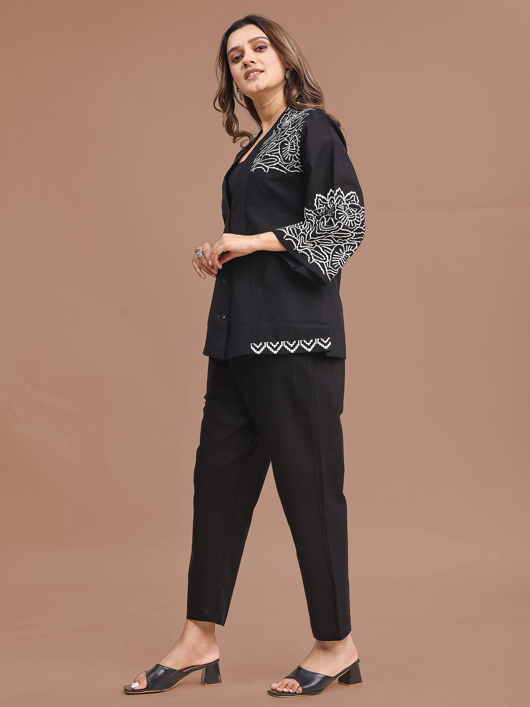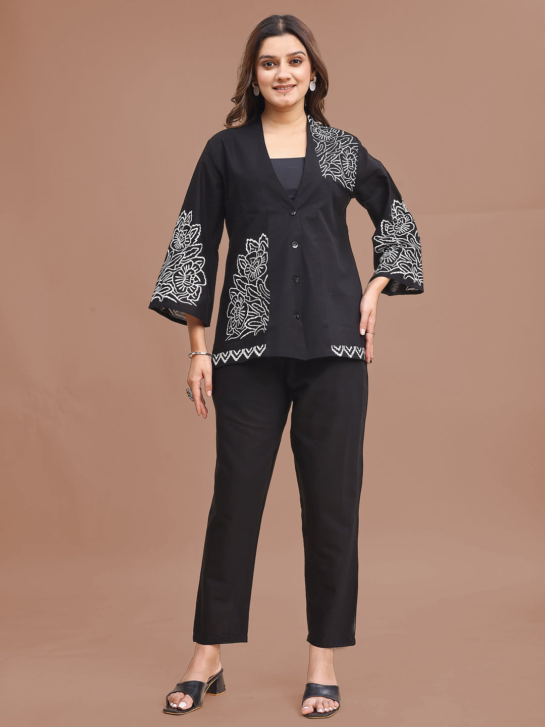 Black Colored Pure Cotton With Black Thread Embroidered Shirt & Trouser Co-ord Set