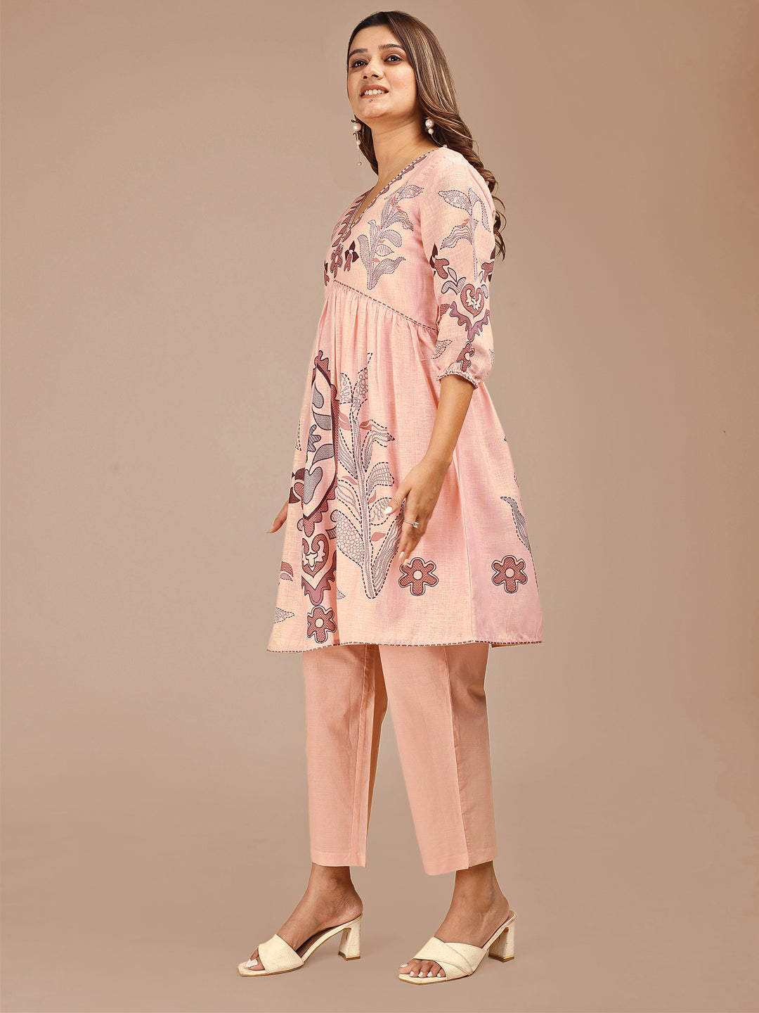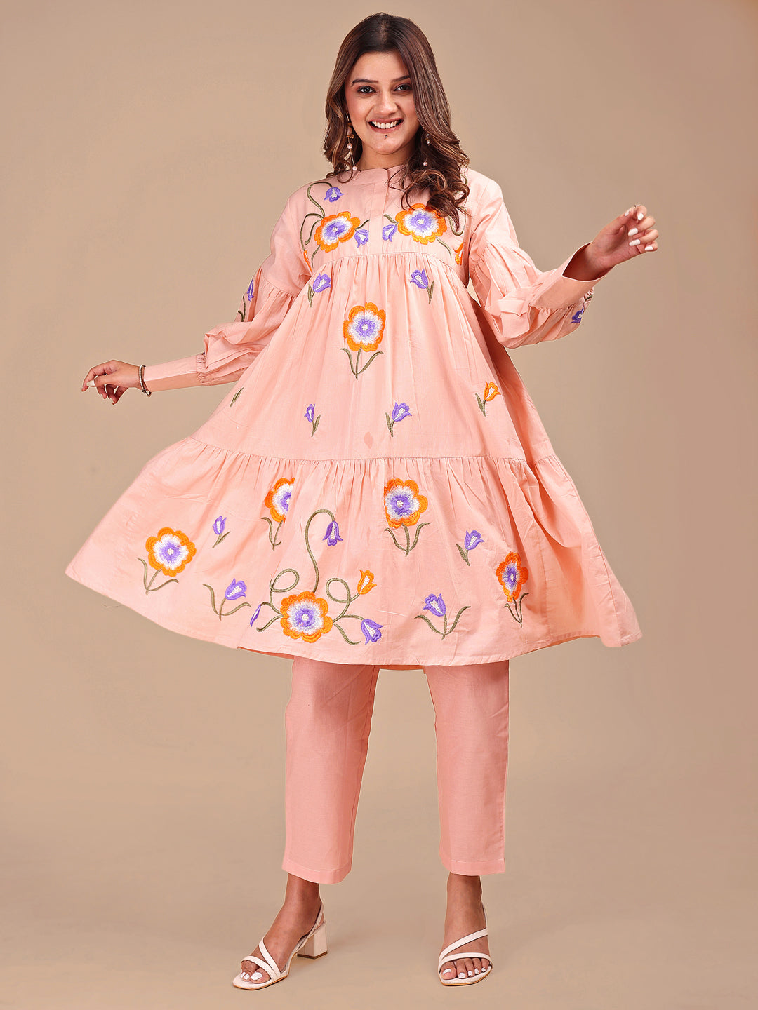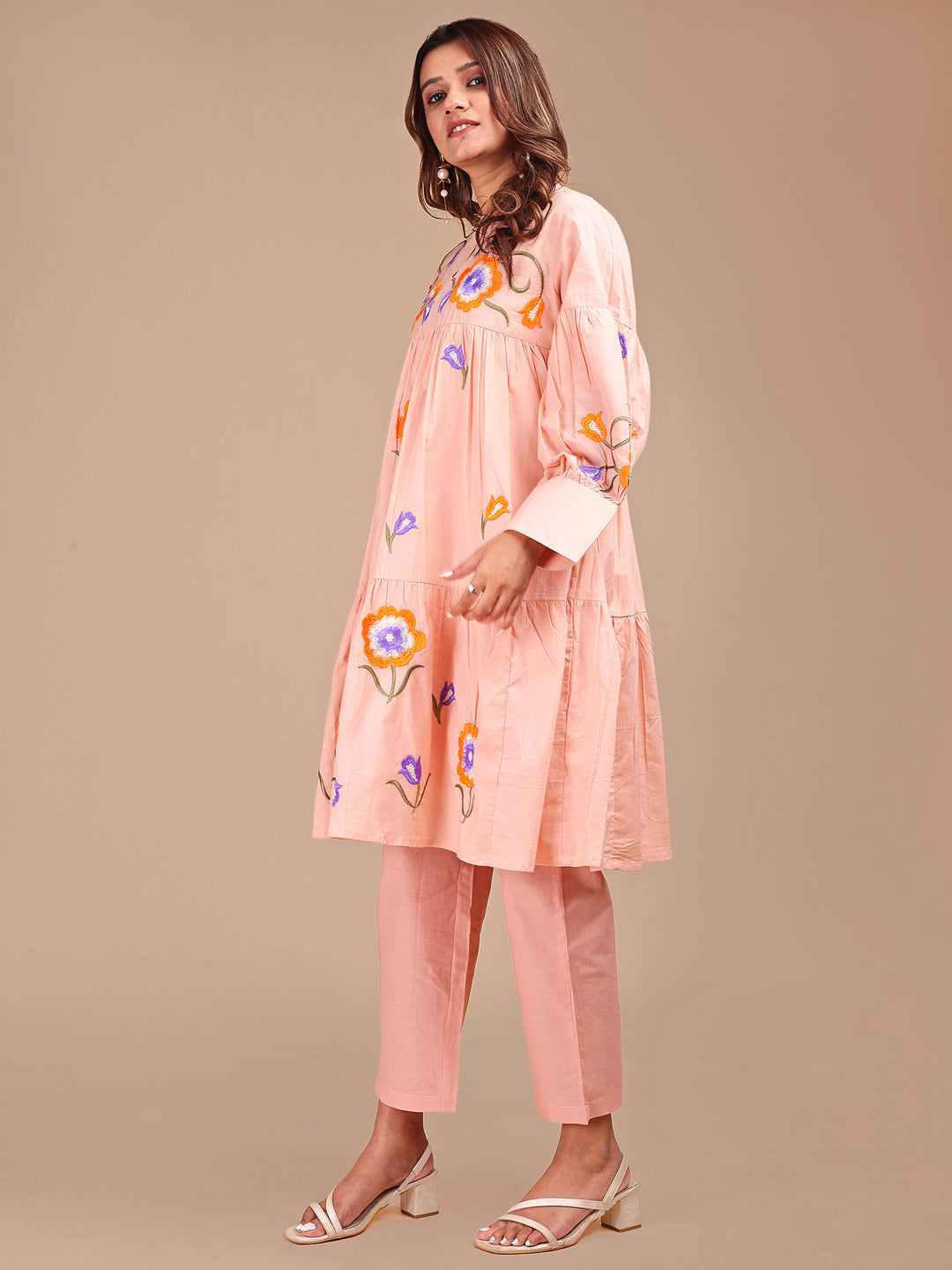 Peach Colored Cotton Tiered Co-ord Set With All Over Embroidery