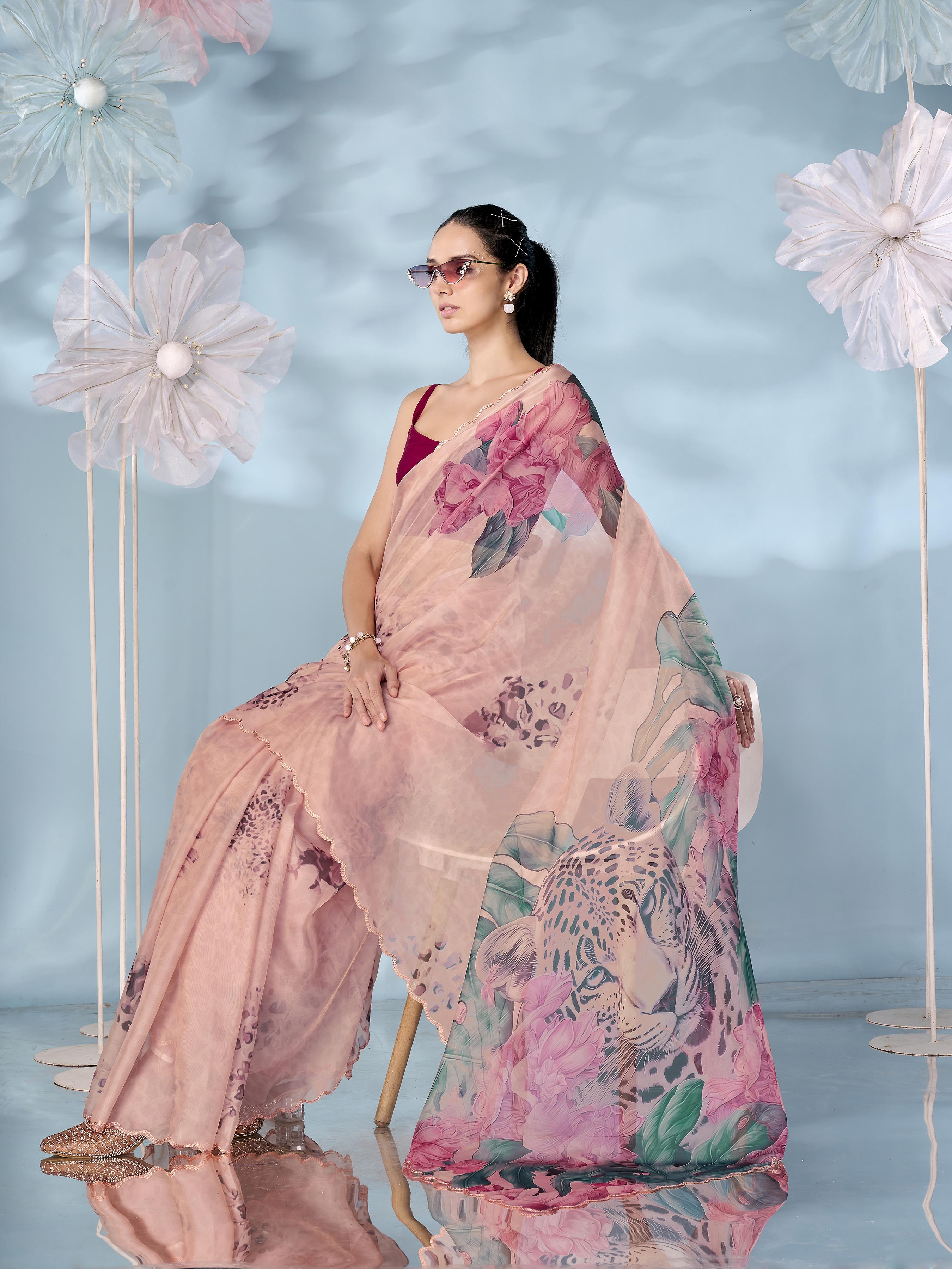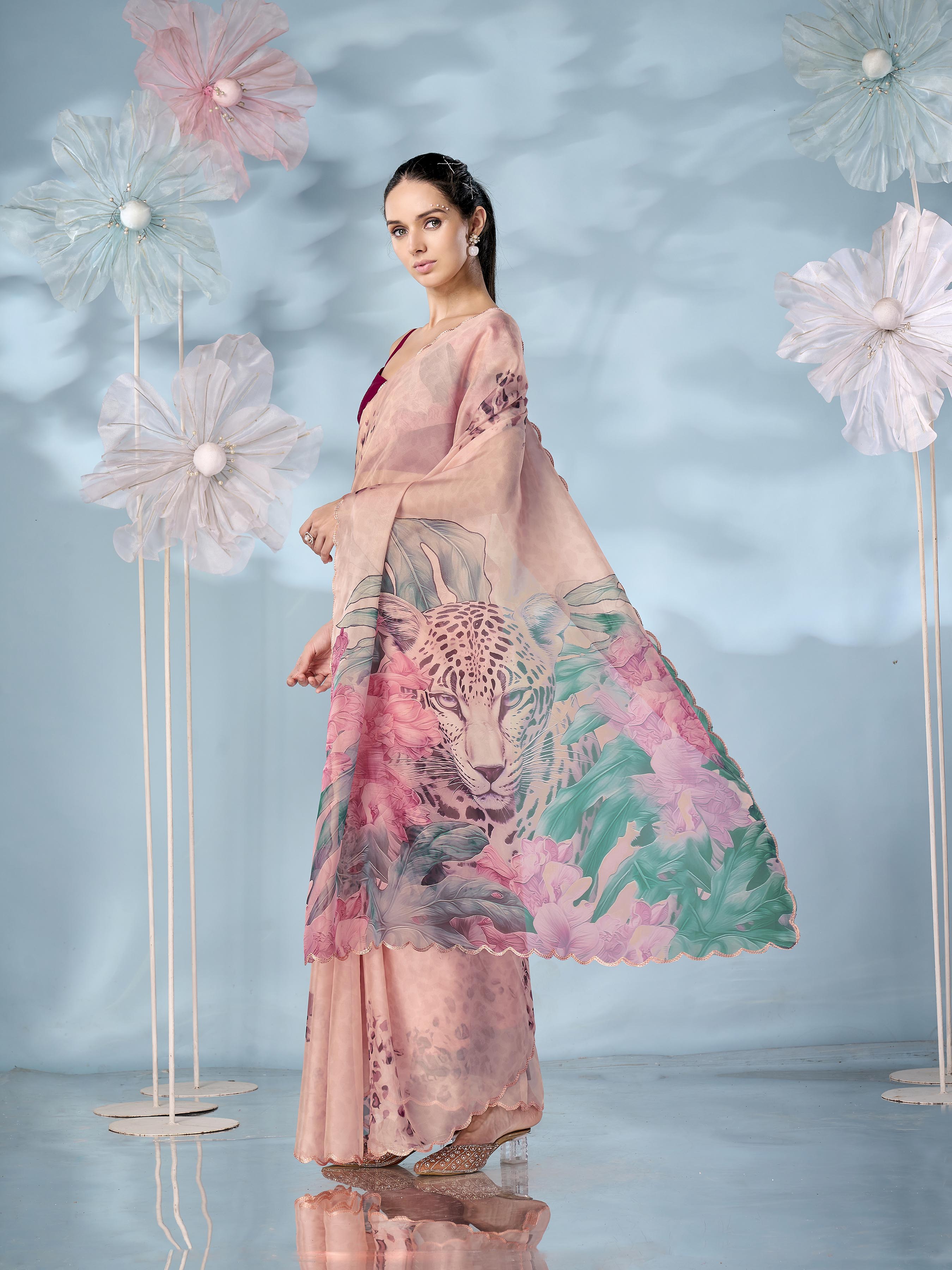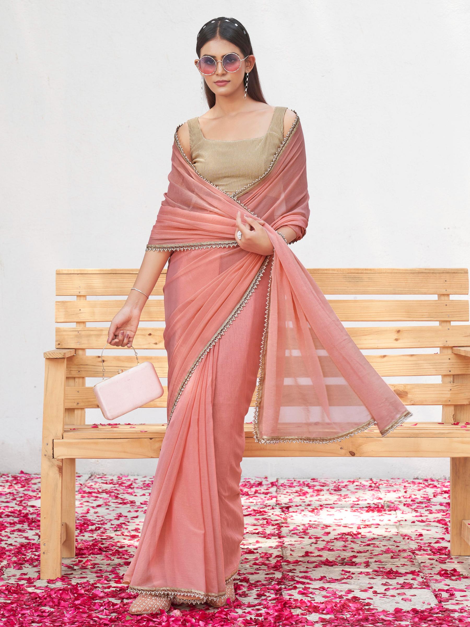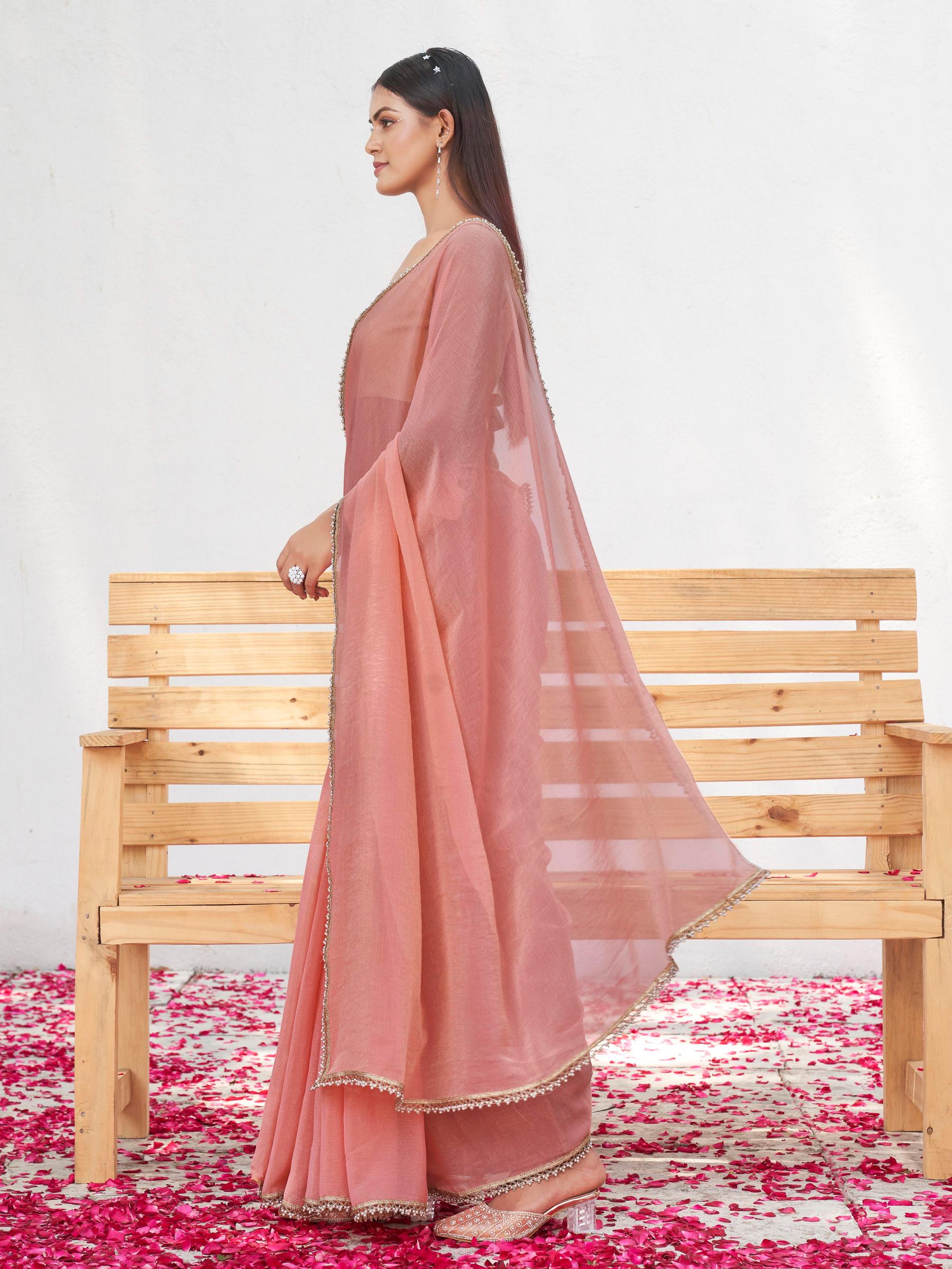 Peach colored crushed organza saree with designer lace and brocade blouse