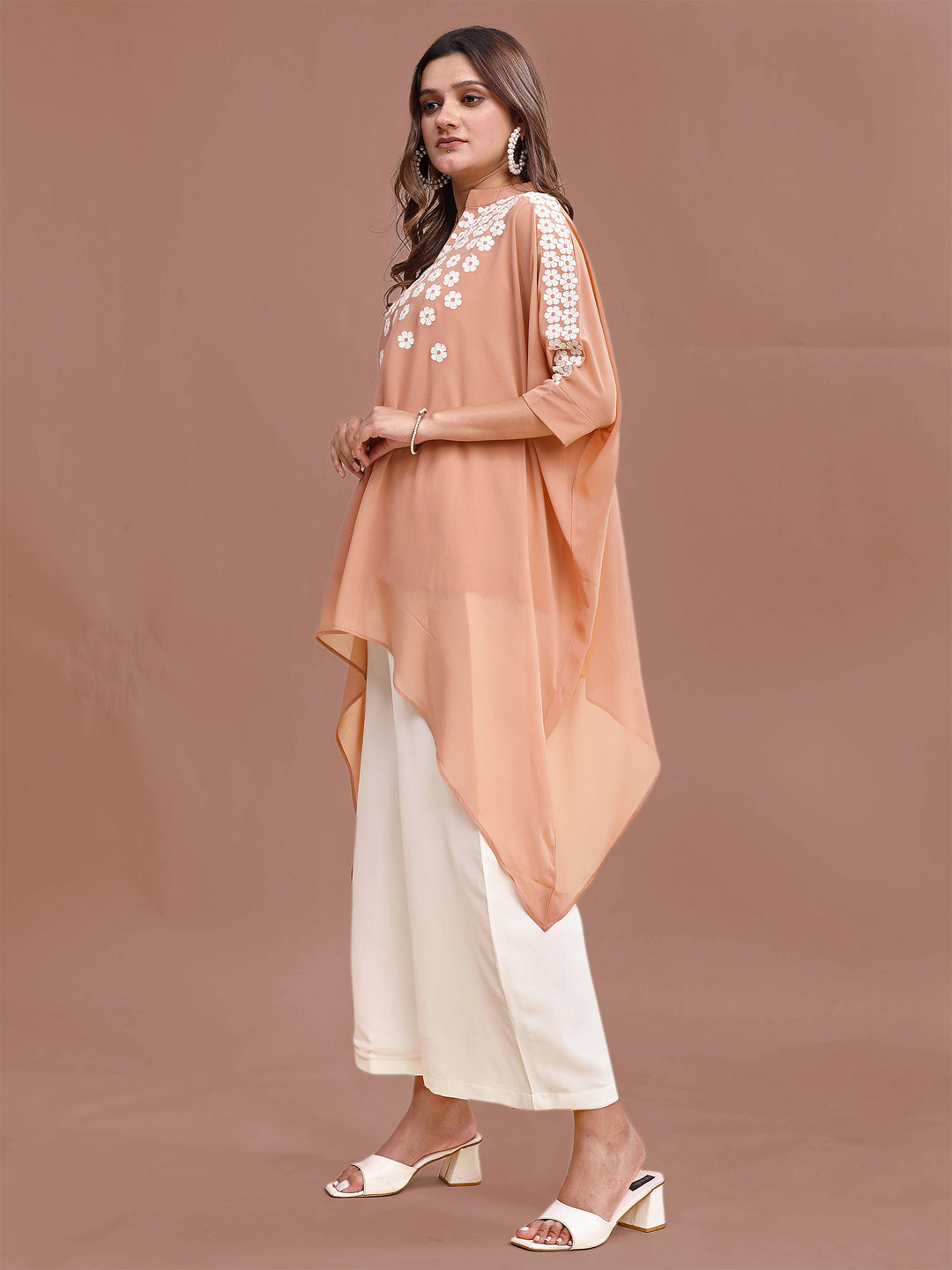 Peach Colored Georgette Kaftan With White Thread Embroidered Co-ord Set