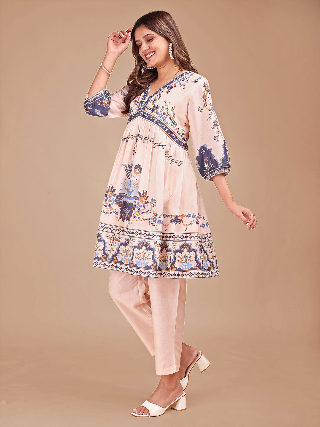 peach colored saree with mirror embroidery on pallu and scalloped border
