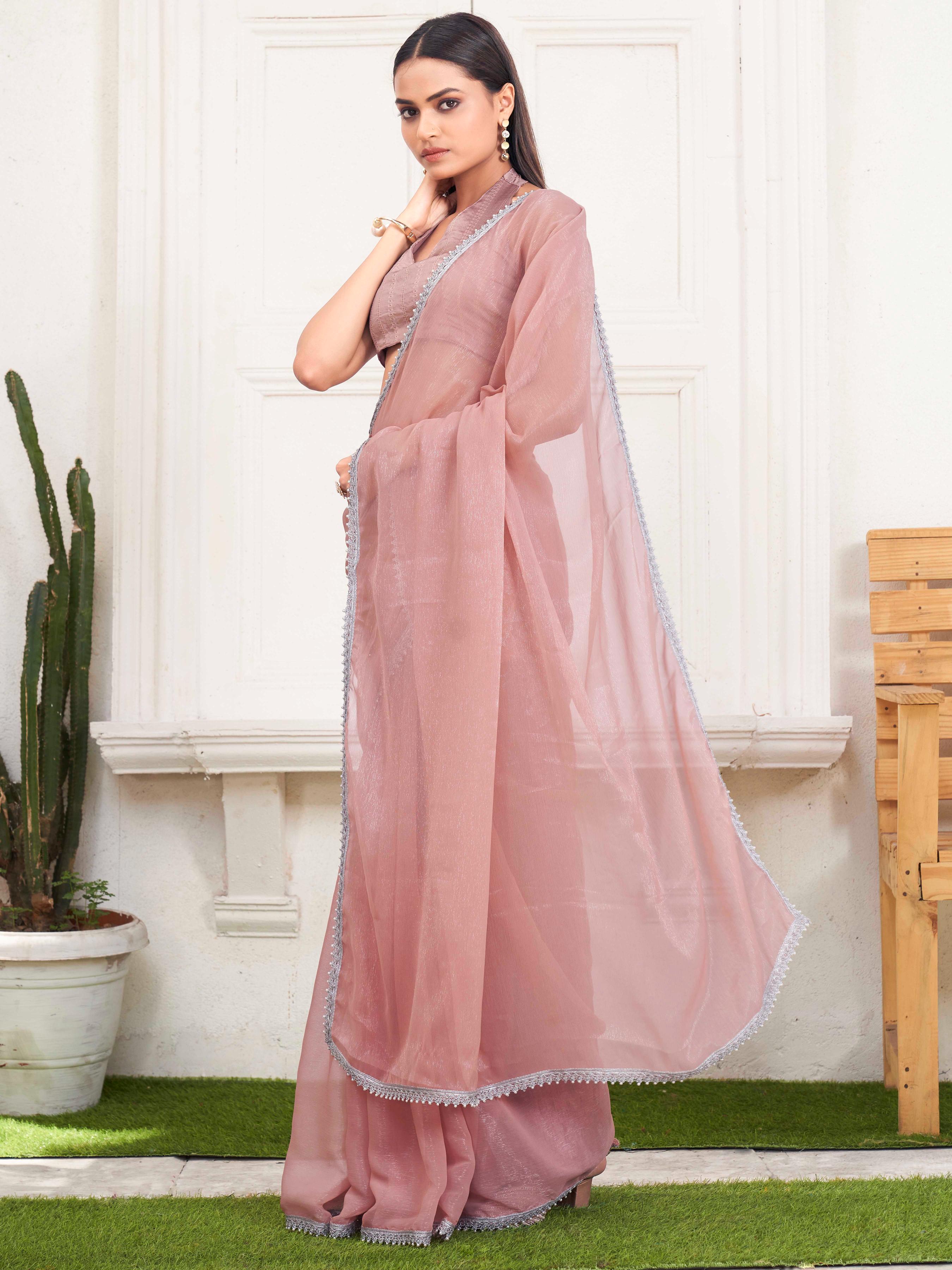 Peach colored shimmer chiffon saree with embellished lace and brocade blouse