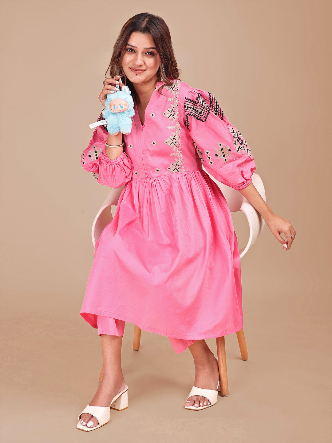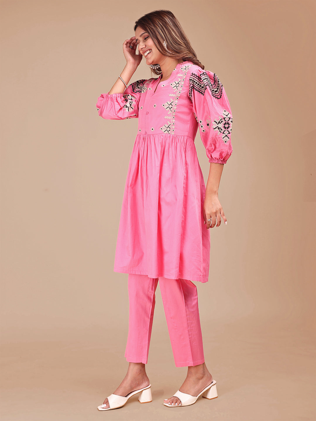 Pink Colored Stylized Thread Work Cotton Blend Co-ord Set
