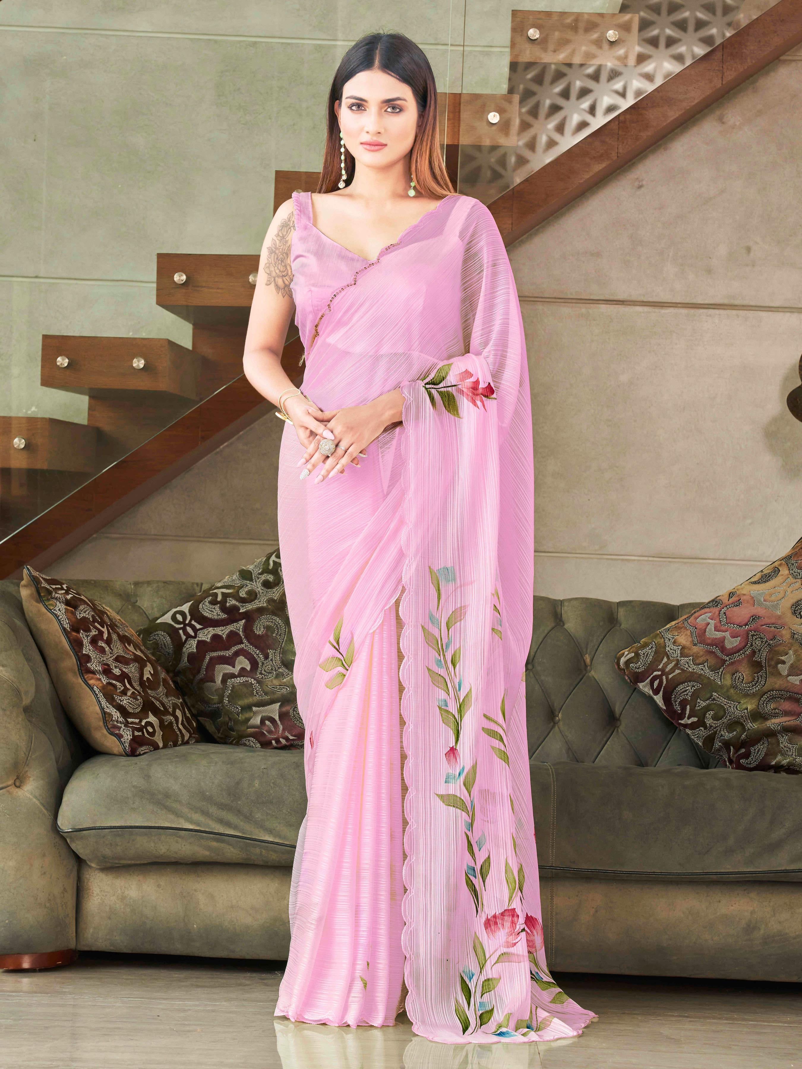 Pink colored striped shimmer saree with floral hand print and scalloped border