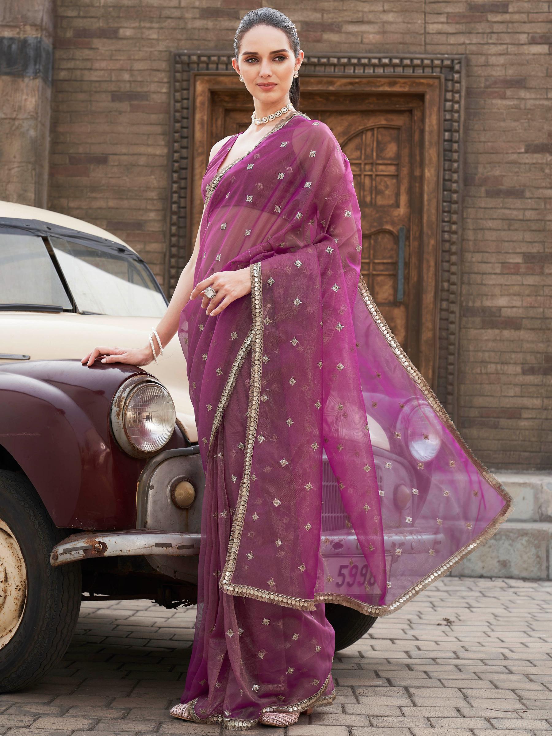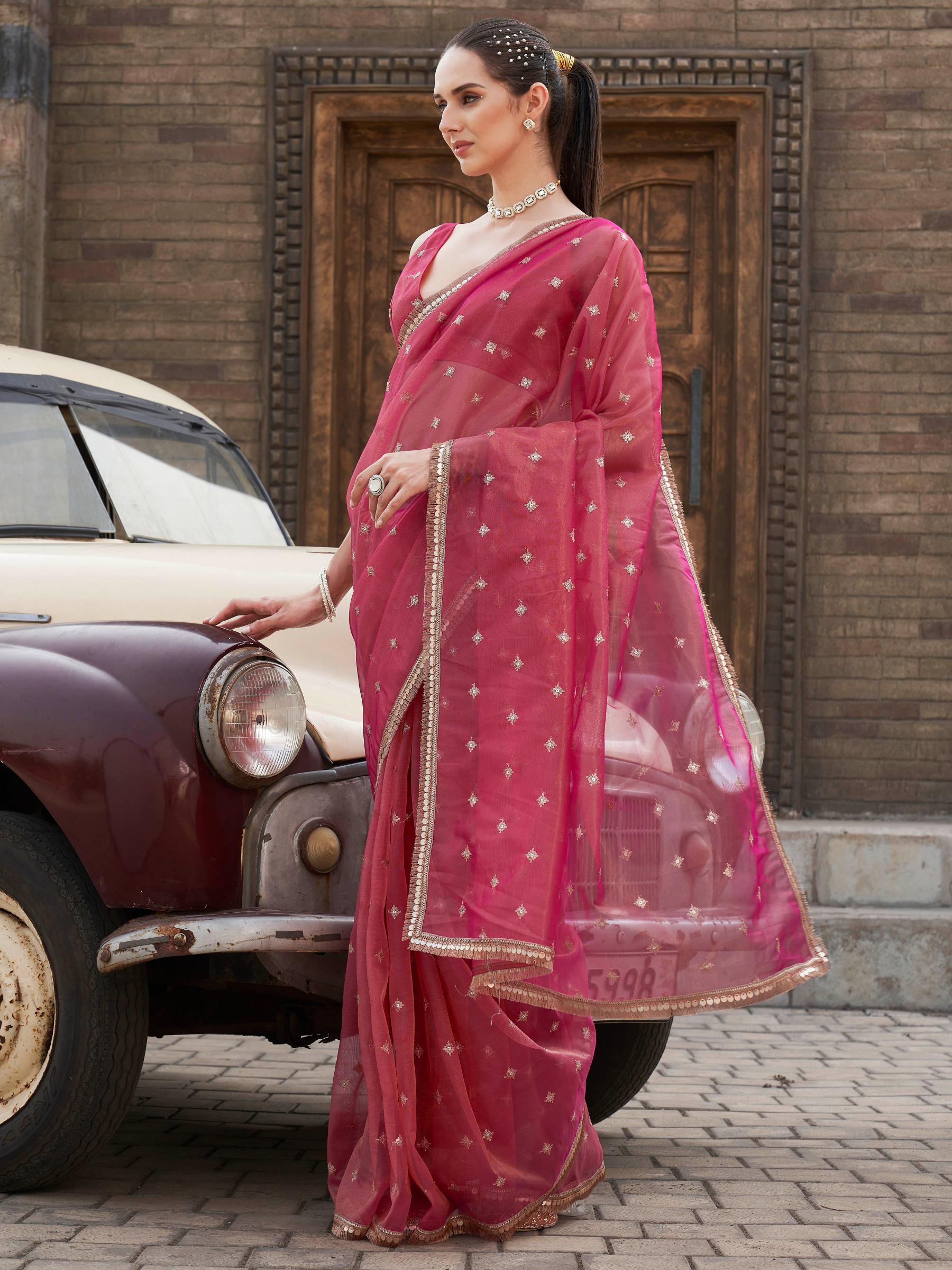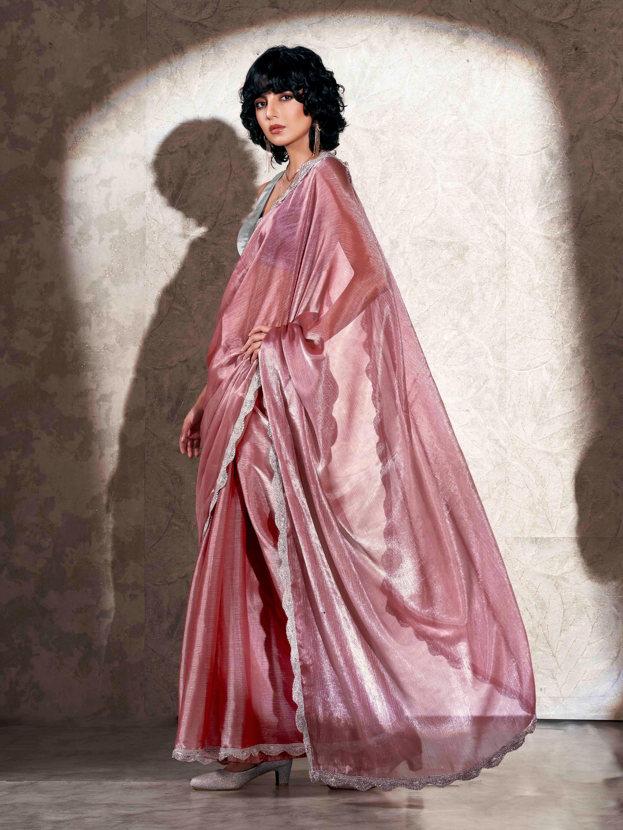 Pink colored shimmer net saree with sequinned butti and embroidered border