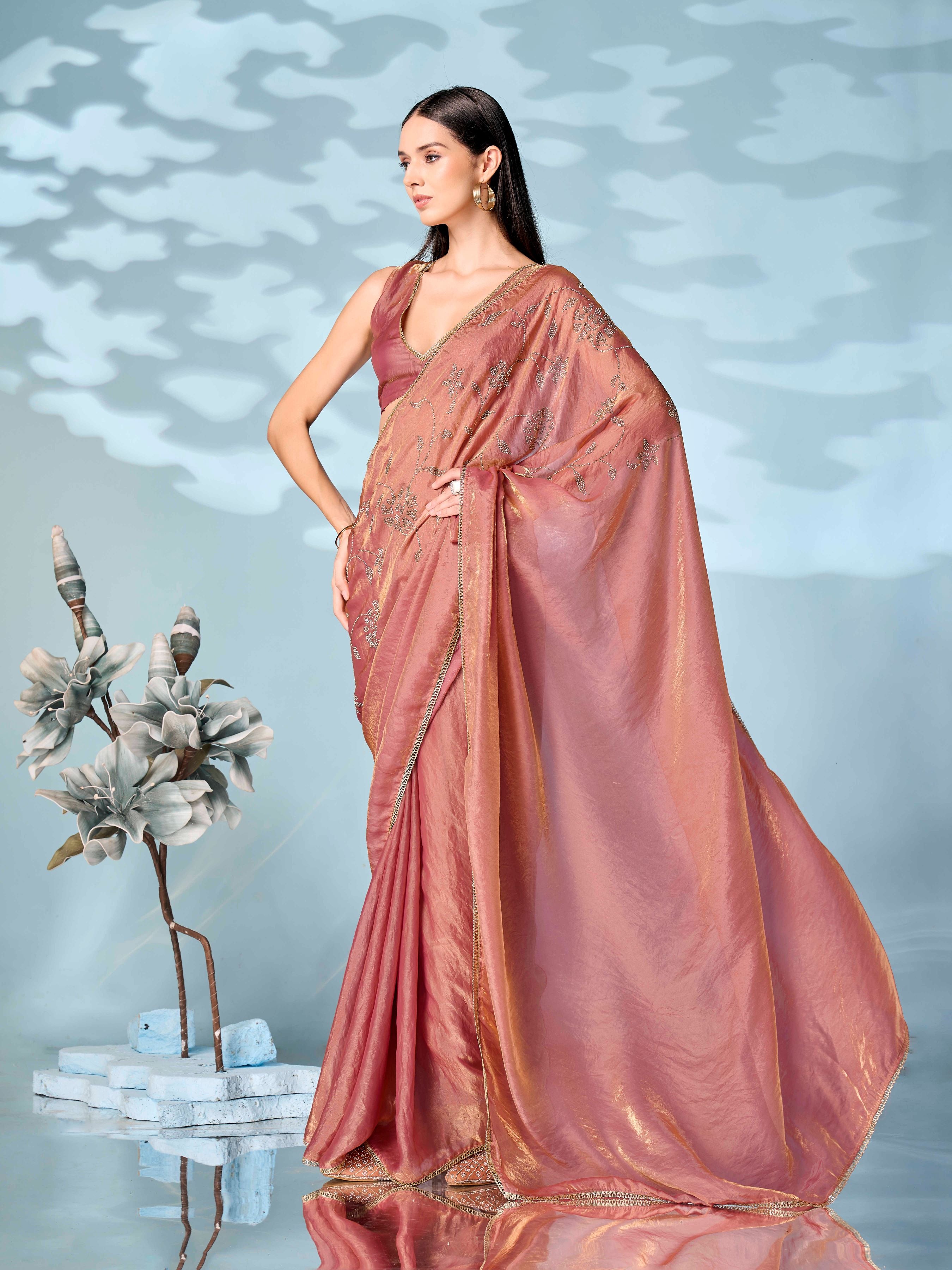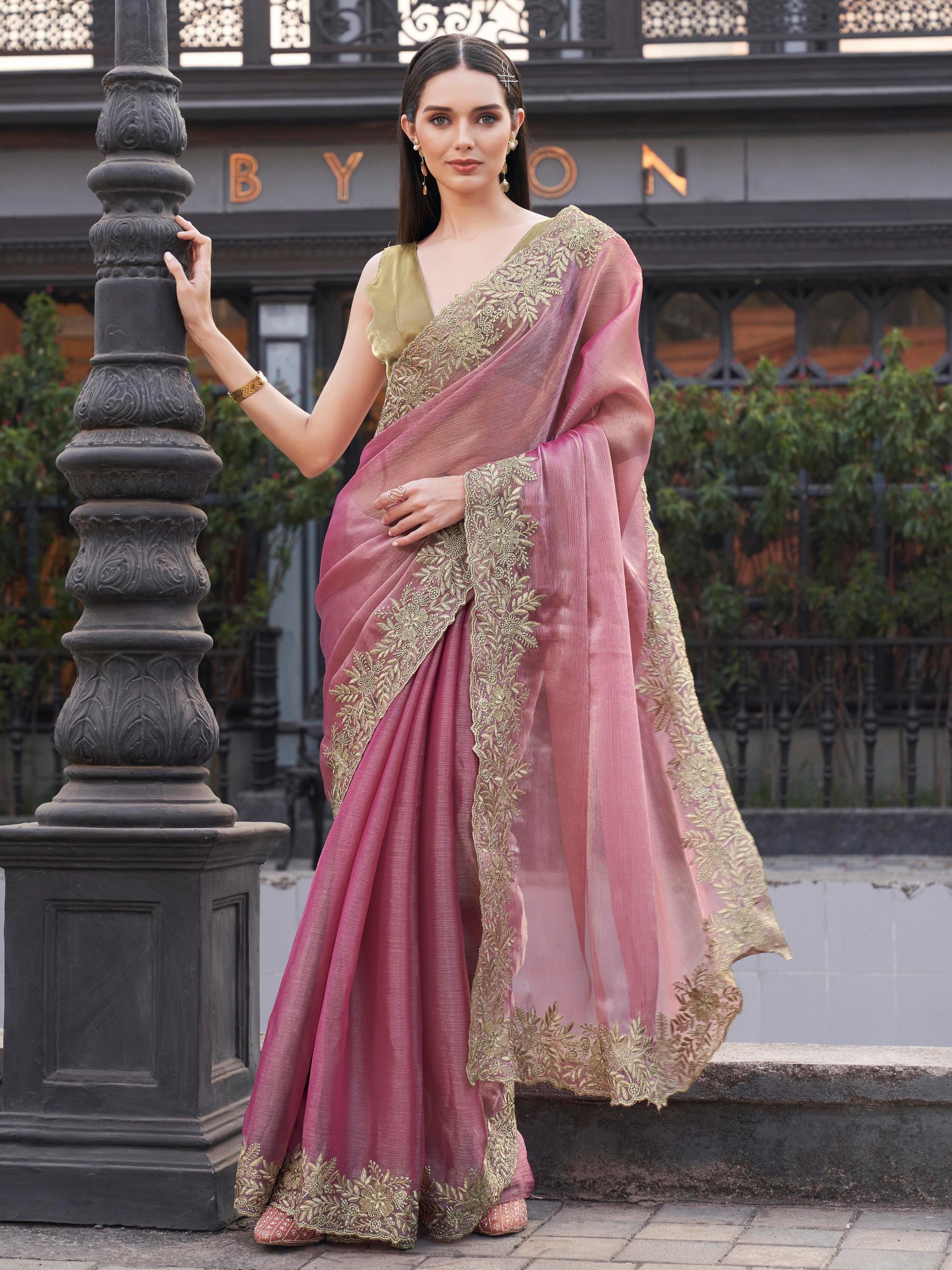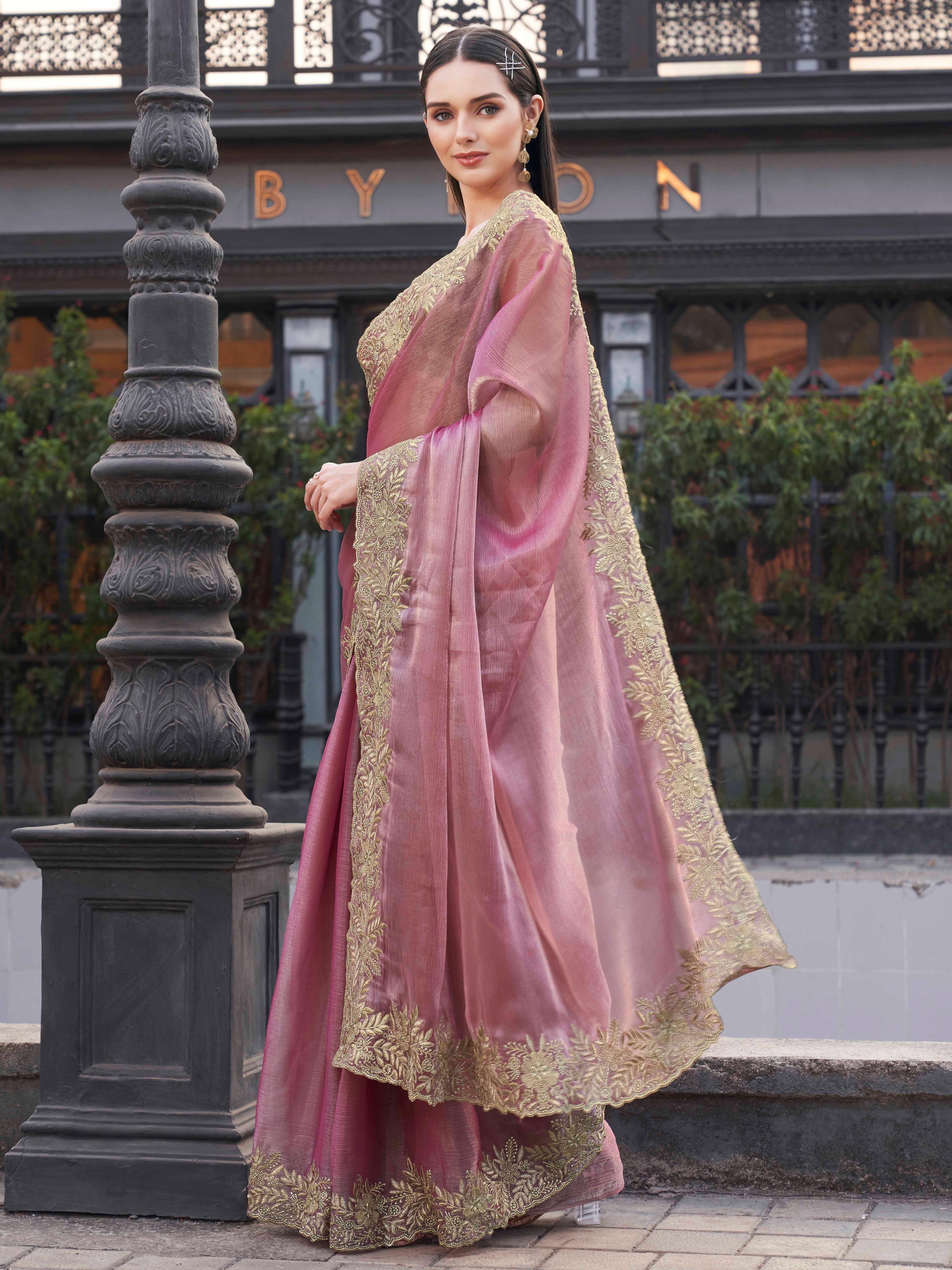 Pink colored two tone designer saree with swaroski work on shoulder portion and embellished lace
