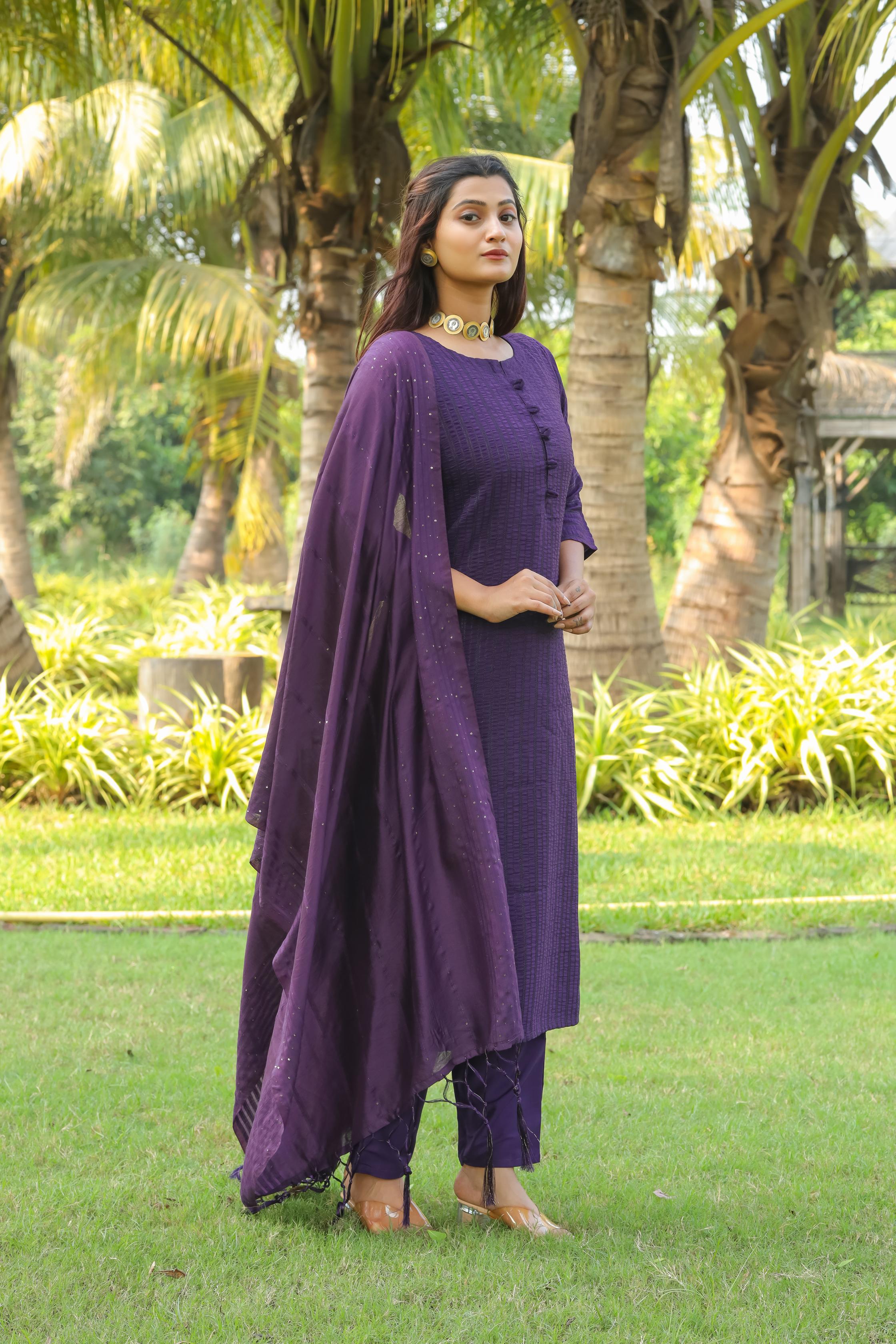 Purple Apple Cut Short Silk Blend Kurta Set With Tonal Embroidery