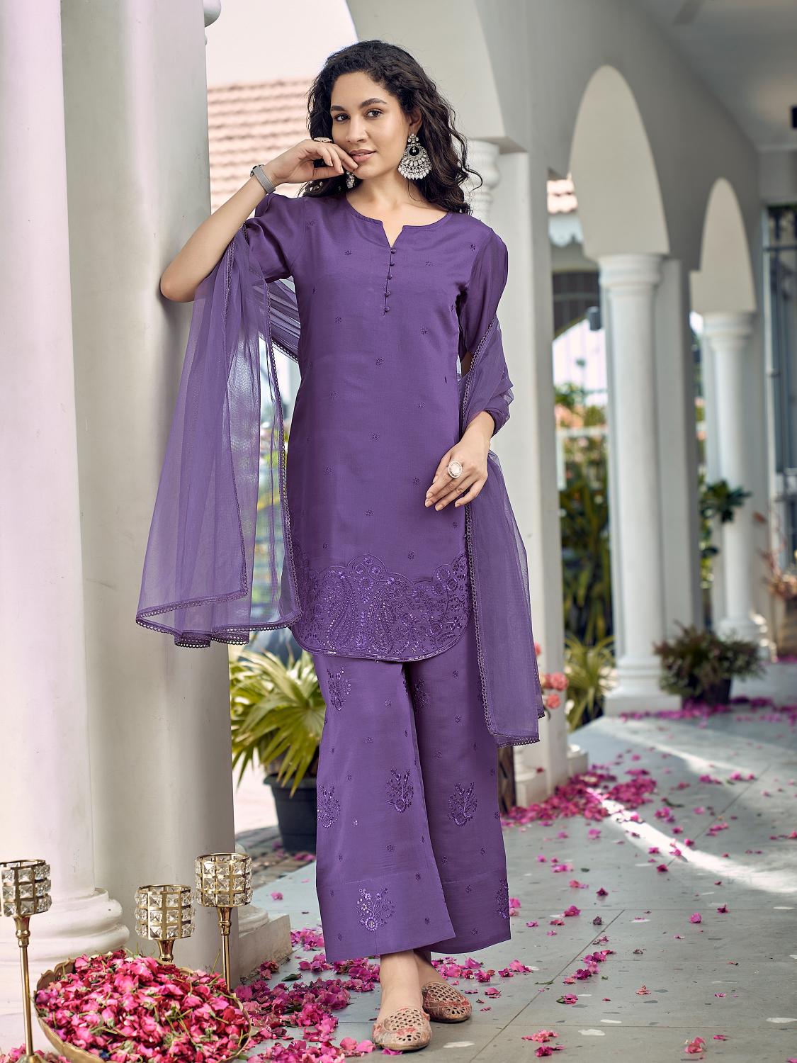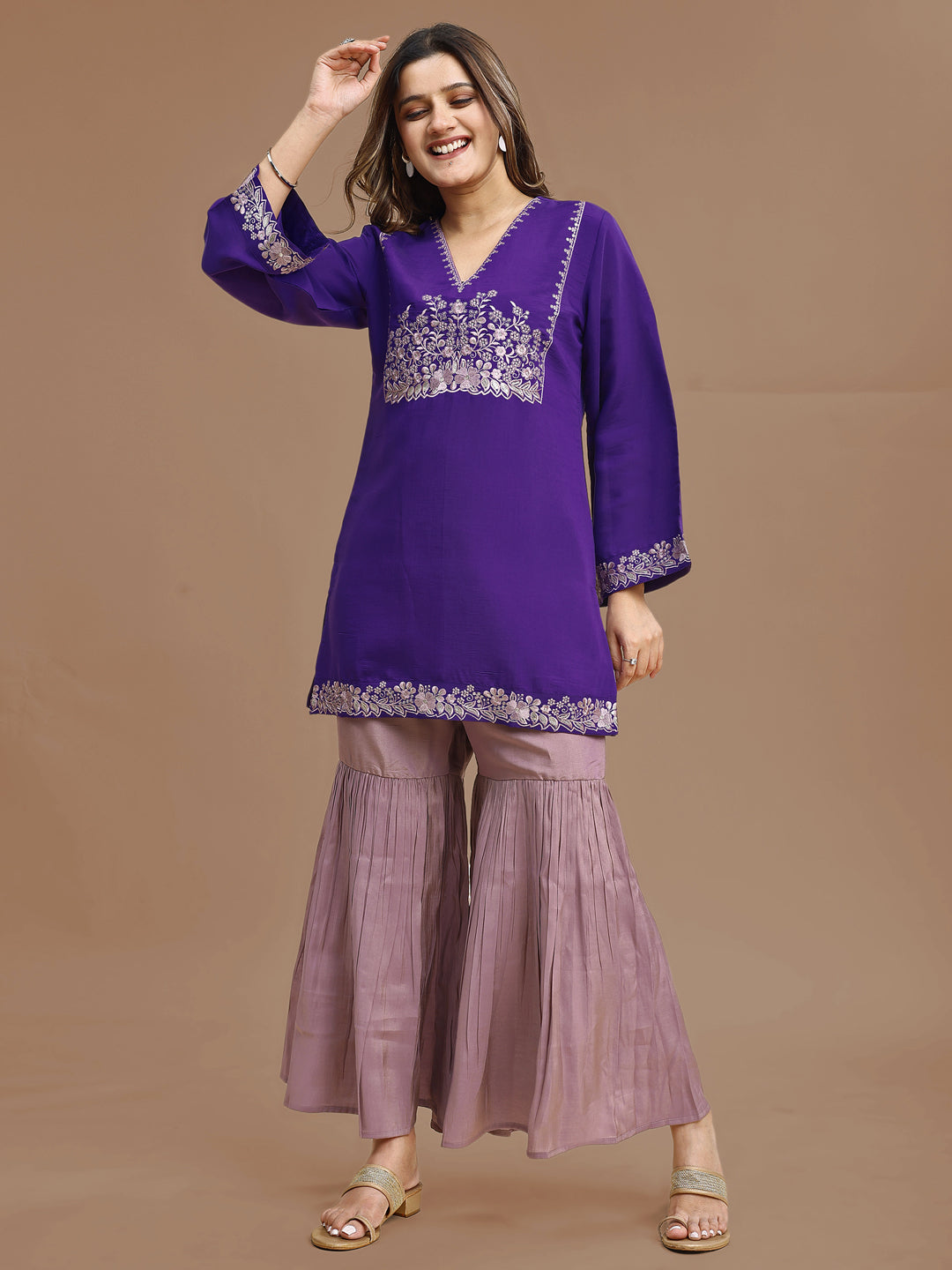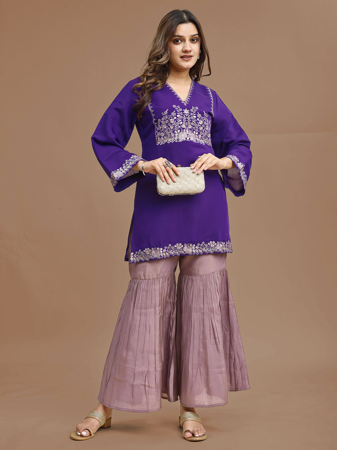 Purple Color Silk Blend Embroidered Top With Mauve Sharara