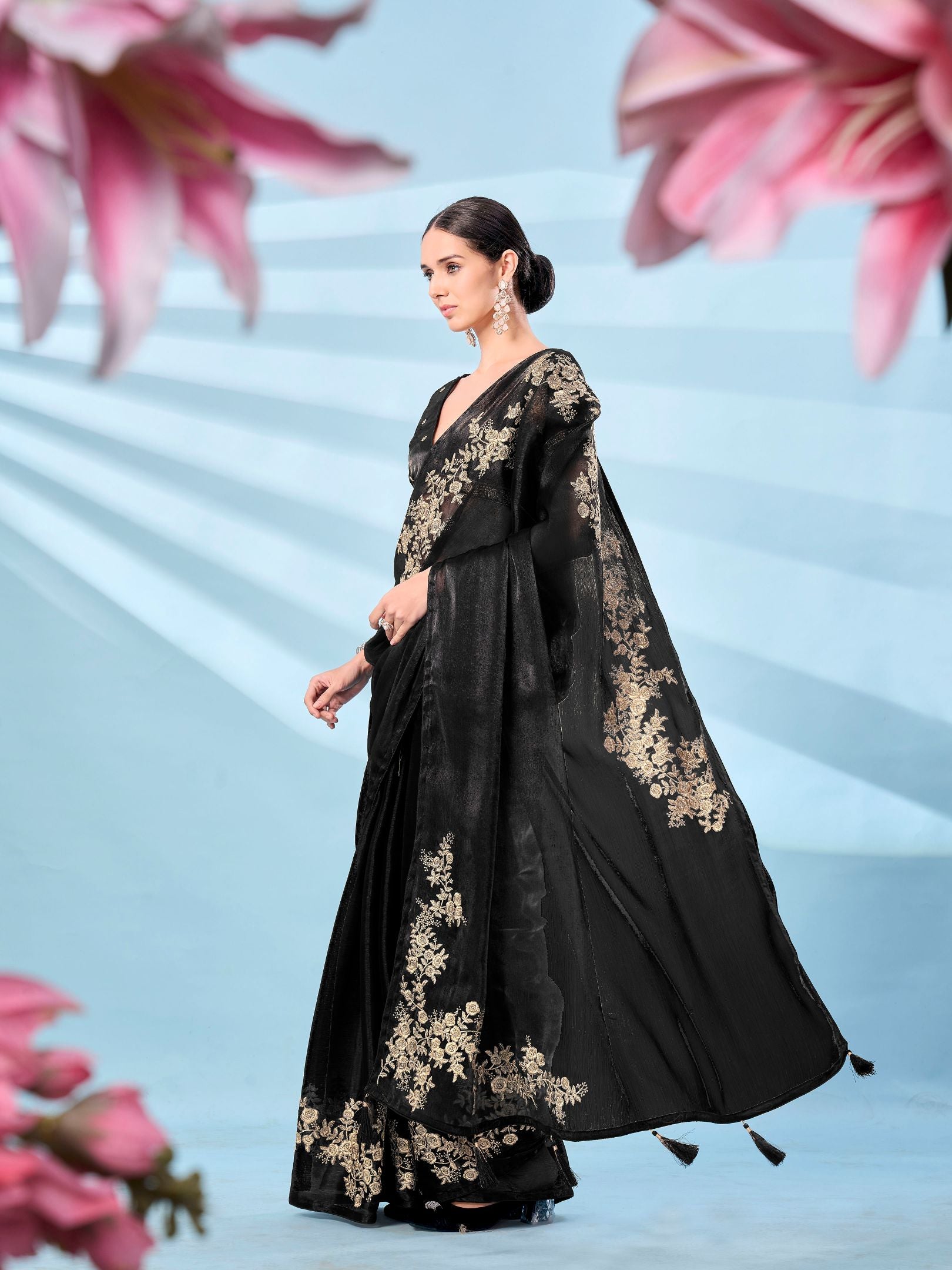 Black colored zari embroidered designer saree with tassles on pallu