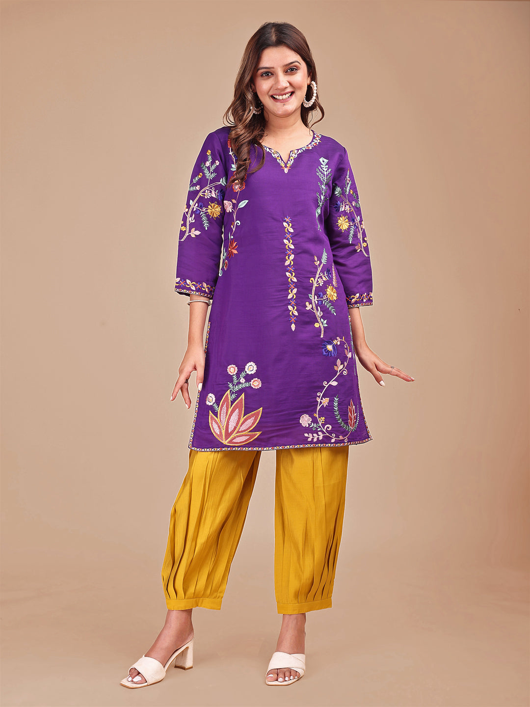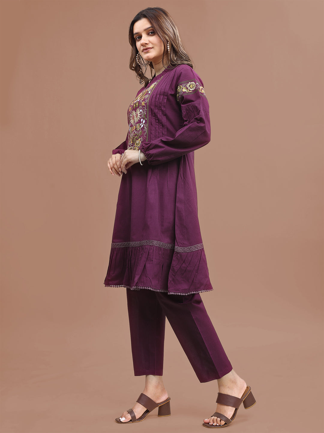 Purple Colored Pure Cotton Fit & Flair With Thread Work Embroidered Tunic & Trouser Co-ord Set