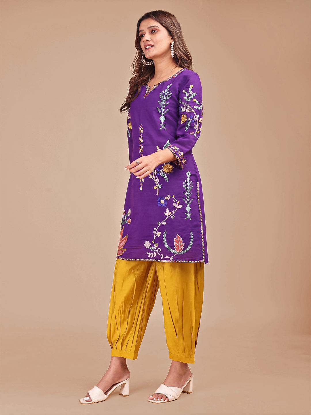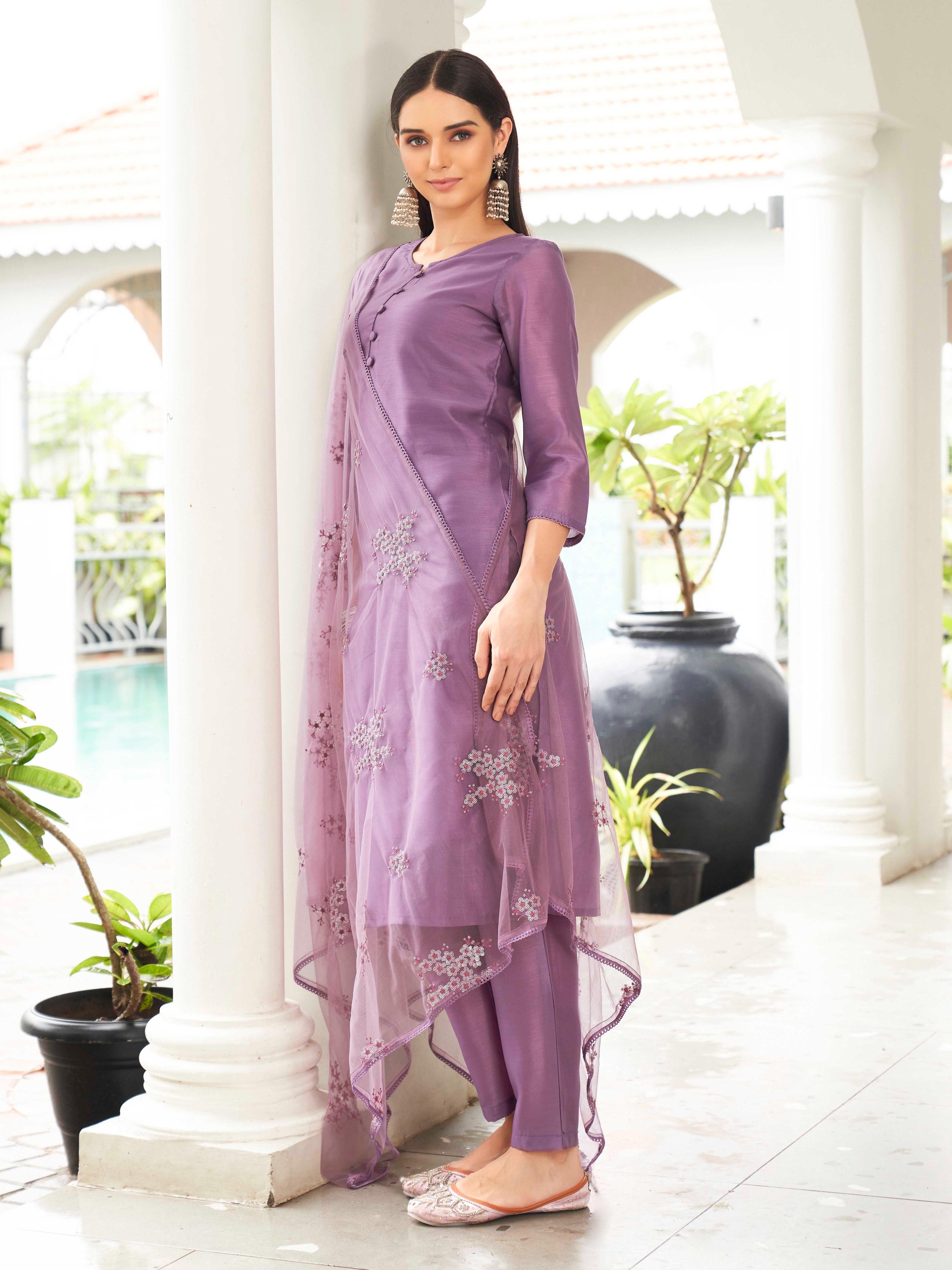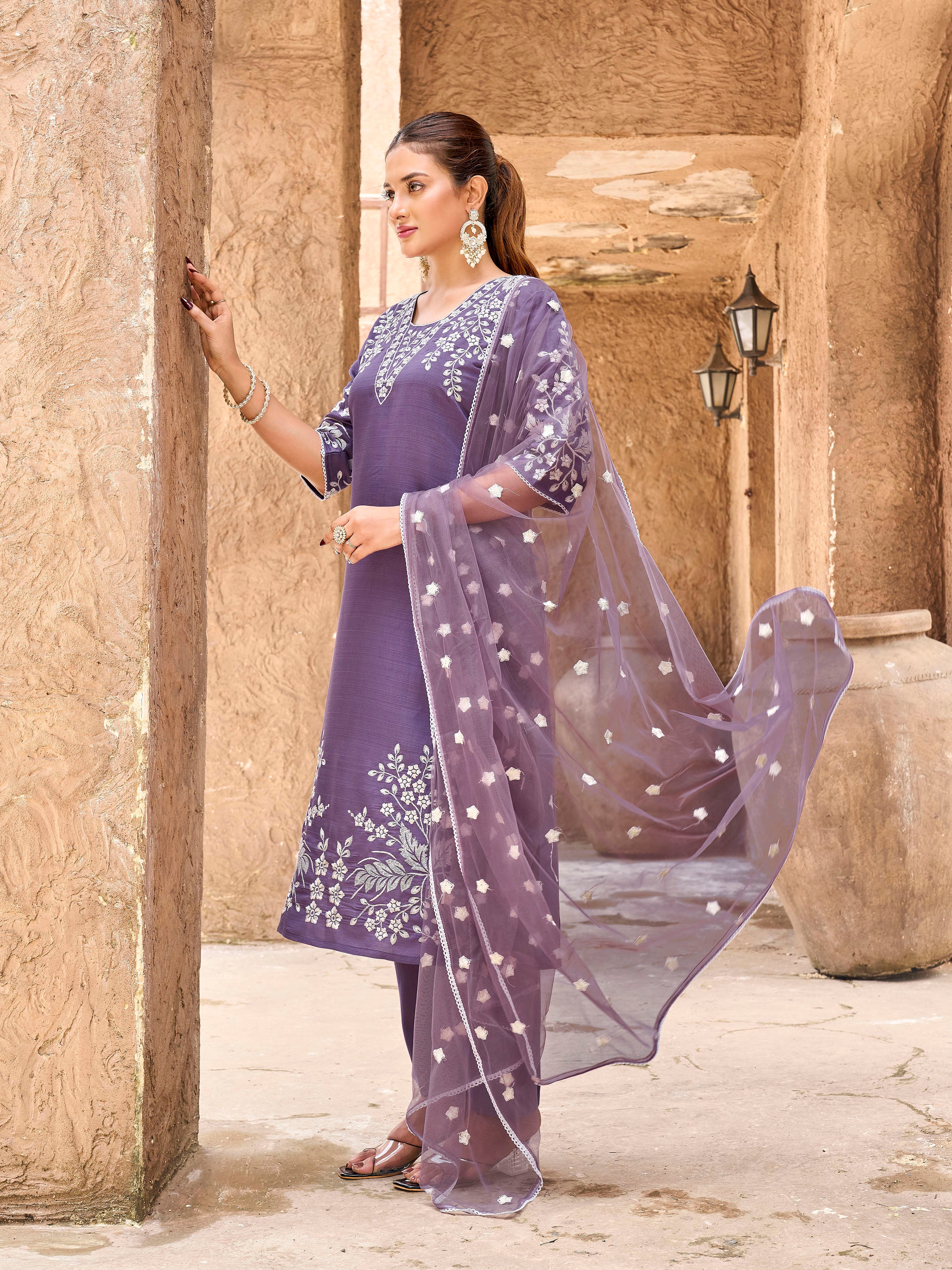 Purple color silk blend with off white thread embroidered kurta & trouser with dupatta set